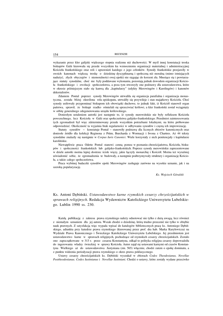154 RECENZJE wykazanie przez kler galijski wie˛kszego stopnia realizmu niż duchowości. W myśl innej konstatacji troska biskupów Galii kierowała sie˛ przede wszystkim ku wzmocnieniu organizacji materialnej i administracyjnej Kościoła frankońskiego oraz roli i uprawnień każdego z jego członków. Synody frankońskie przejawiły w swoich kanonach wie˛ksza˛ troske˛ o dziedzine˛ dyscyplinarna˛ i społeczna˛ niż moralna˛ (mimo istniejacych ˛ nadużyć, złych obyczajów i niemoralności owej epoki) nie sie˛gajac ˛ do korzeni zła. Mnożace ˛ sie˛ i powtarzajace ˛ statuty synodalne, choć nie były poddawane wykonaniu, pozostaja˛ jednak dowodem organizacji Kościoła frankońskiego i ewolucji społeczeństwa, a poza tym stworzyły one podstawy dla ustawodawstwa, które w okresie późniejszym stało sie˛ kanwa˛ dla „kapitularzy” (edykty Merowingów i Karolingów) i kanonów dekretalistów. Zdaniem Pontal poprzez synody Merowingów utrwaliła sie˛ organizcja parafialna i organizacja monastyczna, została bliżej określona rola episkopatu, utrwaliły sie˛ przywileje i stan majatkowy ˛ Kościoła. Choć synody usiłowały przypominać biskupom ich obowiazki ˛ duchowe, to jednak fakt, iż Kościół stanowił organ państwa, sprawił, że biskupi rzadko ośmielali sie˛ sprzeciwiać królowi, a kler frankoński został wciagnie ˛ ˛ ty w orbite˛ generalnego zdegenerowania urze˛du królewskiego. Doniosłym ustaleniem autorki jest naste˛pnie to, iż synody merowińskie nie były refleksem Kościoła powszechnego, lecz Kościoła w Galii oraz społeczeństwa galijsko-frankońskiego. Przedmiot zainteresowania tych zgromadzeń był wie˛c zdeterminowany przede wszystkim potrzebami lokalnymi, na które próbowano odpowiedzieć. Okoliczność ta wyjaśnia brak regularności w odbywaniu synodów i cze˛sta˛ ich improwizacje˛. Statuty synodów − konstatuje Pontal − stanowiły podstawe˛ dla licznych zbiorów kanonicznych oraz doniosłe źródło dla kolekcji Reginona z Prüm, Burcharda z Wormacji i Iwona z Chartres. Aż 44 teksty synodalne znalazły sie˛ naste˛pnie w Corpus Iuris Canonici. Wiele korzystały z nich penitencjały i kapitularze karolińskie. Niewatpliwie ˛ praca Odette Pontal stanowi cenna˛ pomoc w poznaniu chrześcijaństwa, Kościoła, biskupów i społeczności frankońskich lub galijsko-frankońskich. Poprzez synody merowińskie zaprezentowane w dziele autorki można lepiej dostrzec ścisłe wie˛zy, jakie łaczyły ˛ monarchie˛ i Kościół. Można też wyraźniej uświadomić sobie, że zgromadzenia te budowały, a naste˛pnie podtrzymywały struktury i organizacje˛ Kościoła, a także całego społeczeństwa. Praca wybitnej badaczki synodów epoki Merowingów zasługuje zarówno na wysokie uznanie, jak i na szeroka˛ popularyzacje˛. Ks. Wojciech Góralski Ks. Antoni De˛ biński. Ustawodawstwo karne rzymskich cesarzy chrześcijańskich w sprawach religijnych. Redakcja Wydawnictw Katolickiego Uniwersytetu Lubelskiego. Lublin 1990 ss. 230. Każda˛ publikacje˛ z zakresu prawa rzymskiego należy odnotować nie tylko z duża˛ uwaga,˛ lecz również z niemałym uznaniem dla jej autora. Wszak chodzi o dziedzine˛, która˛ trudno przecenić nie tylko w obre˛bie nauk prawnych. Z satysfakcja˛ wie˛c wypada wpisać do katalogów bibliotecznych prace˛ ks. Antoniego De˛bińskiego, adiunkta przy katedrze prawa rzymskiego (kierowanej przez prof. dra hab. Marka Kuryłowicza) na Wydziale Prawa Kanonicznego i Świeckiego Katolickiego Uniwersytetu Lubelskiego. Jej przedmiotem jest ustawodawstwo karne w sprawach religijnych, pochodzace ˛ od rzymskich cesarzy chrześcijańskich. Zostało ono zapoczatkowane ˛ w 313 r. przez cesarza Konstantyna, odkad ˛ to polityka religijna cesarzy doprowadziła do ingerowania władzy świeckiej w sprawy Kościoła. Autor zajał ˛ sie˛ ustawami karnymi od czasów Konstantyna Wielkiego aż do ustawodawstwa Justyniana (zm. 565) włacznie, ˛ chodzi zatem o epoke˛ dominatu, a z punktu widzenia periodyzacji prawa rzymskiego o okres prawa poklasycznego. Ustawy cesarzy chrześcijańskich ks. De˛biński wyszukał w zbiorach Codex Theodosianus, Novellae Posttheodosianae, Codex Iustinianus i Novellae Iustiniani. Chodzi o ustawy, które zostały wydane przeciwko RECENZJE 155 heretykom, apostatom, poganom i Żydom. Z uwagi na ich przedmiot i dziedzine˛ zostały one określone jako religijne; z uwagi natomiast na pochodzenie ustawy te należały do ustawodawstwa państwowego. Ich celem było przede wszystkim uniemożliwienie szerzenia błe˛dnej doktryny, a naste˛pnie ukaranie winnych. Najwie˛cej tego rodzaju ustaw w przebadanym przez Autora okresie pochodzi od Justyniana. Konstrukcja rozprawy obejmuje pie˛ć rozdziałów stanowiacych ˛ zwarta˛ i spójna˛ całość. W rozdziale pierwszym omawia sie˛ problematyke˛ religijna˛ w ustawodawstwie chrześcijańskich cesarzy rzymskich okresu dominatu. Autor prezentuje tutaj najpierw wspominane ustawy wydane w IV i V w., naste˛pnie ustawy zawarte w ustawodawstwie Justyniana, wreszcie ustawy karne w sprawach religijnych. W obre˛bie tych ostatnich czytelnik spotyka sie˛ z naste˛pujac ˛ a˛ systematyka: ˛ ustawy przeciwko heretykom, ustawy przeciwko apostatom, ustawy przeciwko poganom, ustawy przeciwko Żydom, ustawy zabraniajace ˛ udzielania i przyjmowania powtórnego chrztu, ustawa Walentyniana III i Teodozjusza II zabraniajaca ˛ rzeźbienia lub malowania krzyża (pod kara˛ śmierci). Interesujaco ˛ przedstawia sie˛ charakterystyka formalna ustaw karnych w sprawach religijnych. Autor informuje, iż były to edykty ogólne, dotyczace ˛ badź ˛ całego imperium, badź ˛ tylko jednej prowincji, miasta lub określonej grupy osób, wydawane w formie listów kierowanych z reguły do urze˛dników cesarskich, niekiedy zaś do danej społeczności (np. do określonego miasta, do Żydów). Redakcja tekstu ustaw pochodziła z kancelarii cesarza. Od ogłoszenia 