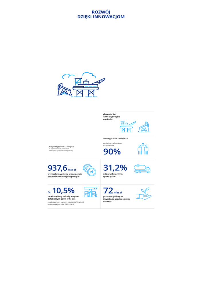 ROZWÓJ Nasza strategia biznesowa DZIĘKI INNOWACJOM W 2015 roku z sukcesem zakończyliśmy realizację Strategii biznesowej Grupy Kapitałowej LOTOS na lata 2011–2015. Zrealizowaliśmy kluczowe cele, które wyznaczyliśmy w tym dokumencie. Zwiększyliśmy potencjał produkcyjny i poprawiliśmy efektywność operacyjną. Umocniliśmy także pozycję na detalicznym rynku paliw. Proces ten odbywał się z poszanowaniem idei zrównoważonego rozwoju oraz społecznej odpowiedzialności biznesu, których założenia opisaliśmy w Strategii CSR na lata 2012–2015. Zobacz więcej Nagroda główna - 2 miejsce w ogólnopolskim konkursie na najlepszy raport zintegrowany Rozwój dzięki Rozwój dzięki innowacjom Projekty rozwojowe i innowacyjne są stałą częścią inwestycji podejmowanych przez Grupę Kapitałową LOTOS. Wpisane są w nasze biznesowe DNA, pozwalają nam maksymalizować zyski oraz budować wartość dla interesariuszy. Dzięki innowacyjnemu i elastycznemu podejściu, możemy skutecznie sprostać ambitnym wyzwaniom rynkowym, zwiększyć naszą konkurencyjność oraz zapewnić wysoką jakość produktów i usług we wszystkich segmentach naszej działalności. Zobacz więcej Dokonania Dokonania nansowe Konsekwentnie realizowana przez Grupę Kapitałową LOTOS w 2015 roku strategia zmierzająca do maksymalizacji marży zintegrowanej zaowocowała wzrostem potencjału produkcyjnego i lepszą efektywnością operacyjną, co przyczyniło się do osiągnięcia dobrych wyników na poziomie operacyjnym. Zobacz więcej Model budowy wartości W 2015 roku rozpoczęliśmy prace nad modelem budowy wartości Grupy Kapitałowej LOTOS i towarzyszącym mu sposobem prowadzenia biznesu. W modelu uwzględniliśmy potencjalne korzyści dla Grupy Kapitałowej LOTOS oraz jej interesariuszy, a także czynniki ich tworzenia. Korzyści generowane w ramach więcej niż jednego kapitału zostały zaprezentowane w modelu jednorazowo, poprzez przypisanie ich do kapitału, dla którego są najbardziej charakterystyczne. Z szerokiego spektrum wskaźników nansowych i poza nansowych wybraliśmy te, które w największym stopniu przyczyniają się do tworzenia wartości dla Grupy Kapitałowej LOTOS i jej otoczenia. NASZE KAPITAŁY KORZYŚCI NASZE WYNIKI 2015 Wybrane wskaźniki prezentujące stopień Dla Grupy Kapitałowej LOTOS Optymalizacja kosztów Poprawa rentowności Wzrost wiarygodności finansowej Wzrost zysku netto Zwiększenie marży Zdolność finansowania inwestycji rozwojowych Dla naszych interesariuszy Wpływy podatkowe na poziomie centralnym i lokalnym Przewidywalność kursu akcji i wartości firmy Zysk dla akcjonariuszy / dywidenda Wiarygodny i stabilny finansowo pożyczkobiorca Przychody: 22,7 mld zł Dług netto/oczyszczona EBITDA LIFO = 2,6; EV/EBITDA = 9,78 Nakłady inwestycyjne w okresie strategicznym 20112015: 4,2 mld zł Kurs akcji LOTOS na 31.12.2015: 27 zł, kapitalizacja: 5 mld zł Zobacz więcej Kapitał nansowy osiągania przez nas celów długoterminowych w poszczegółowych kapitałach. Kapitał nansowy to materialny zasób organizacji, rozumiany jako pula środków dostępnych w związku z funkcjonowaniem danej organizacji. Pojęcie odnosi się zarówno do dostępnego kapitału, jak i zadłużenia oraz możliwości jego nansowania. Jak tworzymy wartość w Grupie Kapitałowej LOTOS? Naszym nadrzędnym celem jest maksymalizacja wartości Grupy Kapitałowej LOTOS dla właścicieli. Aby ten cel osiągnąć, dbamy o optymalizację struktury kapitału przedsiębiorstwa, zarządzamy Spółką w sposób zapewniający jej płynność nansową i właściwy poziom zapasów operacyjnych. Wiemy, że maksymalizacja wartości przedsiębiorstwa dla jego właścicieli nie jest możliwa bez inwestycji, dlatego dbamy o zachowanie właściwego poziomu zarówno nakładów inwestycyjnych, jak również remontowych i odtworzeniowych. Zapewniamy naszym inwestycjom niezbędne nansowanie, mając przy tym na uwadze względy bezpieczeństwa i ochrony majątku przedsiębiorstwa. Ostatecznie podejmujemy starania ukierunkowane na maksymalizację wartości sprzedaży, w tym towarów wysokomarżowych. Dla Grupy Kapitałowej LOTOS Zapewnienie wysokiej jakości produktu Efektywne wykorzystanie infrastruktury Bezpieczna i stabilna produkcja Pozyskanie nowych i utrzymanie dotychczasowych klientów Ograniczanie poziomu ryzyka operacyjnego Dla naszych interesariuszy Dostępne produkty o oczekiwanej jakości Wiarygodny kontrahent i partner biznesowy Zapewnienie bezpieczeństwa w otoczeniu i w sąsiedztwie zakładów produkcyjnych Wydobycie ropy i gazu w ramach Grupy Kapitałowej LOTOS (poziom wydobycia uwzględnia produkcję roczną pakietu Sleipner zgodnie z efektywną datą transakcji 01.01.2015 r.): 10,4 mln boe Wielkość rezerw ropy i gazu w kategorii 2P w ramach Grupy Kapitałowej LOTOS: 66,8 mln boe Zobacz więcej Łączny przerób ropy: 10,2 mln ton Marża rafineryjna: 7,77 USD/bbl Udział w krajowym rynku paliw: 31,2% 10,5% udziałów w detalicznym rynku paliw płynnych w Polsce oraz 3. miejsce na krajowym rynku detalicznym wg POPiHN Zobacz więcej [1] [2] Kapitał produkcyjny Kapitał produkcyjny to materialny zasób organizacji, który w zależności od specy ki branży stanowią m.in budynki, sprzęt, maszyny, technologie, infrastruktura (np. drogi, mosty, oczyszczalnie wody czy ścieków) użytkowane i wykorzystywane w procesie produkcji dóbr i usług. Jak tworzymy wartość w Grupie Kapitałowej LOTOS? Optymalizacja oferty produktowej oraz rozwijanie sieci stacji paliw to cele, jakie stawiamy sobie jako przedsiębiorstwo. Nasz kapitał produkcyjny budujemy pozyskując nowe koncesje wydobywcze oraz efektywnie wykorzystując dotychczasowe. Otoczenie, w którym funkcjonujemy wymaga od nas aktywnego poszukiwania możliwości dywersy kacji dostaw ropy naftowej i innych surowców, pozwalając chociażby na zapewnienie elastyczności przerobowej. Dążymy do optymalizacji procesów produkcyjnych, w tym celu wdra