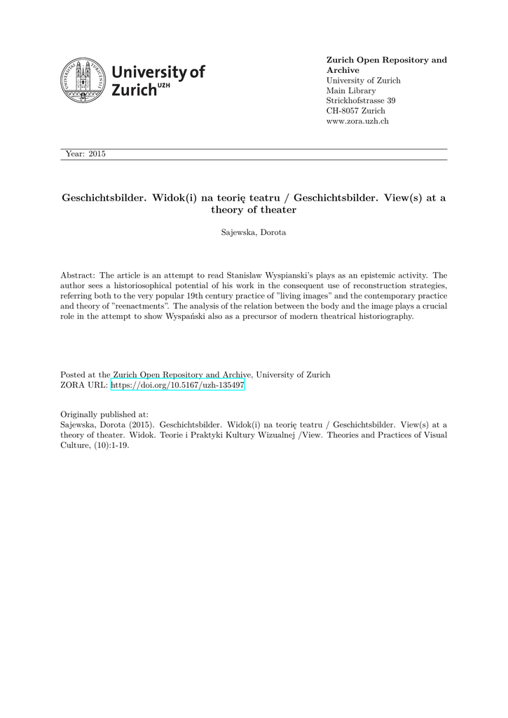 Zurich Open Repository and Archive University of Zurich Main Library Strickhofstrasse 39 CH-8057 Zurich www.zora.uzh.ch Year: 2015 Geschichtsbilder. Widok(i) na teorię teatru / Geschichtsbilder. View(s) at a theory of theater Sajewska, Dorota Abstract: The article is an attempt to read Stanislaw Wyspianski’s plays as an epistemic activity. The author sees a historiosophical potential of his work in the consequent use of reconstruction strategies, referring both to the very popular 19th century practice of ”living images” and the contemporary practice and theory of ”reenactments”. The analysis of the relation between the body and the image plays a crucial role in the attempt to show Wyspański also as a precursor of modern theatrical historiography. Posted at the Zurich Open Repository and Archive, University of Zurich ZORA URL: https://doi.org/10.5167/uzh-135497 Originally published at: Sajewska, Dorota (2015). Geschichtsbilder. Widok(i) na teorię teatru / Geschichtsbilder. View(s) at a theory of theater. Widok. Teorie i Praktyki Kultury Wizualnej /View. Theories and Practices of Visual Culture, (10):1-19. 10 tytuł: Geschichtsbilder. Widok(i) na teorię teatru autorka: Dorota Sajewska źródło: „Widok. Teorie i praktyki kultury wizualnej” 10 (2015) odsyłacz: http://pismowidok.org/index.php/one/article/view/279/588 wydawca: Instytut Badań Literackich PAN Instytut Kultury Polskiej UW Widok. Fundacja Kultury Wizualnej Dorota Sajewska Geschichtsbilder. Widok(i) na teorię teatru Drugiego maja 1897 roku Stanisław Wyspiański pisał w liście do Lucjana Rydla: „Pawlikowski obiecał mi wystawić Warszawiankę na przyszły sezon w październiku i dać ją razem z Intérieur Maeterlincka, 1 wszystko razem na dnie zaduszne” . Nietrudno się Afisz na odczyt Stanisława domyślić, że pomysł zestawienia politycznego dramatu Przybyszewskiego, połączony z o śmierci młodego powstańca z egzystencjalną sztuką przedstawieniem Maurycego o śmierci młodej dziewczyny wywołał u Wyspiańskiego ekscytację. Zachwycała go nie tylko perspektywa długo Maeterlincka Wnętrze (Dziewczynka za oknem), 1899. Muzeum Narodowe w Warszawie oczekiwanego debiutu scenicznego u boku uznanego już wówczas poety belgijskiego, ale przede wszystkim stojąca za wspólną inscenizacją tych utworów idea wyeksponowania podczas jednego seansu teatralnego fundamentalnej dla tekstu Wyspiańskiego i Maurice’a Maeterlincka – a zarazem dla teorii teatru – relacji między gestem a obrazem. Tadeusz Pawlikowski zrealizował swój pomysł dopiero w 1901 roku we Lwowie i to opacznie – umieszczając całe 2 wydarzenie w kontekście patriotycznym , jednak projekt ten – właśnie jako niezrealizowana idea – przetrwał w historii teatru dzięki scenicznej rekonstrukcji tej koncepcji przez Jerzego Grzegorzewskiego. Wystawiając wspólnie Wnętrze i Warszawiankę w 1976 roku w Teatrze im. S. Jaracza w Łodzi, reżyser sproblematyzował bowiem przede wszystkim relację między gestem a obrazem, czego scenicznym odzwierciedleniem stała się przestrzeń, podzielona na dwie części ogromnym oknem wspartym o dwie białe kolumny, utrzymane w klasycznej linii dziewiętnastowiecznej architektury. Umieszczając akcję Wnętrza za oknem, sytuację z Warszawianki rozgrywając natomiast na planie pierwszym, bezpośrednio na oczach widzów, Grzegorzewski, jak się wydaje, oparł swoje przedstawienie na trafnym rozpoznaniu, że oba dramaty stanowią rodzaj komplementarnych wobec siebie komentarzy do sytuacji teatralnej zredukowanej do działania i patrzenia. Wnętrze pokazuje umieszczony na granicy między sceną a widownią plan postaci (Starca i Obcego), posiadających wiedzę i komentujących zdarzenia pozasceniczne „Widok” 10 (2015) 1 / 18 Geschichtsbilder. Widok(i) na teorię teatru Dorota Sajewska oraz oglądane wspólne z widzami pantomimy postaci (Matki, Ojca, Dwóch Dziewczyn, Dziecka) znajdujących się na scenie w zamkniętej przestrzeni domu. W dramacie Maeterlincka obraz nie jest tożsamy wyłącznie z widzialnością, istnieją tu bowiem obrazy w całości zawarte również w słowach. W ten sposób wytwarza się porządek obrazów, który, jakby powiedział Jacques Zdjęcie ze spektaklu Jerzego Rancière, „inscenizuje relację między wypowiadalnym Grzegorzewskiego - scena z Wnętrza i widzialnym, relację odgrywającą ich analogię oraz ich Maurycego Maeterlincka, 1976, fot. 3 niepodobieństwo” , dzięki czemu scena teatralna staje się miejscem manifestacji, a zarazem gry różnic między Andrzej Brustman. Za: Encklopedia Teatru Polskiego dwiema tożsamościami – słowa i obrazu. Ich nieustanne przenikanie się zastępuje akcję dramatyczną, a właściwie prowadzi do fundamentalnego przekształcenia jej istoty – do jej ustatycznienia. W ten sposób problematyzacji podlega kategoria czasu, a przede wszystkim w odwróconym porządku zostaje przedstawiona relacja między czasem dramatycznym a czasem scenicznym – podczas gdy zwykle widzowie obcują ze skondensowanym na scenie czasem akcji (np. wiele lat w Kronikach Szekspira zostaje zredukowanych do kilku godzin w teatrze), to we Wnętrzu bardzo krótki czas dramatyczny (już widać tych, którzy nadchodzą, by poinformować zamkniętą we wnętrzu domu, pogrożoną w niewiedzy rodzinę o śmierci córki i siostry) zostaje bezwzględnie rozciągnięty, a tym samym niejako uprzestrzenniony. Tak oto dochodzi jednocześnie do rozsunięcia historii i rozsunięcia przestrzeni, a zatem, jak sformułował to Jean-Luc Nancy, do „przestrzennienia – 4 czasu, co znaczy, że trzeba pomyśleć czas jako ciało” . Ciałem tym we Wnętrzu Maeterlincka staje się widz jako świadek trwania akcji w jej zatrzymaniu, rozumiany jednak nie jako bierny obserwator, lecz jako aktywny podmiot, „widz wyemancypowany”, który przekracza opozycję między patrzeniem a działaniem poprzez uświadomienie sobie własnej pozycji jako uczestnika układu w