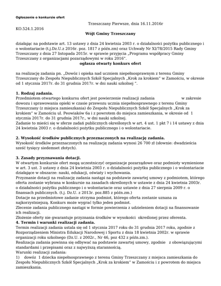 Ogłoszenie o konkursie ofert Trzeszczany Pierwsze, dnia 16.11.2016r KO.524.1.2016 Wójt Gminy Trzeszczany działając na podstawie art. 13 ustawy z dnia 24 kwietnia 2003 r. o działalności pożytku publicznego i o wolontariacie (t.j.Dz.U.z 2016r. poz. 1817 z późn.zm) oraz Uchwały Nr XI/78/2015 Rady Gminy Trzeszczany z dnia 27 listopada 2015r. w sprawie przyjęcia „Programu współpracy Gminy Trzeszczany z organizacjami pozarządowymi w roku 2016”. ogłasza otwarty konkurs ofert na realizację zadania pn. „Dowóz i opieka nad uczniem niepełnosprawnym z terenu Gminy Trzeszczany do Zespołu Niepublicznych Szkół Specjalnych „Krok za krokiem” w Zamościu, w okresie od 1 stycznia 2017r. do 31 grudnia 2017r. w dni nauki szkolnej ”. 1. Rodzaj zadania. Przedmiotem otwartego konkursu ofert jest powierzenie realizacji zadania w zakresie dowozu i sprawowania opieki w czasie przewozu ucznia niepełnosprawnego z terenu Gminy Trzeszczany (z miejsca zamieszkania) do Zespołu Niepublicznych Szkół Specjalnych „Krok za krokiem” w Zamościu ul. Peowiaków 6a i z powrotem do miejsca zamieszkania, w okresie od 1 stycznia 2017r. do 31 grudnia 2017r., w dni nauki szkolnej. Zadanie to mieści się w sferze zadań publicznych określonych w art. 4 ust. 1 pkt 7 i 14 ustawy z dnia 24 kwietnia 2003 r. o działalności pożytku publicznego i o wolontariacie. 2. Wysokość środków publicznych przeznaczonych na realizację zadania. Wysokość środków przeznaczonych na realizację zadania wynosi 26 700 zł (słownie: dwadzieścia sześć tysięcy siedemset złotych). 3. Zasady przyznawania dotacji. W otwartym konkursie ofert mogą uczestniczyć organizacje pozarządowe oraz podmioty wymienione w art. 3 ust. 3 ustawy z dnia 24 kwietnia 2003 r. o działalności pożytku publicznego i o wolontariacie działające w obszarze: nauki, edukacji, oświaty i wychowania. Przyznanie dotacji na realizację zadania nastąpi na podstawie zawartej umowy z podmiotem, którego oferta zostanie wybrana w konkursie na zasadach określonych w ustawie z dnia 24 kwietnia 2003r. o działalności pożytku publicznego i o wolontariacie oraz ustawie z dnia 27 sierpnia 2009 r. o finansach publicznych. (t.j. Dz.U. z 2013r. poz.885 z późn.zm.) Dotacje na przedmiotowe zadanie otrzyma podmiot, którego oferta zostanie uznana za najkorzystniejszą. Konkurs może wygrać tylko jeden podmiot. Zlecenie zadania publicznego nastąpi w formie powierzenia z udzieleniem dotacji na finansowanie ich realizacji. Złożenie oferty nie gwarantuje przyznania środków w wysokości określonej przez oferenta. 4. Termin i warunki realizacji zadania. Termin realizacji zadania ustala się od 1 stycznia 2017 roku do 31 grudnia 2017 roku, zgodnie z Rozporządzeniem Ministra Edukacji Narodowej i Sportu z dnia 18 kwietnia 2002r. w sprawie organizacji roku szkolnego (Dz.U. z 2002r., Nr 46, poz 432 z późn.zm.). Realizacja zadania powinna się odbywać na podstawie zawartej umowy, zgodnie z obowiązującymi standardami i przepisami oraz z najwyższą starannością. Warunki realizacji zadania: 1) dowóz 1 dziecka niepełnosprawnego z terenu Gminy Trzeszczany z miejsca zamieszkania do Zespołu Niepublicznych Szkół Specjalnych „Krok za krokiem” w Zamościu i z powrotem do miejsca zamieszkania. Dowóz ucznia odbywać się może tylko środkiem transportu przystosowanym do przewozu osób niepełnosprawnych (wózków inwalidzkich). W czasie przewozu przewoźnik zobowiązany jest do zapewnienia stałej i wykwalifikowanej opieki nad dzieckiem. Kierowca nie może jednocześnie sprawować opieki nad dzieckiem. W roku 2017 planuje się dowóz jednego dziecka z miejscowości Bogucice. 5. Termin składania ofert. Ofertę należy złożyć w zamkniętej kopercie w Sekretariacie Urzędu Gminy Trzeszczany (pokój nr 6) lub przesłać pocztą na adres: Urząd Gminy Trzeszczany Trzeszczany Pierwsze 194 22-554 Trzeszczany z dopiskiem „ Konkurs – dowóz ucznia niepełnosprawnego do Zamościa w 2017r.” - w terminie do dnia 5 grudnia 2016r. do godz. 900 . 6. Tryb i kryteria stosowane przy dokonywaniu wyboru oferty oraz termin dokonania wyboru ofert. Oferta powinna być złożona według wzoru określonego w Rozporządzeniu Ministra Rodziny, Pracy i Polityki Społecznej z dnia 17 sierpnia 2016 r. w sprawie wzorów ofert i ramowych wzorów umów dotyczących realizacji zadania publicznego oraz wzorów sprawozdań z wykonania tych zadań (Dz.U. z 2016 r. poz. 1300). Przy wyborze będą brane pod uwagę tylko oferty złożone zgodnie z wzorem. Oferta powinna być podpisana przez osobę lub osoby do tego uprawnione, wyszczególnione w odpowiednim dokumencie potwierdzającym ich uprawnienia. Do oferty należy dołączyć: a) kopię aktualnego odpisu z Krajowego Rejestru Sądowego, innego rejestru lub ewidencji, b) kopię statutu. Oferta powinna spełniać wymogi art. 14 ustawy o pożytku publicznym i wolontariacie. Złożone oferty będą weryfikowane przez Komisję Konkursową powołaną przez Wójta Gminy Trzeszczany. W przypadku negatywnej weryfikacji składający ofertę zostanie o tym fakcie powiadomiony. Oferty oceniane będą pod względem formalnym, czyli poprawności wypełnienia oferty i kompletności załączników, a także pod względem merytorycznym wg następujących kryteriów: 1) ocena możliwości realizacji zadania publicznego przez organizację pozarządową lub podmioty wymienione w art. 3 ust. 3; 2) ocena przedstawionej kalkulacji kosztów realizacji zadania publicznego, w tym w odniesieniu do zakresu rzeczowego zadania 3) ocena proponowanej jakości wykonania zadania i kwalifikacje osób, przy udziale których organizacja pozarządowa lub podmioty określone w art. 3 ust. 3 będą realizować zadanie publiczne; 4) w przypadku, o którym mowa w art. 5 ust. 4 pkt 2, uwzględnienie planowanego przez organizację pozarządową lub podmioty wymienione w art. 3 ust. 3 udziału środków finansowych własnych lub środków pochodzących z inn