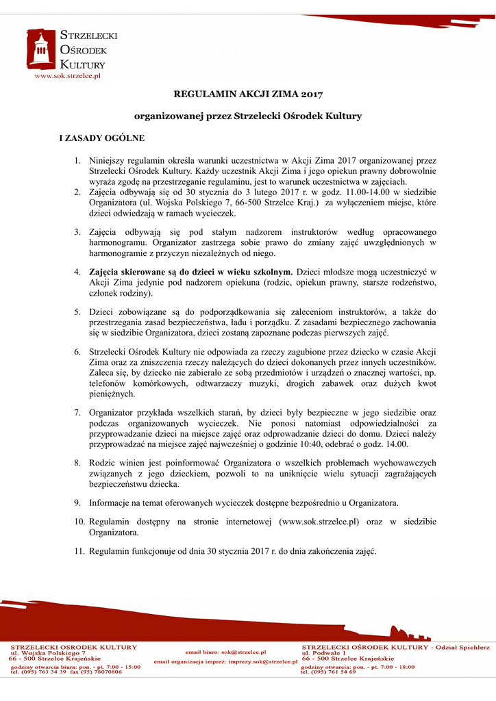 REGULAMIN AKCJI ZIMA 2017 organizowanej przez Strzelecki Ośrodek Kultury I ZASADY OGÓLNE 1. Niniejszy regulamin określa warunki uczestnictwa w Akcji Zima 2017 organizowanej przez Strzelecki Ośrodek Kultury. Każdy uczestnik Akcji Zima i jego opiekun prawny dobrowolnie wyraża zgodę na przestrzeganie regulaminu, jest to warunek uczestnictwa w zajęciach. 2. Zajęcia odbywają się od 30 stycznia do 3 lutego 2017 r. w godz. 11.00-14.00 w siedzibie Organizatora (ul. Wojska Polskiego 7, 66-500 Strzelce Kraj.) za wyłączeniem miejsc, które dzieci odwiedzają w ramach wycieczek. 3. Zajęcia odbywają się pod stałym nadzorem instruktorów według opracowanego harmonogramu. Organizator zastrzega sobie prawo do zmiany zajęć uwzględnionych w harmonogramie z przyczyn niezależnych od niego. 4. Zajęcia skierowane są do dzieci w wieku szkolnym. Dzieci młodsze mogą uczestniczyć w Akcji Zima jedynie pod nadzorem opiekuna (rodzic, opiekun prawny, starsze rodzeństwo, członek rodziny). 5. Dzieci zobowiązane są do podporządkowania się zaleceniom instruktorów, a także do przestrzegania zasad bezpieczeństwa, ładu i porządku. Z zasadami bezpiecznego zachowania się w siedzibie Organizatora, dzieci zostaną zapoznane podczas pierwszych zajęć. 6. Strzelecki Ośrodek Kultury nie odpowiada za rzeczy zagubione przez dziecko w czasie Akcji Zima oraz za zniszczenia rzeczy należących do dzieci dokonanych przez innych uczestników. Zaleca się, by dziecko nie zabierało ze sobą przedmiotów i urządzeń o znacznej wartości, np. telefonów komórkowych, odtwarzaczy muzyki, drogich zabawek oraz dużych kwot pieniężnych. 7. Organizator przykłada wszelkich starań, by dzieci były bezpieczne w jego siedzibie oraz podczas organizowanych wycieczek. Nie ponosi natomiast odpowiedzialności za przyprowadzanie dzieci na miejsce zajęć oraz odprowadzanie dzieci do domu. Dzieci należy przyprowadzać na miejsce zajęć najwcześniej o godzinie 10:40, odebrać o godz. 14.00. 8. Rodzic winien jest poinformować Organizatora o wszelkich problemach wychowawczych związanych z jego dzieckiem, pozwoli to na uniknięcie wielu sytuacji zagrażających bezpieczeństwu dziecka. 9. Informacje na temat oferowanych wycieczek dostępne bezpośrednio u Organizatora. 10. Regulamin dostępny na stronie internetowej (www.sok.strzelce.pl) oraz w siedzibie Organizatora. 11. Regulamin funkcjonuje od dnia 30 stycznia 2017 r. do dnia zakończenia zajęć.