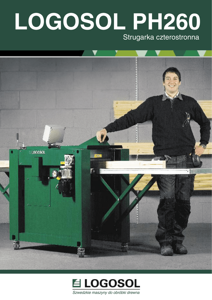 LOGOSOL PH260 Strugarka czterostronna Szwedzkie maszyny do obróbki drewna STRUGANIE STABILNOŚĆ�� Wykonuje wszystko podczas jednej operacji ! Czterostronna strugarka PH260 wygładza i profiluje z czterech stron jednocześnie, spełniając przy tym wysokie wymagania co do jakości strugania i tempa pracy. Jedyną różnicą pomiędzy strugarką PH260 a tradycyjnymi strugarkami wielostronnymi jest umiejscowienie głowic poziomych. Znajdują się one na początku i końcu maszyny. Takie umiejscowienie zapewnia nadzwyczajną stabilność nawet wtedy, gdy zachodzi konieczność używania bardzo szerokich noży. Dolna głowica, oraz boczne, zamontowe są na solidnym żeliwnym stole, którego powierzchnia charakteryzuje się niskim współczynnikiem tarcia. Konstrukcja strugarki wykonana jest z 4mm grubości stalowej blachy. STRUGANIE POWIERZCHNIA Gładka jak to tylko możliwe ! Powierzchnia obrobionego na strugarce PH260 materiału, prezentuje się tak jak gdyby wykonana była na drogiej przemysłowej maszynie. Jedyną przewagą droższej maszyny przemysłowej jest jej prędkość. Przy pomocy strugarki PH260 możesz obrabiać około 500 metrów metriału na godzinę. Pięć wałków prowadzących, umieszczonych blisko głowic, zapewnia doskonałe prowadzenie. Ciężki stół roboczy, redukujący wibracje, oraz bezstopniowa regulacja prędkości gwarantują wysoką jakość produktu finalnego. STRUGANIE Na dzień dzisiejszy strugarki PH260 używane są w: • Tartakach, których obróbka końcowa jest uzupełnieniem oferty. • Zakładach stolarskich. • Składach, które wytwarzają i sprzedają swoje własne wyroby. • Firmach budowlanych. • Małych rodzinnych firmach. • Rolnictwie i leśnictwie. • Przemyśle, wykorzystującym materiały plastyczne, płyty MDF itp. ZŁOTO Wyrafinowanie drewna przynosi zysk! Wielu z naszych klientów używa strugarek tylko do własnych potrzeb. Niektórzy zakładają małe spółki i sprzedają wytworzone przez siebie wyroby na lokalnych rynkach. Przy odpowiednim wykorzystaniu możliwości strugarki PH260 koszty zakupu i utrzymania bardzo szybko się zwracają. Największą grupą klientów, są małe zakłady stolarskie oraz składy oferujące materiały dla stolarzy. Maszyna jest dobrze przstosowana do produkcji krótkich serii. Bardzo łatwo można zmienić noże profilujące. STRUGANIE PROFILE Szeroki wybór profili! Możesz wybierać z pośród szerokiej gamy standardowych noży profilujących. Możesz stworzyć swój własny niepowtarzalny wzór. Zaprojektuj go i prześlij do nas, a my zrobimy go dla Ciebie! Możliwści głowic są zdumiewające. Wymiana noży profifujących jest bardzo łatwa. Mogą wycinać piękne głębokie profile nawet wtedy, gdy obrabiany materiał będzie krzywy lub niskiej jakości. Łatwe ustawianie. Podziałka wyskalowana co 0.1 mm. Każdy z pięciu silników uruchamiany oddzielnie. Średnica wrzecion 30 mm. Czas montażu 10-20 min. Bezstopniowa regulacja prędkości posuwu. 6000 obr/min zapewnia gładką powierzchnię Łatwe ustawianie. Podziałka wyskalowana co 0.1 mm. Obserwacja procesu obróbki przez okno w górne pokrywie Szeroka gama noży profilujących. Czterostronna strugarka PH260 Panel sterujący Każdy z pięciu silników uruchamiany oddzielnie Okno Obserwacja całego procesu obróbki. Regulacja prędkości Dostępna w dwóch wariantach 2-12 m/min lub 4-24 m/min. Łatwe ustawianie Przyjazna użytkownikowi podziałka wyskalowana co 0.1 mm. Stoły (opcja) Zrobione z jednego arkusza blachy. DANE TECHNICZNE STRUGANIE 4 STRONNE Wysokość: 10-100 mm Szerokość: 15-260 mm STRUGANIE 2 STRONNE Wysokość: 10-230 mm Szerokość: 300 mm Głowica górna Średnica: 72 mm Szerokość: 410 mm Moc silnika: 3 kW Liczba obrotów: 6000 obr/min Głębokość strugania: max. 8 mm Głębokość profilowania: max.10 mm Głowica dolna Średnica: Szerokość: 72 mm 410 mm Moc silnika: 3 kW Liczba obrotów: 6000 obr/min Głębokość strugania: 0-4 mm Głębokość profilowania: 5 mm Głowice boczne Średnica wrzeciona: 30 mm Wysokość: max.100 mm Średnica: max.140 mm Moc silnika: 3 kW Liczba obrotów: 6000 obr/min Głębokość profilowania: max.30 mm Standardowe głowice boczne Typ: TB90 Średnica: 90 mm Wysokość: 40 mm Posuw Moc silnika: Prędkość posuwu standard: opcja: 0,18 kW 2-12 m/min 4-24 m/min System elektryczny Zabezpieczenie przeciwwilgociowe: IP54 Moc całkowita: 12,2 kW Zasilanie: 3-fazy, 380 V, 16A Wymiary Długość: Szerokość: Wysokość: Waga: 1100 mm 900 mm 970 mm 370 kg Więcej informacji dostepnych na naszej stronie: www.logosol.pl Szwedzkie maszyny do obróbki drewna FHU LOGOS ul.Mickiewicza 11 67-100 Nowa Sól tel/fax (068) 387 43 80 tel.kom. 0604 90 77 04 e-mail: [email protected] Dzięki produktom Logosol możesz tworzyć profile jakie tylko zapragniesz. Możesz otworzyć własną działalność gospodarczą i być szefem dla samego siebie ! Oferujemy urządzenia zaspokajające potrzeby naszych klientów i dające się łatwo rozbudowywać. Już w podstawowa konfiguracja maszyn oferuje użytkownikowi szeroki zakres możliwości. Jesteśmy dumni z tego, że produkty Logosol bardzo często Wybierając Logosol masz gwarancję, że zawsze stawiane są jako wzór w porównaniach z innymi otrzymujesz produkty najwyższej jakości. producentami! Jesteśmy pewni naszych produktów w 100%! Logosol - Światowy lider produkcji maszyn do obróbki drewna na małą skalę