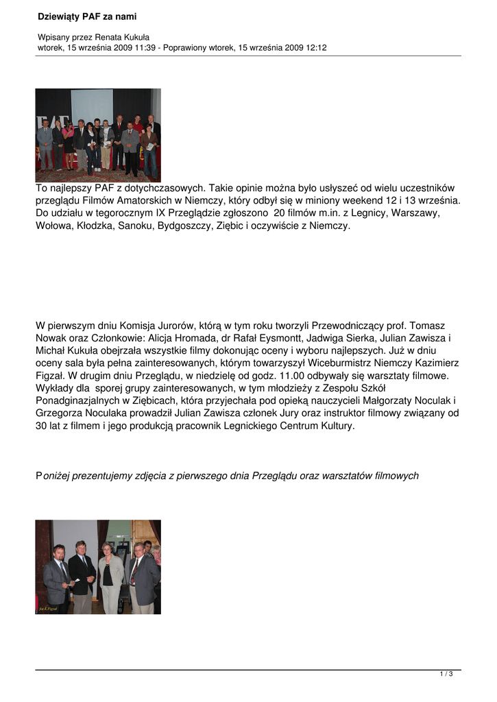 Dziewiąty PAF za nami Wpisany przez Renata Kukuła wtorek, 15 września 2009 11:39 - Poprawiony wtorek, 15 września 2009 12:12 To najlepszy PAF z dotychczasowych. Takie opinie można było usłyszeć od wielu uczestników przeglądu Filmów Amatorskich w Niemczy, który odbył się w miniony weekend 12 i 13 września. Do udziału w tegorocznym IX Przeglądzie zgłoszono 20 filmów m.in. z Legnicy, Warszawy, Wołowa, Kłodzka, Sanoku, Bydgoszczy, Ziębic i oczywiście z Niemczy. W pierwszym dniu Komisja Jurorów, którą w tym roku tworzyli Przewodniczący prof. Tomasz Nowak oraz Członkowie: Alicja Hromada, dr Rafał Eysmontt, Jadwiga Sierka, Julian Zawisza i Michał Kukuła obejrzała wszystkie filmy dokonując oceny i wyboru najlepszych. Już w dniu oceny sala była pełna zainteresowanych, którym towarzyszył Wiceburmistrz Niemczy Kazimierz Figzał. W drugim dniu Przeglądu, w niedzielę od godz. 11.00 odbywały się warsztaty filmowe. Wykłady dla sporej grupy zainteresowanych, w tym młodzieży z Zespołu Szkół Ponadginazjalnych w Ziębicach, która przyjechała pod opieką nauczycieli Małgorzaty Noculak i Grzegorza Noculaka prowadził Julian Zawisza członek Jury oraz instruktor filmowy związany od 30 lat z filmem i jego produkcją pracownik Legnickiego Centrum Kultury. Poniżej prezentujemy zdjęcia z pierwszego dnia Przeglądu oraz warsztatów filmowych 1/3 Dziewiąty PAF za nami Wpisany przez Renata Kukuła wtorek, 15 września 2009 11:39 - Poprawiony wtorek, 15 września 2009 12:12 Największym niewątpliwie wydarzeniem była gala finałowa, która odbyła się w niedzielę o godz. 16.00. W tegorocznej gali uczestniczyło bardzo wielu widzów. Przybyli nie tylko bezpośrednio zainteresowani autorzy filmów ale także spora grupa mieszkańców Niemczy, przedstawiciele naszych lokalnych stowarzyszeń oraz jak zawsze reprezentanci naszego samorządu na czele z burmistrzem Grzegorzem Kosowskim . Decyzją Jury w tym roku nie przyznano I miejsca. Przyznano natomiast szereg wyróżnień. I tak: II Miejsce-(1200 zł) otrzymał film ,,Album Legnicki” aut. Katarzyna Moszyńska-Legnica, III Miejsce-(800 zł) ,,Corpus Christi” aut. Krzysztof Kochanek i Damian Kostecki-Ziębice Zespół Szkół Ponadgimnazjalnych im. Hipolita Cegielskiego, Nagrodę dyrektora NOKFilm ,,Wołów” aut. Beata Jankowska-Wschowa Nagrodę specjalną-(300 zł) Film ,,Ławeczka” aut. Katarzyna Moszyńska-Legnica Wyróżnienie-(500zł) Film ,,Namiestnik” aut. Wolna Grupa Powiększalnikowa-Niemcza Nagrodę publiczności-(200 zł) zdobył film ,,Namiestnik” aut. Wolna Grupa Powiększalnikowa-Niemcza Nagrodę publiczności ufundował i wręczał: Przewodniczący Rady Miejskiej Niemczy : Jerzy Prokop Warto wspomnieć, że w głosowaniu publiczności Miejsce 2-zajął film ,,Corpus Christi” aut. Krzysztof Kochanek i Damian Kostecki-Ziębice Miejsce 3- ,,IV Dni Twierdzy Kłodzkiej” aut. Leszek Rektorek Centrum Kultury, Sportu i Rekreacji- Kłodzko Nie da się ukryć, że film Namiestnik Wolnej Grupy Powiększalnikowej z Niemczy zrobił ogromne wrażenie na widzach gali finałowej. Film zrobiony w konwencji horroru, z fabułą wziętą wprost z filmów grozy, pokazaną w ciasnych uliczkach niemczańskiego Rynku, w okolicach bram i murów miejskich w porze nocnej wywołał zamierzone reakcje widzów. Były okrzyki przerażenia i strachu, no i oczywiście podziwu dla pomysłu i realizacji młodych filmowców. W ocenie obecnych to niewątpliwie znakomity pomysł być może nawet na film promujący nasze Miasto. Dyrektor NOK Andrzej Kukuła zaprosił do udziału i współpracy przy dalszym tworzeniu niemczańskiego Przeglądu Filmowego wszystkich uczestników oraz środowiska Niemczy jako, że w przyszłym roku 2010 odbędzie się dziesiąty – jubileuszowy PAF. Sądząc po tegorocznym przeglądzie będącym prawdziwym wydarzeniem kulturalnym przyszłoroczny przegląd zapowiada się wyjątkowo ciekawie. Być może dzięki staraniom i ciężkiej pracy wkładanej przez pracowników NOK w jego organizację, przyczyni się do rozsławienia Niemczy jako stolicy zabytkowego grodu, który ochronę zabytków i ich urok promuje także poprzez nowoczesną sztukę filmową. 2/3 Dziewiąty PAF za nami Wpisany przez Renata Kukuła wtorek, 15 września 2009 11:39 - Poprawiony wtorek, 15 września 2009 12:12 Poniżej prezentujemy zdjęcia z Gali Finałowej IX Przeglądu PAF 3/3