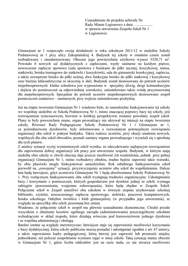 Uzasadnienie do projektu uchwały Nr Rady Miasta Legionowo z dnia …................ w sprawie utworzenia Zespołu Szkół Nr 1 w Legionowie Gimnazjum nr 1 rozpoczęło swoją działalność w roku szkolnym 2011/12 w siedzibie Szkoły Podstawowej nr 1 przy ulicy Zakopiańskiej 4. Budynek tej szkoły w ostatnim czasie został rozbudowany i zmodernizowany. Obecnie jego powierzchnia użytkowa wynosi 5520,71 m². Powstało 6 nowych sal dydaktycznych z zapleczami, węzły sanitarne na każdym piętrze, nowoczesne zaplecze sportowe (sala sportowa z boiskami do piłki ręcznej, koszykowej, tenisa, siatkówki, boiska treningowe do siatkówki i koszykówki, sala do gimnastyki korekcyjnej, zaplecza, a także zewnętrzne boisko do piłki nożnej, dwu funkcyjne boisko do piłki siatkowej i koszykowej oraz bieżnia lekkoatletyczna ze skocznią w dal). Budynek został dostosowany do potrzeb uczniów niepełnosprawnych: klatka schodowa jest wyposażona w specjalny dźwig, drogi komunikacyjne i dojścia do pomieszczeń są odpowiedniej szerokości, zainstalowano także windę przystosowaną dla niepełnosprawnych. Specjalnie do potrzeb uczniów niepełnosprawnych dostosowano zespół pomieszczeń szatniowo – sanitarnych, przy wejściu zainstalowano pochylnię. Już na etapie tworzenia Gimnazjum Nr 1 wiadomo było, że samodzielne funkcjonowanie tej szkoły we wspólnej siedzibie ze Szkołą Podstawową Nr 1, mimo znaczącej poprawy bazy tej szkoły, jest rozwiązaniem tymczasowym, bowiem w krótkiej perspektywie zostanie powołany zespół szkół. Plany te były powszechnie znane, organ prowadzący nie ukrywał tej intencji na etapie tworzenia szkoły. Również Rady Pedagogiczne Szkoły Podstawowej Nr 1 i Gimnazjum nr 1, za pośrednictwem dyrektorów, były informowane o rozważanym potencjalnym rozwiązaniu organizacji obu szkół w jednym budynku. Także rodzice uczniów, przy okazji ustalenia nowych, wspólnych dla obu szkół obwodów, poznali zamiary organu prowadzącego i wyrażali się z aprobatą dla tych planów. Z analizy sytuacji wyżej wymienionych szkół wynika, że zdecydowanie najlepszym rozwiązaniem dla zapewnienia dobrej organizacji ich pracy jest utworzenie zespołu. Budynek, w którym mają siedzibę obie szkoły w chwili obecnej daje jeszcze możliwość ich rozdzielenia, jednak przy pełnej organizacji Gimnazjum Nr 1, mimo rozbudowy obiektu, trudno będzie zapewnić takie warunki, by obie placówki mogły funkcjonować samodzielnie. Rok odrębnego funkcjonowania szkół pozwolił na „oswojenie” sytuacji, przyzwyczajenie uczniów obu szkół do współistnienia. Dalsze lata będą łatwiejsze, gdyż uczniowie Gimnazjum Nr 1 będą absolwentami Szkoły Podstawowej Nr 1. Przy rozłącznym funkcjonowaniu obu szkół występują trudności organizacyjne. Udostępnianie bazy i korzystanie z pomieszczeń, których gospodarzem jest dyrektor jednej ze szkół, wymaga zabiegów (porozumienia, wzajemne zobowiązania), które będą zbędne w Zespole Szkół. Połączenie szkół w Zespół umożliwi obu szkołom w równym stopniu użytkowanie szkolnej biblioteki, czytelni, nowoczesnego zaplecza sportowego, stołówki, pracowni komputerowych, boiska szkolnego. Odrębne świetlica i klub gimnazjalisty (w przypadku jego utworzenia), ze względu na specyfikę obu szkół, pozostaną bez zmian. Wiadomo, że połączenie szkół w zespół ma głównie uzasadnienie ekonomiczne. Chodzi przede wszystkim o obniżenie kosztów ogólnego zarządu (administrowania) poszczególnymi szkołami wchodzącymi w skład zespołu, które działają wówczas pod kierownictwem jednego dyrektora i ze wspólną administracją i obsługą. Bardzo istotne są względy merytoryczne: łatwiejsze staje się zapewnienie możliwości korzystania z bazy dydaktycznej, którą szkoły publiczne muszą posiadać i udostępniać zgodnie z art. 67 ustawy, a także zapewnienie kadry pedagogicznej, którą łatwiej jest zapewnić lub przenosić między jednostkami, niż polecać uzupełnianie wymiaru zajęć w innej szkole. Taką sytuację mamy obecnie w Gimnazjum Nr 1, gdzie liczba oddziałów jest na razie mała, co nie stwarza możliwości zatrudnienia nauczycieli na pełnych etatach. Szkoła ta będzie „rosła” wraz z przyjściem kolejnych roczników uczniów, aż do osiągnięcia pełnej organizacji. Ważnym aspektem organizacyjnym i merytorycznym jest także możliwość kontynuacji w Gimnazjum Nr 1 kształcenia integracyjnego, które uczniowie posiadający orzeczenie o potrzebie kształcenia specjalnego realizują w SP1. Dla tych uczniów dalsza nauka w sobie znanych warunkach, niemal w tej samej szkole ma ogromne znaczenie ze względu na poczucie bezpieczeństwa i analogicznie zorganizowany przyjazny proces dydaktyczny. Rejony Gimnazjum Nr 1 i Szkoły Podstawowej Nr 1 pokrywają się. W chwili połączenia obu szkół w zespół przyniesie to wymierne korzyści, szczególnie w aspekcie wychowawczym. oraz umożliwi monitorowanie rozwoju uczniów. Do szkoły będą uczęszczały dzieci w różnym wieku z tej samej rodziny, co umożliwi im bieżący kontakt, braterską opiekę i pomoc. Zintegrowanie społeczności lokalnej zwiększy poczucie odpowiedzialności za sprawy szkoły, a tym samym wpłynie na poprawę jakości jej pracy. Uczniowie od początku nauki szkolnej będą przebywali w tym samym środowisku rówieśniczym, w tych samych warunkach szkolnych. Nie będą dla nauczycieli anonimowi w żadnym okresie nauki. Rodzice będą znali kolegów swoich dzieci. Nawiązane przyjaźnie będą mogły trwać przez cały czas realizacji obowiązku szkolnego. Szkoła gimnazjalna, której typ w powszechnej opinii jest szkołą zwiększonego ryzyka wychowawczego, będzie szkołą bezpieczną i przyjazną. W zespole będzie obowiązywał spójny system wartości, których kształtowanie rozpocznie się w szkole podstawowej i będzie kontynuowane w gimnazjum. W zespole szkoła podstawowa wychowa i przygotuje do dalszej 