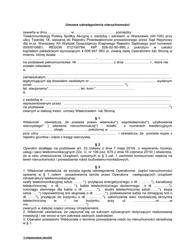 Umowa udostępnienia nieruchomości zawarta w dniu……………….. w ……………………………. pomiędzy: Telekomunikacją Polską Spółką Akcyjną z siedzibą i adresem w Warszawie (00-105) przy ulicy Twardej 18, wpisaną do Rejestru Przedsiębiorców prowadzonego przez Sąd Rejonowy dla m.st. Warszawy XII Wydział Gospodarczy Krajowego Rejestru Sądowego pod numerem 0000010681; REGON 012100784, NIP 526-02-50-995; z pokrytym w całości kapitałem zakładowym wynoszącym 4 006 947 063 zł, zwaną dalej Operatorem lub Stroną w imieniu, której działa: ……………………………………………………. - ………………………………………………….. na podstawie pełnomocnictwa Nr ………………………… z dnia ………………… r., które nie zostało odwołane. a, …………………………………………………………………………………………………………… zamieszkałym………..................................................................................................................... legitymującym się dowodem osobistym nr.................................................................... wydanym przez ........................................................................................... *), tel. stacjonarny*………………..……; tel. kom.* …………………………. . a, …………………………………………………………………………………………............................ z siedzibą w.................................................................................................................................. reprezentowanym przez ………………………………………………………………………………. na podstawie ………………………………………………………………………………………...…*) zwanym w dalszej treści umowy Właścicielem lub Stroną. §1 Właściciel oświadcza, że posiada prawo własności*), współwłasności*), użytkowania wieczystego* ) władania nieruchomością*) - działki o numerach ewidencyjnych .............................. obręb……………….., położonej w ................................................................ przy ulicy ............................................................................. i oświadcza, że posiada wypis z rejestru gruntów i odpis z księgi wieczystej. §2 Operator działając na podstawie art. 33 Ustawy z dnia 7 maja 2010r. o wspieraniu rozwoju usług i sieci telekomunikacyjnych (Dz. U. nr 106 poz. 675 z dnia 16 czerwca 2010r.) stwierdza, że w celu umieszczenia Urządzeń, opisanych w § 3 ust. 1 zachodzi konieczność wejścia na teren nieruchomości i prowadzenia robót budowlano-montażowych. §3 1. Właściciel oświadcza, że wyraża zgodę udostępnienie Operatorowi części nieruchomości opisanej w § 1 celem posadowienia tamże przez Operatora następujących urządzeń infrastruktury telekomunikacyjnej: szafy telekomunikacyjnej sztuk………*), przyłącza energetycznego o dł. ……….*), kanalizacji teletechnicznej o dł. ……… *), kabla teletechnicznego doziemnego o dł. …………*), rurociągu ziemnego dla kabla o dł. ………..*), studni teletechnicznej sztuk…….*), słupa sztuk……*) napowietrznej linii słupowej o dł. ………*), podwieszenie kabla na istniejącej linii o dł. ……*), przyłącze do budynku o dł. ………….*), zakończenie sieci rozdzielczej skrzynką teletechniczną w / na budynku przy ul. ………………nr………w ms………………………………………….*) zwanych w dalszej części umowy Urządzeniami. 2. Właściciel oświadcza, że zapoznał się ze szkicem sytuacyjnym dotyczącym realizowanej inwestycji i nie wnosi w tym zakresie żadnych zastrzeżeń. 3. Operator powiadomi Właściciela o terminie prowadzenia robót na nieruchomości określonej w § 1. *) niepotrzebne skreślić 4. Operator oświadcza, że doprowadzi teren do stanu pierwotnego niezwłocznie po zakończeniu robót. 5.Wszelkie koszty zawiązane z budową i utrzymaniem Urządzeń, o których mowa w ust. 1 ponosi Operator. §4 Właściciel oświadcza, że nie będzie dochodził od Operatora w chwili obecnej i w przyszłości żadnych roszczeń finansowych z tytułu umieszczenia na nieruchomości określonej w § 1 umowy Urządzeń §5 1. Właściciel zobowiązuje się udostępnić przedstawicielowi Operatora każdorazowo wstęp na teren nieruchomości wymienionej w § 1 celem przeprowadzenia planowych konserwacji, naprawy, modernizacji, wymiany lub rozbudowy Urządzeń . 2. Za wynikłe z tych czynności ewentualne szkody każdorazowo będzie wypłacane odszkodowanie. 3. Zakres szkód zostanie ustalony w formie protokołu podpisanego przez Strony. Protokół ten stanowić będzie podstawę do ustalenia wysokości ewentualnego odszkodowania za szkody nie naprawione w trybie § 3 ust. 4. 4. W przypadku sporu co do wysokości odszkodowania lub zakresu nie usuniętych szkód, wysokość odszkodowania określi niezależny rzeczoznawca majątkowy. Koszt ekspertyzy rzeczoznawcy majątkowego ponosi Operator. 5. O terminie wykonania prac, o których mowa w ust. 1 Właściciel zostanie powiadomiony na 7 dni przed rozpoczęciem robót, przy czym usuwanie awarii może odbywać się bez konieczności zachowania terminu powiadomienia, jednak po powiadomieniu Właściciela. §6 Niniejsza umowa obowiązuje na czas pozostawania urządzeń Operatora na nieruchomości Właściciela i wiąże również następców prawnych Stron umowy. §7 W sprawach nieuregulowanych niniejszą umową mają zastosowanie odpowiednio przepisy art. 305.1 do 305.4 Kodeksu Cywilnego, Ustawy Prawo telekomunikacyjne z dnia 16 lipca 2004r. Dz. U. Nr 171, poz. 1800 z późniejszymi zmianami oraz Ustawy o wspieraniu rozwoju usług i sieci telekomunikacyjnych z dnia 7 maja 2010 r. – Dz. U. nr 106 poz. 675. §8 Umowę sporz