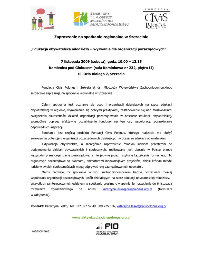 Zaproszenie na spotkanie regionalne w Szczecinie „Edukacja obywatelska młodzieŜy – wyzwanie dla organizacji pozarządowych” 7 listopada 2009 (sobota), godz. 10.00 – 13.15 Kamienica pod Globusem (sala Kominkowa nr 232, piętro II) Pl. Orła Białego 2, Szczecin Fundacja Civis Polonus i Sekretariat ds. MłodzieŜy Województwa Zachodniopomorskiego serdecznie zapraszają na spotkanie regionalne w Szczecinie. Celem spotkania jest poznanie się osób i organizacji działających na rzecz edukacji obywatelskiej w regionie, wymienienie się dobrymi praktykami, zastanowienie się nad moŜliwościami zwiększenia skuteczności działań organizacji pozarządowych w obszarze edukacji obywatelskiej, szczególnie poprzez efektywne pozyskiwanie funduszy na ten cel, współpracę, poszukiwanie odpowiednich inspiracji. Spotkanie jest częścią projektu Fundacji Civis Polonus, którego realizacja ma słuŜyć zwiększeniu potencjału organizacji pozarządowych działających w obszarze edukacji obywatelskiej. Aktywizacja obywatelska, a szczególnie zapewnienie młodym ludziom przestrzeni do podejmowania działań obywatelskich i społecznych, realizowana jest obecnie w Polsce przede wszystkim przez organizacje pozarządowe, a nie jedynie przez instytucje kształcenia formalnego. To organizacje pozarządowe są twórcami, animatorami innowacyjnych projektów, dzięki którym młodzi ludzie w swoich społecznościach mogą odgrywać rolę zaangaŜowanych obywateli. Mamy nadzieję, Ŝe spotkanie w woj. zachodniopomorskim będzie początkiem trwałej współpracy organizacji pozarządowych i osób działających na rzecz edukacji obywatelskiej młodzieŜy. Wszystkich zainteresowanych udziałem w spotkaniu prosimy o wypełnienie i przesłanie do 6 listopada formularza zgłoszeniowego na adres: [email protected] (formularz w załączeniu). Kontakt: Katarzyna Leśko, Tel: 022 827 52 49, 509 725 536, [email protected] www.aktywizacja.civispolonus.org.pl Finansowanie:
