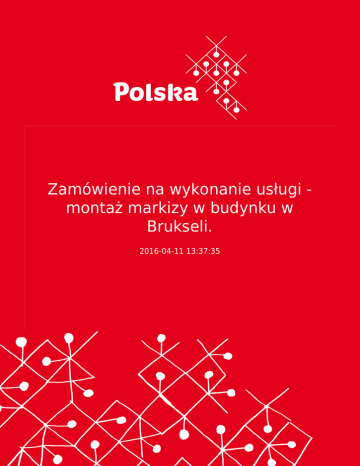 Zamówienie na wykonanie usługi montaż markizy w budynku w Brukseli. 2016-04-11 13:37:35 2 W związku z zapotrzebowaniem Wydziału Promocji Handlu i Inwestycji Ambasady RP w Brukseli na montaż markizy na parterze budynku przy Av. Horizon 18 (nad tarasem), zwracam się z uprzejmą prośbą o wycenę robót. W związku z zapotrzebowaniem Wydziału Promocji Handlu i Inwestycji Ambasady RP w Brukseli na montaż markizy na parterze budynku przy Av. Horizon 18 (nad tarasem), zwracam się z uprzejmą prośbą o wycenę robót, których zakres będzie obejmował: - zakup markizy o wymiarach 3,40 mx 2,60m w odcieniach od żółtego po brązowy, całkowicie chowanej do kasety, sterowanej pilotem, wyposażonej w czujnik pogodowy umożliwiający automatyczne składanie w przypadku silnego deszczu lub wiatru - doprowadzenie zasilania elektrycznego - montaż markizy z użyciem bocznych wsporników chroniących przed silnymi wiatrami - szkolenie pracowników Termin składania ofert upływa 30.04.2016r. Planowany termin rozpoczęcia prac: maj/czerwiec 2016 r. Prosimy o przesyłanie ofert na adres mailowy: [email protected] bądź faksem na numer 02 771.18.39 3