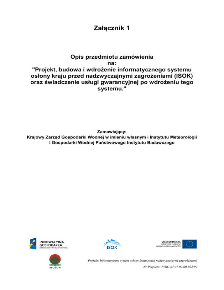 Załącznik 1 Opis przedmiotu zamówienia na: "Projekt, budowa i wdrożenie informatycznego systemu osłony kraju przed nadzwyczajnymi zagrożeniami (ISOK) oraz świadczenie usługi gwarancyjnej po wdrożeniu tego systemu." Zamawiający: Krajowy Zarząd Gospodarki Wodnej w imieniu własnym i Instytutu Meteorologii i Gospodarki Wodnej Państwowego Instytutu Badawczego Projekt: Informatyczny system osłony kraju przed nadzwyczajnymi zagrożeniami Nr Projektu: POIG.07.01.00-00-025/09 Spis treści Wprowadzenie ....................................................................................................................................................... 6 1. Skróty i definicje ........................................................................................................................................... 7 1.1. Najważniejsze skróty stosowane w dokumencie .................................................................................... 7 1.2. Najważniejsze akty prawne przytaczane w dokumencie ...................................................................... 10 1.3. Najważniejsze definicje stosowane w dokumencie .............................................................................. 10 2. Opis Systemu – wyciąg ze Studium Wykonalności ISOK ....................................................................... 15 2.1. Przeznaczenie ..................................................................................................................................... 15 2.2. Główni użytkownicy (wewnętrzni)......................................................................................................... 16 2.3. Użytkownicy zewnętrzni ....................................................................................................................... 18 2.4. Otoczenie Systemu .............................................................................................................................. 19 3. Przedmiot zamówienia ............................................................................................................................... 20 3.1. Główne elementy zamówienia ............................................................................................................. 20 3.2. Kontekst Systemu ................................................................................................................................ 21 3.3. Wizja Systemu ISOK ............................................................................................................................ 25 4. Architektura Logiczna Systemu ISOK ..................................................................................................... 27 4.1. Elementy Systemu ISOK...................................................................................................................... 29 4.1.1. Węzeł ISOK-IMGW: Węzeł Centralny ......................................................................................... 29 4.1.2. Architektura logiczna warstwy przetwarzania Węzła Centralnego ISOK ..................................... 32 4.1.3. Węzeł ISOK-IMGW: Centrum Zapasowe .................................................................................... 51 4.1.4. Węzeł ISOK-KZGW (SIGW) ........................................................................................................ 52 4.1.5. Architektura logiczna warstwy przetwarzania Węzła KZGW (SIGW): ......................................... 56 4.1.6. Węzeł ISOK-KZGW: Centrum zapasowe .................................................................................... 61 4.2. Systemy powiązane z Systemem ISOK ............................................................................................... 61 4.2.1. SOK ............................................................................................................................................. 62 4.2.2. Geoportal..................................................................................................................................... 62 4.2.3. Uniwersalny Moduł Mapowy ........................................................................................................ 63 4.2.4. SEKOP ........................................................................................................................................ 63 4.2.5. IT-GIS OKI................................................................................................................................... 63 4.2.6. SIKPOŚK..................................................................................................................................... 64 4.2.7. ePUAP ........................................................................................................................................ 64 4.3. Główne Technologie ............................................................................................................................ 65 4.3.1. Warstwa integracyjna .................................................................................................................. 65 4.3.2. Moduł zarządzania procesami biznesowymi ............................................................................... 66 4.3.3. Szyna integracyjna ESB .............................................................................................................. 66 4.3.4. Technologie GIS.......................................................................................................................... 67 4.3.5. Zarządzanie Tożsamością i Uprawnieniami (IAM) ...................................................................... 67 5. Architektura Fizyczna Systemu ................................................................................................................. 71 5.1. Wymagania ogólne ........................................................................................................................
