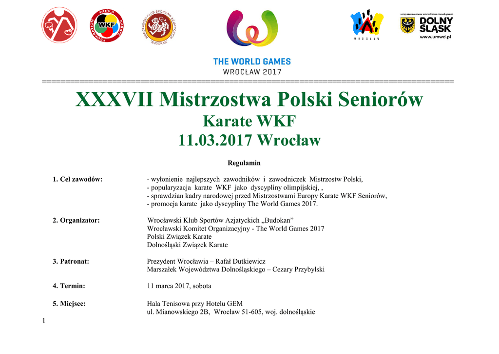 ======================================================================================== XXXVII Mistrzostwa Polski Seniorów Karate WKF 11.03.2017 Wrocław Regulamin 1 1. Cel zawodów: - wyłonienie najlepszych zawodników i zawodniczek Mistrzostw Polski, - popularyzacja karate WKF jako dyscypliny olimpijskiej, , - sprawdzian kadry narodowej przed Mistrzostwami Europy Karate WKF Seniorów, - promocja karate jako dyscypliny The World Games 2017. 2. Organizator: Wrocławski Klub Sportów Azjatyckich „Budokan” Wrocławski Komitet Organizacyjny - The World Games 2017 Polski Związek Karate Dolnośląski Związek Karate 3. Patronat: Prezydent Wrocławia – Rafał Dutkiewicz Marszałek Województwa Dolnośląskiego – Cezary Przybylski 4. Termin: 11 marca 2017, sobota 5. Miejsce: Hala Tenisowa przy Hotelu GEM ul. Mianowskiego 2B, Wrocław 51-605, woj. dolnośląskie XXXVII Mistrzostwa Polski Seniorów Karate WKF 11.03.2017 Wrocław 6. Warunki udziału: - zgłoszenie startujących w terminie do 05.03.2017 (niedziela) online poprzez stronę www.sportdata.org/karate . Pomoc techniczna : [email protected] Zgłoszenie do weryfikacji należy przesłać także mailem na adres Komisji Karate Shotokan PZK [email protected] na załączonym formularzu do dnia 05.03.2017. 7. Wymagania: - opłacona przez Klub licencja członkowska Polskiego Związku Karate na rok 2017, - posiadanie aktualnych licencji zawodniczych, - obywatelstwo polskie, - ubezpieczenie zawodników od NNW, - aktualne badania sportowo-lekarskie, - uiszczenie opłaty startowej gotówką podczas weryfikacji dokumentów lub przelewem na - konto: WKSA Budokan ul. Borowska 1-3 50-529 Wrocław PEKAO SA 95 1240 6696 1111 0000 5615 9927 ( dowód przelewu do okazania przy weryfikacji), - weryfikacja dokumentów i opłaty tylko w dniu 10.03.2017r., - przedstawienie dowodu tożsamości ze zdjęciem zawodnika przy weryfikacji, - stopień wyszkolenia - minimum 5 kyu w kata i 3 kyu w kumite (stopień musi być zarejestrowany w bazie danych Polskiego Związku Karate). 8. Opłaty startowe: - konkurencja indywidualna - 60zł, - konkurencja kata i kumite drużynowe seniorek - 120 zł, - konkurencja kata drużynowe seniorów – 120 zł, - konkurencja kumite drużynowe seniorów - 150 zł, - płatne 10.03.2017 (tylko w sobotę) podczas weryfikacji lub na konto Organizatora, - w dniu zawodów nie będzie możliwości dokonywania opłat. 2 XXXVII Mistrzostwa Polski Seniorów Karate WKF 11.03.2017 Wrocław 9. Weryfikacja dokumentów, ważenie, losowanie: - weryfikacja dokumentów i ważenie zawodników w dniu 10.03.2017, godz. 16.30-20.00 Hotel Campanile Centrum, ul. Ślężna 26, 53-302 Wrocław – sala konferencyjna, - losowanie odbędzie się po weryfikacji dokumentów w dniu 10.03.2017 ok. godz. 21.00 w Hotelu Campanile Centrum, - po oficjalnym losowaniu nie ma możliwości dopisania zawodnika do konkurencji, - w dniu 11.03.2017 w godz. 8.15-8.30 na Hali Sportowej będzie tylko możliwość zważenia zawodnika po wcześniejszym zgłoszeniu tego faktu komisji sędziowskiej i organizatorowi. 10. Wiek zawodników: - kumite - zawodniczki i zawodnicy urodzeni do 11.03.1999r. (ukończone 18 lat), - kata - zawodniczki i zawodnicy urodzeni do 11.03.2001r. (ukończone 16 lat). 11. Konkurencje: Nr konk. 1 2 3 4 5 6 7 8 9 10 11 12 13 14 15 16 3 Nazwa konkurencji Kata indywidualne seniorek Kata indywidualne seniorów Kumite indywidualne seniorek -50 kg Kumite indywidualne seniorek -55 kg Kumite indywidualne seniorek -61 kg Kumite indywidualne seniorek -68 kg Kumite indywidualne seniorek +68 kg Kumite indywidualne seniorów -60 kg Kumite indywidualne seniorów -67 kg Kumite indywidualne seniorów -75 kg Kumite indywidualne seniorów -84 kg Kumite indywidualne seniorów +84kg Kata drużynowe seniorek Kata drużynowe seniorów Kumite drużynowe seniorek (3+1) Kumite drużynowe seniorów (5+2) XXXVII Mistrzostwa Polski Seniorów Karate WKF 11.03.2017 Wrocław 12. Przepisy: - Mistrzostwa zostaną przeprowadzone według aktualnych przepisów WKF, - zawodnicy muszą posiadać sprzęt zgodny z homologacją WKF/PZK - w obszarze pola walk mogą przebywać tylko zawodnicy aktualnie toczący walki i ich trenerzy (wyłącznie w dresie klubowym, z aktualną licencją) oraz sędziowie. - w konkurencjach, w których obsada jest niepełna (min. 4 zawodników lub drużyn), nie będzie przyznawany tytuł Mistrza Polski ani punktacja do Rankingu oraz klasyfikacji końcowej Mistrzostw, kategoria taka może też zostać odwołana. 13. Postanowienia końcowe: - kwestie sporne rozstrzyga Sędzia Główny w porozumieniu z organizatorem, - złożenie protestu dot. decyzji sędziowskiej – po wpłaceniu wadium w wys. 300 zł, - organizator nie ponosi odpowiedzialności za rzeczy zaginione, - za ewentualne szkody poczynione przez uczestnika zawodów odpowiedzialność ponosi jego Klub, - w trakcie ceremonii dekoracji obowiązuje zawodników i zawodniczki dres klubowy lub karategi, - ekspozycja i sprzedaż towarów - tylko za zgodą organizatora, - przy weryfikacji zgłoszeń przed zawodami należy posiadać kopie zgłoszenia zawodników klubu, - kontakt z organizatorem – Piotr Babicz tel. +48 602 868 427 [email protected] 14. Sędziowie: 4 - sędziowie zostaną powołani przez Przewodniczącego Komisji Sędziowskiej WKF Polskiego Związku Karate Pana Jarosława Lewandowskiego w porozumieniu z organizatorem, - wszelkie sprawy związane z noclegami, wyżywieniem, szkoleniem sędziowskim zostaną wysłane osobną korespondencją przez Komisję Sędziowską - adres hotelu dla sędziów: Campanile Centrum, ul. Ślężna 26, 53-302 Wrocław XXXVII Mistrzostwa Polski Seniorów Karate WKF 11.03.2017 Wrocław 15. Noclegi i wyżywienie: OFICJALNY HOTEL MISTRZOSTW Campanile Centrum, ul. Ślężna 26, 53-302 Wrocław http://www.campanile-wroclaw-centrum.pl Dla uczestników Mistrzostw zarezerwowana została pula miejsc w 2 hotelach znajdujących się w tym samym budynku. Ceny zostały wynegocjowane.