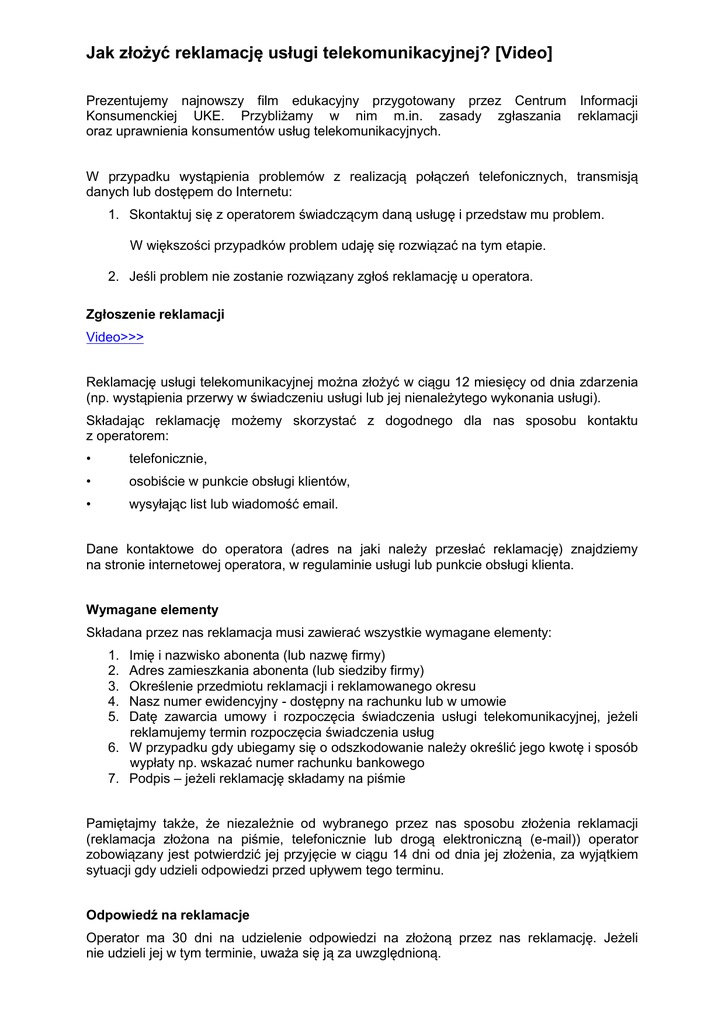 Jak złożyć reklamację usługi telekomunikacyjnej? [Video] Prezentujemy najnowszy film edukacyjny przygotowany przez Centrum Informacji Konsumenckiej UKE. Przybliżamy w nim m.in. zasady zgłaszania reklamacji oraz uprawnienia konsumentów usług telekomunikacyjnych. W przypadku wystąpienia problemów z realizacją połączeń telefonicznych, transmisją danych lub dostępem do Internetu: 1. Skontaktuj się z operatorem świadczącym daną usługę i przedstaw mu problem. W większości przypadków problem udaję się rozwiązać na tym etapie. 2. Jeśli problem nie zostanie rozwiązany zgłoś reklamację u operatora. Zgłoszenie reklamacji Video>>> Reklamację usługi telekomunikacyjnej można złożyć w ciągu 12 miesięcy od dnia zdarzenia (np. wystąpienia przerwy w świadczeniu usługi lub jej nienależytego wykonania usługi). Składając reklamację możemy skorzystać z dogodnego dla nas sposobu kontaktu z operatorem: • telefonicznie, • osobiście w punkcie obsługi klientów, • wysyłając list lub wiadomość email. Dane kontaktowe do operatora (adres na jaki należy przesłać reklamację) znajdziemy na stronie internetowej operatora, w regulaminie usługi lub punkcie obsługi klienta. Wymagane elementy Składana przez nas reklamacja musi zawierać wszystkie wymagane elementy: Imię i nazwisko abonenta (lub nazwę firmy) Adres zamieszkania abonenta (lub siedziby firmy) Określenie przedmiotu reklamacji i reklamowanego okresu Nasz numer ewidencyjny - dostępny na rachunku lub w umowie Datę zawarcia umowy i rozpoczęcia świadczenia usługi telekomunikacyjnej, jeżeli reklamujemy termin rozpoczęcia świadczenia usług 6. W przypadku gdy ubiegamy się o odszkodowanie należy określić jego kwotę i sposób wypłaty np. wskazać numer rachunku bankowego 7. Podpis – jeżeli reklamację składamy na piśmie 1. 2. 3. 4. 5. Pamiętajmy także, że niezależnie od wybranego przez nas sposobu złożenia reklamacji (reklamacja złożona na piśmie, telefonicznie lub drogą elektroniczną (e-mail)) operator zobowiązany jest potwierdzić jej przyjęcie w ciągu 14 dni od dnia jej złożenia, za wyjątkiem sytuacji gdy udzieli odpowiedzi przed upływem tego terminu. Odpowiedź na reklamacje Operator ma 30 dni na udzielenie odpowiedzi na złożoną przez nas reklamację. Jeżeli nie udzieli jej w tym terminie, uważa się ją za uwzględnioną. W przypadku odmowy uznania reklamacji, odpowiedź operatora zostanie doręczona przesyłką poleconą, a jej treść powinna zawierać wyczerpujące uzasadnienie. W przypadku uznania reklamacji związanej z odszkodowaniem, operator przyznaje je nam, zgodnie z obowiązującym regulaminem świadczenia usług. Jeżeli uważamy, że w wyniku braku łączności czy też nieprawidłowego świadczenia usług, ponieśliśmy wymierne straty, których wysokość będziemy w stanie udowodnić, wówczas możemy zażądać od operatora odszkodowania w innej wysokości niż określona w regulaminie świadczenia usług. Pamiętajmy Reklamację możemy zgłosić gdy stwierdzimy: że operator nie dotrzymał terminu rozpoczęcia świadczenia usługi bądź wykonał usługę nienależycie, lub też w ogóle jej nie wykonał Powodem do złożenia reklamacji jest także nieprawidłowe obliczenie przez operatora należności z tytułu świadczenia usług. Złożenie reklamacji dotyczącej wysokości rachunku nie zwalnia nas z obowiązku terminowego uregulowania (opłacenia) rachunku. Przed każdym złożeniem reklamacji sprawdzajmy czy zawiera ona wszystkie wymagane elementy. Mamy 12 miesięcy na złożenie reklamacji. W razie wątpliwości lub problemów skontaktuj się z Centrum Informacji Konsumenckiej UKE: infolinia 801 900 853 (koszt połączenia zgodny z cennikiem operatora) 22 534 91 74 (pon. - pt. w godzinach 8.15 – 16.15) www.uke.gov.pl/formularz www.cik.uke.gov.pl Więcej informacji: www: www.uke.gov.pl Media społecznościowe: FB: www.facebook.com/UrzadKomunikacjiElektronicznej Twitter: twitter.com/UKE2UKE/ YouTube: http://www.youtube.com/UKEregulator