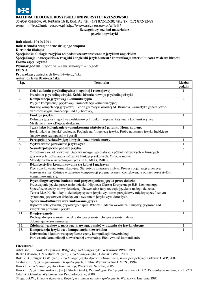 KATEDRA FILOLOGII ROSYJSKIEJ UNIWERSYTET RZESZOWSKI 35-959 Rzeszów, Al. Rejtana 16 B, bud. A3 ,tel. (17) 872-12-20; tel./fax: (17) 872-12-89 e-mail: [email protected] http://www.univ.rzeszow.pl/wfil/ifr/ Szczegółowy rozkład materiału z psycholingwistyki Rok akad.: 2010/2011 Rok: II studia stacjonarne drugiego stopnia Kierunek: filologia Specjalność: filologia rosyjska od podstaw/zaawansowana z językiem angielskim Specjalizacja: nauczycielska/ rosyjski i angielski język biznesu / komunikacja interkulturowa w sferze biznesu Forma zajęć: wykład Wymiar godzin: 1 godz. w. w sem. zimowym = 15 godz. ECTS: 4 Prowadzący zajęcia: dr Ewa Dźwierzyńska Autor: dr Ewa Dźwierzyńska Lp. Tematyka Liczba godzin 1. 1 Cele i zadania psycholingwistyki ogólnej i rozwojowej Przedmiot psycholingwistyki. Krótka historia rozwoju psycholingwistyki. 2. 2 Kompetencja językowej i komunikacyjna Pojęcie kompetencji językowej i kompetencji komunikacyjnej. Rozwój kompetencji językowej. Teoria gramatyki osiowej M. Braine’a. Gramatyka generatywnotransformacyjna, koncepcja LAD (Chomsky). 3. 1 Funkcje języka Definicja języka i jego dwu podstawowych funkcji: reprezentatywnej i komunikacyjnej. Myślenie i mowa.Pojęcie dyskursu. 4. 1 Język jako biologicznie uwarunkowana właściwość gatunku Homo sapiens. Język ludzki a „języki” zwierząt. Poglądy na filogenezę języka. Próby nauczania języka ludzkiego (migowego) szympansów i goryli 5. 1 Percepcja przekazów językowych – rozumienie mowy 6. 1 Wytwarzanie przekazów jezykowych 7. 2 Neurofizjologiczne podłoże języka Ośrodkowy układ nerwowy. Budowa mózgu. Specjalizacja półkul mózgowych w funkcjach językowych. Lokalizacja mózgowa funkcji językowych. Ośrodki mowy. Metody badań w neurolingwistyce (EEG, MEG, IMRI). 8. 1 Różnice stylów komunikowania się kobiet i mężczyzn Płeć a zachowania komunikacyjne. Stereotypy związane z płcią. Proces socjalizacji a pozycja konwersacyjna. Różnice w zakresie kompetencji pragmatycznej. Konsekwencje odmienności stylów komunikowania się. 9. 1 Psycholingwistyczne badania nad przyswajaniem języka przez dziecko Przyswajanie języka przez małe dziecko. Hipoteza Okresu Krytycznego E.H. Lennenberga. Specyficzne cechy mowy dziecięcej.Uniwersalne fazy rozwoju języka u małego dziecka. Teoria M.A.K. Halliday’a -dziecięcy system językowy,-okres przejściowy między specyficznym systemem językowym dziecięcym a systemem językowym dorosłych. 10. 1 Społeczno-kulturowe uwarunkowania języka. Hipoteza relatywizmu językowego Sapira-Whorfa Badania wewnątrz- i międzyjęzykowe nad związkiem poznania i języka. 11. 1 Dwujęzyczność. Rodzaje dwujęzyczności. Wiek a dwujęzyczność. Dwujęzyczność u dzieci. Submersja versus immersja. 12. 1 Zdolności językowe, motywacja, uwaga, pamięć w uczeniu się języka obcego 13. 1 Kompetencja językowa a kompetencja niewerbalna Uniwersalne i kulturowo specyficzne cechy komunikacji niewerbalnej. Porównanie komunikacji niewerbalnej z werbalną. Efektywność komunikatów Literatura: Aitchison, J., Ssak, który mówi. Wstęp do psycholingwistyki. Warszawa: PWN, 1991. Berko Gleason, J. & Ratner, N. (red.), Psycholingwistyka., Gdańsk: GWP, 2005. Bokus, B., Shugar, G.W. (red.), Psychologia języka dziecka. Osiągnięcia, nowe perspektywy. Gdańsk: GWP, 2007. Grabias, S., Język w zachowaniach społecznych, Lublin: Wydawnictwo UMCS., 1994. Kurcz I., Psychologia języka i komunikacji, Warszawa: Scholar, 2005. Kurcz I., Język i komunikacja, [w:] J.Strelau (red.), Psychologia. Podręcznik akademicki, t.2: Psychologia ogólna, s. 231-274, Gdańsk: Gdańskie Wydawnictwo Psychologiczne, 2000. Shugar, G.W., Dyskurs dziecięcy. Rozwój w ramach struktur społecznych, Warszawa: Energeia,1995.