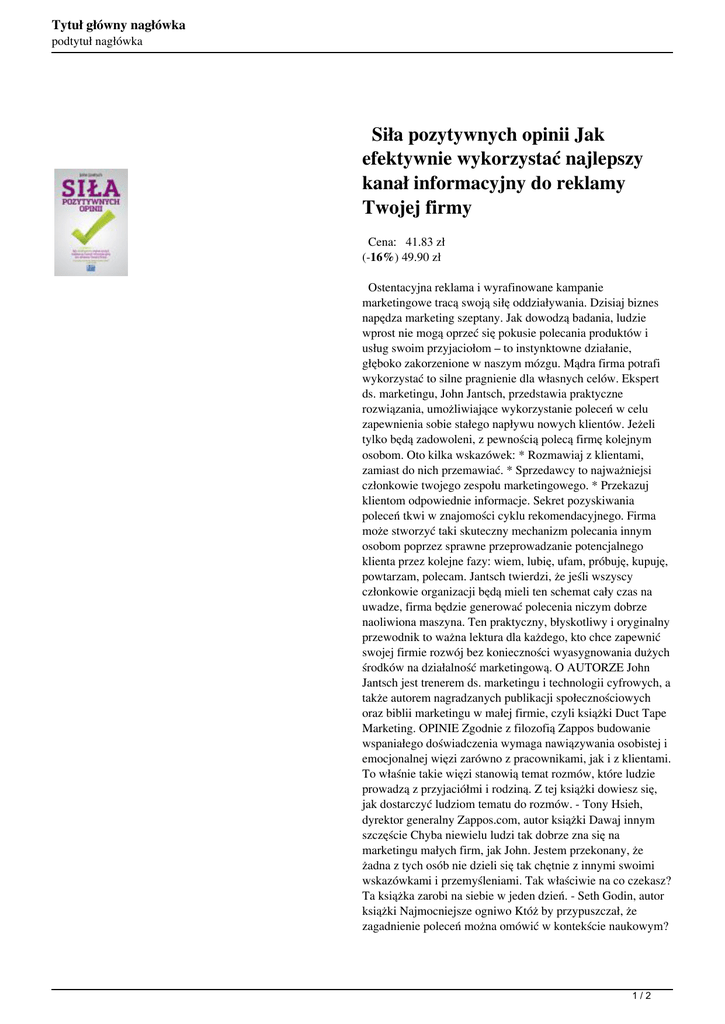 Tytuł główny nagłówka podtytuł nagłówka Siła pozytywnych opinii Jak efektywnie wykorzystać najlepszy kanał informacyjny do reklamy Twojej firmy Cena: 41.83 zł (-16%) 49.90 zł Ostentacyjna reklama i wyrafinowane kampanie marketingowe tracą swoją siłę oddziaływania. Dzisiaj biznes napędza marketing szeptany. Jak dowodzą badania, ludzie wprost nie mogą oprzeć się pokusie polecania produktów i usług swoim przyjaciołom – to instynktowne działanie, głęboko zakorzenione w naszym mózgu. Mądra firma potrafi wykorzystać to silne pragnienie dla własnych celów. Ekspert ds. marketingu, John Jantsch, przedstawia praktyczne rozwiązania, umożliwiające wykorzystanie poleceń w celu zapewnienia sobie stałego napływu nowych klientów. Jeżeli tylko będą zadowoleni, z pewnością polecą firmę kolejnym osobom. Oto kilka wskazówek: * Rozmawiaj z klientami, zamiast do nich przemawiać. * Sprzedawcy to najważniejsi członkowie twojego zespołu marketingowego. * Przekazuj klientom odpowiednie informacje. Sekret pozyskiwania poleceń tkwi w znajomości cyklu rekomendacyjnego. Firma może stworzyć taki skuteczny mechanizm polecania innym osobom poprzez sprawne przeprowadzanie potencjalnego klienta przez kolejne fazy: wiem, lubię, ufam, próbuję, kupuję, powtarzam, polecam. Jantsch twierdzi, że jeśli wszyscy członkowie organizacji będą mieli ten schemat cały czas na uwadze, firma będzie generować polecenia niczym dobrze naoliwiona maszyna. Ten praktyczny, błyskotliwy i oryginalny przewodnik to ważna lektura dla każdego, kto chce zapewnić swojej firmie rozwój bez konieczności wyasygnowania dużych środków na działalność marketingową. O AUTORZE John Jantsch jest trenerem ds. marketingu i technologii cyfrowych, a także autorem nagradzanych publikacji społecznościowych oraz biblii marketingu w małej firmie, czyli książki Duct Tape Marketing. OPINIE Zgodnie z filozofią Zappos budowanie wspaniałego doświadczenia wymaga nawiązywania osobistej i emocjonalnej więzi zarówno z pracownikami, jak i z klientami. To właśnie takie więzi stanowią temat rozmów, które ludzie prowadzą z przyjaciółmi i rodziną. Z tej książki dowiesz się, jak dostarczyć ludziom tematu do rozmów. - Tony Hsieh, dyrektor generalny Zappos.com, autor książki Dawaj innym szczęście Chyba niewielu ludzi tak dobrze zna się na marketingu małych firm, jak John. Jestem przekonany, że żadna z tych osób nie dzieli się tak chętnie z innymi swoimi wskazówkami i przemyśleniami. Tak właściwie na co czekasz? Ta książka zarobi na siebie w jeden dzień. - Seth Godin, autor książki Najmocniejsze ogniwo Któż by przypuszczał, że zagadnienie poleceń można omówić w kontekście naukowym? 1/2 Tytuł główny nagłówka podtytuł nagłówka Ja nie przypuszczałem, ale skoro teraz już o tym wiem, chciałbym, żebyś ty również skorzystał z doświadczeń Johna. Recenzje na okładce to w pewnym sensie rekomendacja w czystej postaci. Polecam tę książkę, ponieważ pomoże ci ona odnieść sukces biznesowy. - Guy Kawasaki, współzałożyciel serwisu Alltop Jeżeli z upodobaniem dzwonisz do klientów w ciemno i wyrzucasz pieniądze na reklamę, Siła pozytywnych opinii nie jest dla ciebie. Jeżeli natomiast chciałbyś się dowiedzieć, w jaki sposób możesz skłonić ludzi do tego, żeby rozmawiali o twojej firmie i kierowali do ciebie kolejnych klientów – John ma na to odpowiedź. Swoje rozwiązania przedstawia w ciekawej formie, przytaczając mnóstwo przykładów z życia wziętych. - David Meerman Scott, autor książki Nowe zasady marketingu i PR. 2/2 Powered by TCPDF (www.tcpdf.org)