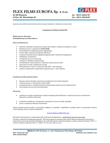 FLEX FILMS EUROPA Sp. z o.o. 62 300 Września Ul.Gen. Wł. Sikorskiego 48 tel.: +48 61 436-61-67 fax: +48 61 436-65-87 zapraszawszytskichzainteresowanychdowzięciaudziałuwrektutacjinastanowsko: PraktykantWDZIALELOGISTYKI Miejscepracy:Wrzesnia ZatrudnienieprzezfirmęAdecco Naszeoczekiwaniato: Student/studentkaminimumtrzeciegorokustudiówzdobrymiwynikamiwnauce Możliwośćpracywgodzinach12:00‐20:00 komunikatywnaznajomośćjęzykaangielskiego bardzodobraznajomośćprogramuMSExcel, znajomośćpodstawowychzagadnieńlogistycznychifinansowo‐księgowych dokładność,sumienność umiejętnośćpracywpodpresją inicjatywaizdolnościorganizacyjne samodzielnośćideterminacjawrealizacjiwyznaczonychcelów gotowośćdonaukiizdobywaniawiedzy doświadczeniewpracyzsystemamitypuERP–milewidziane udziałwprogramachistypendiachzagranicznych–milewidziane Dogłównychzadańnależałobędzie: BieżącewparciedziałańioperacjiprowadzonychprzezDziałLogistyki codziennapracawśrodowiskusystemuERP przygotowywanieikomplemetowaniedokumentacjiexportowcych,importowych innezadaniazleconeprzezprzełożonego Oferujemy: możliwośćrozwojuzawodowegoidobyciabogategodoświadczeniawzakresieoperacjiwtransportcie lądowym,morskimilotniczym uzyskaniekwalifikacjiiumiejętnościzwiązanychzpracąwDzialeLogistyki pracęwmiędzynarodowymśrodowisku Osobyzainteresowaneprosimyoprzesyłanieaplikacjiwj.polskimiangeilskimnapodanyadreszwskazaniemnumeru referencyjnegoofertywtytulewiadomości. [email protected] Uprzejmieinformujemy,żeodpowiemytylkowybranymkandydatom,anadesłanychofertniezwracamy. Prosimyodopisanienastępującejklauzuli:"Wyrażamzgodęnaprzetwarzaniemoichdanychosobowychzawartychw mojejoferciepracydlapotrzebniezbędnychdorealizacjiprocesurekrutacjizgodniezustawązdnia29sierpnia1997r.o ochroniedanychosobowych(Dz.U.z2002r.Nr101,poz.926,zezm.)" Works 62-300 Wrzesnia, ul. Gen.Wladyslawa Sikorskiego 48 Poland NIP 779-23-87-276 Website www.flexfilm.com KRS 0000376525