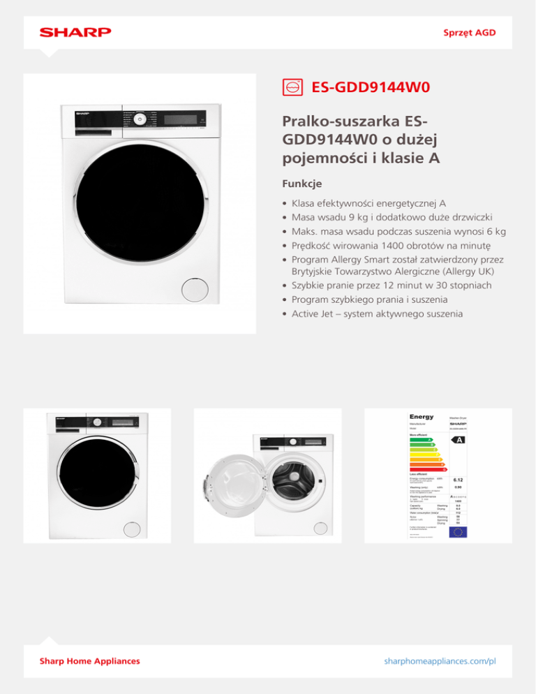 Sprzęt AGD ES-GDD9144W0 Pralko-suszarka ESGDD9144W0 o dużej pojemności i klasie A Funkcje Klasa efektywności energetycznej A Masa wsadu 9 kg i dodatkowo duże drzwiczki Maks. masa wsadu podczas suszenia wynosi 6 kg Prędkość wirowania 1400 obrotów na minutę Program Allergy Smart został zatwierdzony przez Brytyjskie Towarzystwo Alergiczne (Allergy UK) Szybkie pranie przez 12 minut w 30 stopniach Program szybkiego prania i suszenia Active Jet – system aktywnego suszenia Sharp Home Appliances sharphomeappliances.com/pl Sprzęt AGD Kluczowe cechy Kolor Biały Maksymalna pojemność (kg) suszenia 6 Maksymalny wsad do prania (kg) 9 Szybkość wirowania (obr./min) 1600 Start z opóźnieniem Tak Activejet Tak Sprawność energetyczna A+ Wydajność prania A Wydajność wirowania A Czas najkrótszego prania (min) 12 Bęben o dużej pojemności i duże drzwi Tak Liczba dostępnych programów 15 Gwarancja (w latach) Dwa lata na części i robociznę Szeroko otwierane drzwi Tak Regulowane nóżki Tak Czujnik suszenia Tak Suszenie funkcje Wieszak do suchej, żelazko suche, szafka suche Wskazówki dotyczące dozowania Tak Zegar czasu rzeczywistego Tak Suszenie funkcje Tak System sterowania Elektronika Door Opening (Degrees) 140 Start/pauza Tak Poziom szumów podczas prania (dBA) 58 Poziom szumów podczas wirowania (dBA) 77 Noise During Drying (dBA) 64 Inne funkcje Typ wyświetlacza W pełni graficzny wyświetlacz LCD Zmienna szybkość wirowania Tak Zmienna temperatura Tak Objętość bębna 61 System Eco-Logic Tak Zabezpieczenie przed dziećmi Tak Zabezpieczenie przez pianą Tak System wykrywania braku równowagi Tak Zabezpieczenie przed przepełnieniem Tak System wykrywania usterek Tak Wskaźnik cyklu prania Tak Wlot wody Zimna Dodatkowe płukanie Tak Namaczanie Tak Łatwe prasowanie Tak Sharp Home Appliances sharphomeappliances.com/pl Sprzęt AGD Wymiary i waga Wysokość (cm) 84.5 Szerokość (cm) 59.7 Głębokość (cm) 58.2 Masa produktu z opakowaniem (kg) 82.5 Masa produktu bez opakowania (kg) 80.5 Roczne zużycie energii (kWh/rok) 198 Mocy, zużycia i napięcia Prąd elektryczny (A) 10 Napięcie (V) / częstotliwość (Hz) 220-240V / 50Hz Moc (W) 2200 Roczne zużycie wody (w litrach) 10560 Tak Skrócona instrukcja obsługi Nie W pudełku Instrukcja obsługi European article number Kod EAN Sharp Home Appliances Powered by TCPDF (www.tcpdf.org) 4974019875163 sharphomeappliances.com/pl