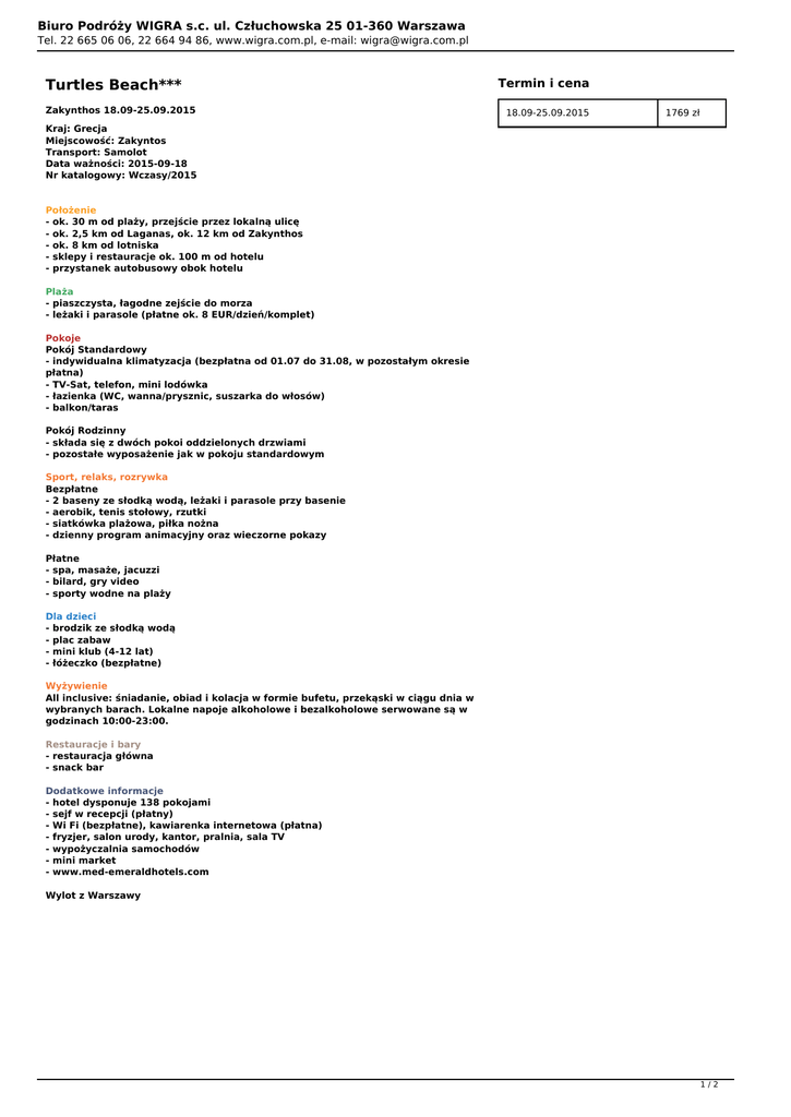 Biuro Podróży WIGRA s.c. ul. Człuchowska 25 01-360 Warszawa Tel. 22 665 06 06, 22 664 94 86, www.wigra.com.pl, e-mail: [email protected] Turtles Beach*** Zakynthos 18.09-25.09.2015 Termin i cena 18.09-25.09.2015 1769 zł Kraj: Grecja Miejscowość: Zakyntos Transport: Samolot Data ważności: 2015-09-18 Nr katalogowy: Wczasy/2015 Położenie - ok. 30 m od plaży, przejście przez lokalną ulicę - ok. 2,5 km od Laganas, ok. 12 km od Zakynthos - ok. 8 km od lotniska - sklepy i restauracje ok. 100 m od hotelu - przystanek autobusowy obok hotelu Plaża - piaszczysta, łagodne zejście do morza - leżaki i parasole (płatne ok. 8 EUR/dzień/komplet) Pokoje Pokój Standardowy - indywidualna klimatyzacja (bezpłatna od 01.07 do 31.08, w pozostałym okresie płatna) - TV-Sat, telefon, mini lodówka - łazienka (WC, wanna/prysznic, suszarka do włosów) - balkon/taras Pokój Rodzinny - składa się z dwóch pokoi oddzielonych drzwiami - pozostałe wyposażenie jak w pokoju standardowym Sport, relaks, rozrywka Bezpłatne - 2 baseny ze słodką wodą, leżaki i parasole przy basenie - aerobik, tenis stołowy, rzutki - siatkówka plażowa, piłka nożna - dzienny program animacyjny oraz wieczorne pokazy Płatne - spa, masaże, jacuzzi - bilard, gry video - sporty wodne na plaży Dla dzieci - brodzik ze słodką wodą - plac zabaw - mini klub (4-12 lat) - łóżeczko (bezpłatne) Wyżywienie All inclusive: śniadanie, obiad i kolacja w formie bufetu, przekąski w ciągu dnia w wybranych barach. Lokalne napoje alkoholowe i bezalkoholowe serwowane są w godzinach 10:00-23:00. Restauracje i bary - restauracja główna - snack bar Dodatkowe informacje - hotel dysponuje 138 pokojami - sejf w recepcji (płatny) - Wi Fi (bezpłatne), kawiarenka internetowa (płatna) - fryzjer, salon urody, kantor, pralnia, sala TV - wypożyczalnia samochodów - mini market - www.med-emeraldhotels.com Wylot z Warszawy 1/2 Biuro Podróży WIGRA s.c. ul. Człuchowska 25 01-360 Warszawa Tel. 22 665 06 06, 22 664 94 86, www.wigra.com.pl, e-mail: [email protected] 2/2 Powered by TCPDF (www.tcpdf.org)