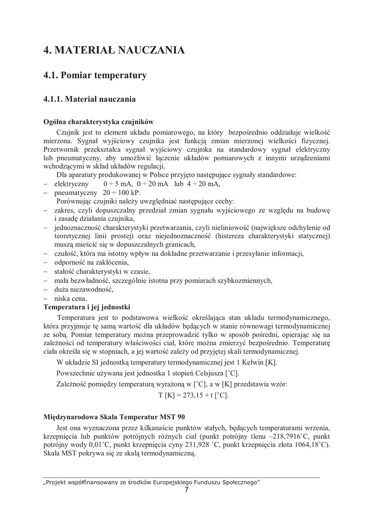 4. MATERIAŁ NAUCZANIA 4.1. Pomiar temperatury 4.1.1. Materiał nauczania Ogólna charakterystyka czujników Czujnik jest to element układu pomiarowego, na który bezpośrednio oddziałuje wielkość mierzona. Sygnał wyjściowy czujnika jest funkcją zmian mierzonej wielkości fizycznej. Przetwornik przekształca sygnał wyjściowy czujnika na standardowy sygnał elektryczny lub pneumatyczny, aby umoŜliwić łączenie układów pomiarowych z innymi urządzeniami wchodzącymi w skład układów regulacji. Dla aparatury produkowanej w Polsce przyjęto następujące sygnały standardowe: − elektryczny 0 ÷ 5 mA, 0 ÷ 20 mA lub 4 ÷ 20 mA, − pneumatyczny 20 ÷ 100 kP. Porównując czujniki naleŜy uwzględniać następujące cechy: − zakres, czyli dopuszczalny przedział zmian sygnału wyjściowego ze względu na budowę i zasadę działania czujnika, − jednoznaczność charakterystyki przetwarzania, czyli nieliniowość (największe odchylenie od teoretycznej linii prostej) oraz niejednoznaczność (histereza charakterystyki statycznej) muszą mieścić się w dopuszczalnych granicach, − czułość, która ma istotny wpływ na dokładne przetwarzanie i przesyłanie informacji, − odporność na zakłócenia, − stałość charakterystyki w czasie, − mała bezwładność, szczególnie istotna przy pomiarach szybkozmiennych, − duŜa niezawodność, − niska cena. Temperatura i jej jednostki Temperatura jest to podstawowa wielkość określająca stan układu termodynamicznego, która przyjmuje tę samą wartość dla układów będących w stanie równowagi termodynamicznej ze sobą. Pomiar temperatury moŜna przeprowadzić tylko w sposób pośredni, opierając się na zaleŜności od temperatury właściwości ciał, które moŜna zmierzyć bezpośrednio. Temperaturę ciała określa się w stopniach, a jej wartość zaleŜy od przyjętej skali termodynamicznej. W układzie SI jednostką temperatury termodynamicznej jest 1 Kelwin [K]. Powszechnie uŜywana jest jednostka 1 stopień Celsjusza [˚C]. ZaleŜność pomiędzy temperaturą wyraŜoną w [˚C], a w [K] przedstawia wzór: T [K] = 273,15 + t [˚C]. Międzynarodowa Skala Temperatur MST 90 Jest ona wyznaczona przez kilkanaście punktów stałych, będących temperaturami wrzenia, krzepnięcia lub punktów potrójnych róŜnych ciał (punkt potrójny tlenu –218,7916˚C, punkt potrójny wody 0,01˚C, punkt krzepnięcia cyny 231,928 ˚C, punkt krzepnięcia złota 1064,18˚C). Skala MST pokrywa się ze skalą termodynamiczną. „Projekt współfinansowany ze środków Europejskiego Funduszu Społecznego” 7 Podział i przeznaczenie czujników temperatury Stosowane są stykowe i bezstykowe metody pomiarów temperatury. WyróŜnia się następujące rodzaje termometrów: 1. stykowe (wymagane jest, aby czujnik bezpośrednio stykał się z mierzonym obiektem): - rozszerzalnościowe: cieczowe i metaliczne (bimetaliczne i dylatacyjne), - ciśnieniowe (manometryczne): cieczowe, gazowe, parowe, - oporowe (rezystancyjne): metalowe, półprzewodnikowe (termistory), - termoelektryczne; 2. bezstykowe (czujnik nie styka się z mierzonym obiektem): - pirometryczne: radiacyjne, monochromatyczne, bichromatyczne. Tabela 1. Zakresy pomiarowe termometrów Rodzaj termometru Zakres pomiarowy (˚C) Rozszerzalnościowy -200 ÷ 1000 Manometryczny -160 ÷ 600 Rezystancyjny (oporowy) -200 ÷ 850 Termoelektryczny -200 ÷ 1700 Pirometr -100 ÷ 5000 Termometry rozszerzalnościowe W termometrach rozszerzalnościowych cieczowych szklanych (rys.1) wykorzystuje się zjawisko rozszerzalności cieczy termometrycznej od temperatury. Ciecze te charakteryzują się duŜym współczynnikiem rozszerzalności objętościowej, temperatury ich krzepnięcia i wrzenia znajdują się poza zakresem pomiarowym oraz niezwilŜają szkła (rtęć) albo słabo zwilŜają (alkohol, pentan, toluen). Rys. 1. Termometr cieczowy szklany [5, s. 80] W termometrach rozszerzalnościowych metalicznych wykorzystuje się zjawisko róŜnicy temperaturowej rozszerzalności dwóch materiałów: − w dylatacyjnych (rys. 2): pręt -1 z materiału o małym liniowym współczynniku rozszerzalności liniowej αp (porcelana, kwarc, inwar) znajduje się w tulei -2 z materiału o duŜym współczynniku rozszerzalności liniowej αt (glin, miedź, nikiel); „Projekt współfinansowany ze środków Europejskiego Funduszu Społecznego” 8 l = l0 (αt – αp) ∆T, gdzie: l0 czynna długość pręta i tulei Rys. 2. Zasada działania termometru dylatacyjnego [12 s. 75] − w bimetalowych (rys.3): płytka lub taśma składająca się z dwóch połączonych ze sobą warstw metali o róŜnych współczynnikach rozszerzalności liniowej, zamocowana jest jednym końcem nieruchomo; drugi koniec swobodny (przez odpowiedni układ mechanizmów połączony ze wskazówką) ulega odkształceniu pod wpływem temperatury. Element bimetaliczny jest przewaŜnie zwinięty w kształcie spirali. Rys. 3. Zasada działania termometru bimetalicznego w temperaturze: a) podwyŜszonej, b) normalnej, c) obniŜonej [6, s. 110] Termometry ciśnieniowe W termometrach ciśnieniowych (manometrycznych) wykorzystano zasadę, ze przy stałej objętości ciśnienie gazu lub cieczy zaleŜy od temperatury (rys. 4).W zaleŜności od uŜytego czynnika termometrycznego moŜna je podzielić na: − cieczowe (układ pomiarowy wypełniony rtęcią), − gazowe (układ pomiarowy wypełniony azotem), − kondensacyjne (czujnik wypełniony częściowo cieczą o niskiej temperaturze wrzenia acetonem - a częściowo parą nasyconą, reszta układu parą nasyconą lub cieczą pośredniczącą - gliceryną). Rys. 4. Termometr manometryczny: 1 – czujnik, 2 – kapilara, 3 – manometr [6, s. 111] Termometry oporowe W termometrach oporowych (rezystancyjnych) zasada ich działania wykorzystuje zaleŜności rezystancji niektórych metali i półprzewodników od temperatury. W pewnym zakresie „Projekt współfinansowany ze środków Europejsk