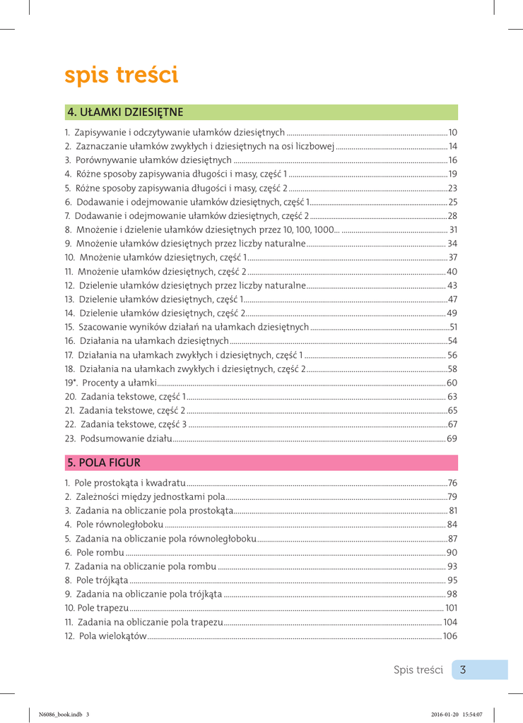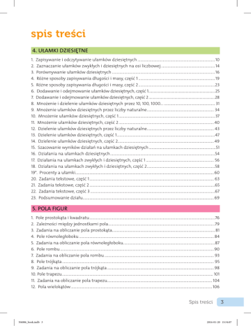 spis treści 4. UŁAMKI DZIESIĘTNE 1. Z apisywanie i odczytywanie ułamków dziesiętnych...................................................................................10 2. Zaznaczanie ułamków zwykłych i dziesiętnych na osi liczbowej.......................................................... 14 3. Porównywanie ułamków dziesiętnych..............................................................................................................16 4. Różne sposoby zapisywania długości i masy, część 1..................................................................................19 5. Różne sposoby zapisywania długości i masy, część 2..................................................................................23 6. Dodawanie i odejmowanie ułamków dziesiętnych, część 1.............................................................................25 7. Dodawanie i odejmowanie ułamków dziesiętnych, część 2.............................................................................28 8. Mnożenie i dzielenie ułamków dziesiętnych przez 10, 100, 1000…....................................................... 31 9. Mnożenie ułamków dziesiętnych przez liczby naturalne........................................................................ 34 10. Mnożenie ułamków dziesiętnych, część 1.......................................................................................................37 11. Mnożenie ułamków dziesiętnych, część 2...................................................................................................... 40 12. Dzielenie ułamków dziesiętnych przez liczby naturalne........................................................................ 43 13. Dzielenie ułamków dziesiętnych, część 1.........................................................................................................47 14. Dzielenie ułamków dziesiętnych, część 2....................................................................................................... 49 15. Szacowanie wyników działań na ułamkach dziesiętnych........................................................................51 16. Działania na ułamkach dziesiętnych................................................................................................................54 17. Działania na ułamkach zwykłych i dziesiętnych, część 1......................................................................... 56 18. Działania na ułamkach zwykłych i dziesiętnych, część 2.........................................................................58 19*. Procenty a ułamki....................................................................................................................................................60 20. Zadania tekstowe, część 1..................................................................................................................................... 63 21. Zadania tekstowe, część 2......................................................................................................................................65 22. Zadania tekstowe, część 3.....................................................................................................................................67 23. Podsumowanie działu............................................................................................................................................69 5. POLA FIGUR 1. P ole prostokąta i kwadratu......................................................................................................................................76 2. Zależności między jednostkami pola..................................................................................................................79 3. Zadania na obliczanie pola prostokąta.............................................................................................................. 81 4. Pole równoległoboku................................................................................................................................................ 84 5. Zadania na obliczanie pola równoległoboku..................................................................................................87 6. Pole rombu....................................................................................................................................................................90 7. Zadania na obliczanie pola rombu..................................................................................................................... 93 8. Pole trójkąta.................................................................................................................................................................. 95 9. Zadania na obliczanie pola trójkąta..................................................................................................................98 10. Pole trapezu................................................................................................................................................................. 101 11. Zadania na obliczanie pola trapezu................................................................................................................ 104 12. Pola wielokątów....................................................................................................................................................... 106 Spis treści N6086_book.indb 3 3 2016-01-20 15:54:07 13. Z adania na obliczanie pól wielokątów........................................................................................................... 110 14. Zadania praktyczne na obliczanie pól wielokątów...................................................................................114 15. Podsumowanie działu.............................................................................................................................................117 