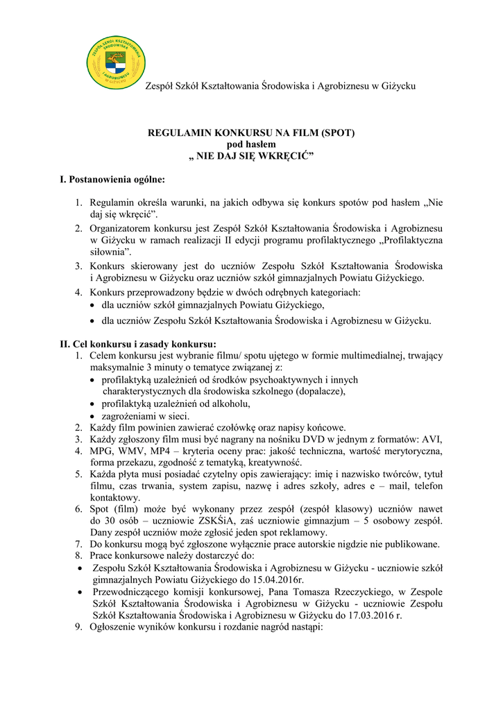 Zespół Szkół Kształtowania Środowiska i Agrobiznesu w Giżycku REGULAMIN KONKURSU NA FILM (SPOT) pod hasłem „ NIE DAJ SIĘ WKRĘCIĆ” I. Postanowienia ogólne: 1. Regulamin określa warunki, na jakich odbywa się konkurs spotów pod hasłem „Nie daj się wkręcić”. 2. Organizatorem konkursu jest Zespół Szkół Kształtowania Środowiska i Agrobiznesu w Giżycku w ramach realizacji II edycji programu profilaktycznego „Profilaktyczna siłownia”. 3. Konkurs skierowany jest do uczniów Zespołu Szkół Kształtowania Środowiska i Agrobiznesu w Giżycku oraz uczniów szkół gimnazjalnych Powiatu Giżyckiego. 4. Konkurs przeprowadzony będzie w dwóch odrębnych kategoriach: dla uczniów szkół gimnazjalnych Powiatu Giżyckiego, dla uczniów Zespołu Szkół Kształtowania Środowiska i Agrobiznesu w Giżycku. II. Cel konkursu i zasady konkursu: 1. Celem konkursu jest wybranie filmu/ spotu ujętego w formie multimedialnej, trwający maksymalnie 3 minuty o tematyce związanej z: profilaktyką uzależnień od środków psychoaktywnych i innych charakterystycznych dla środowiska szkolnego (dopalacze), profilaktyką uzależnień od alkoholu, zagrożeniami w sieci. 2. Każdy film powinien zawierać czołówkę oraz napisy końcowe. 3. Każdy zgłoszony film musi być nagrany na nośniku DVD w jednym z formatów: AVI, 4. MPG, WMV, MP4 – kryteria oceny prac: jakość techniczna, wartość merytoryczna, forma przekazu, zgodność z tematyką, kreatywność. 5. Każda płyta musi posiadać czytelny opis zawierający: imię i nazwisko twórców, tytuł filmu, czas trwania, system zapisu, nazwę i adres szkoły, adres e – mail, telefon kontaktowy. 6. Spot (film) może być wykonany przez zespół (zespół klasowy) uczniów nawet do 30 osób – uczniowie ZSKŚiA, zaś uczniowie gimnazjum – 5 osobowy zespół. Dany zespół uczniów może zgłosić jeden spot reklamowy. 7. Do konkursu mogą być zgłoszone wyłącznie prace autorskie nigdzie nie publikowane. 8. Prace konkursowe należy dostarczyć do: Zespołu Szkół Kształtowania Środowiska i Agrobiznesu w Giżycku - uczniowie szkół gimnazjalnych Powiatu Giżyckiego do 15.04.2016r. Przewodniczącego komisji konkursowej, Pana Tomasza Rzeczyckiego, w Zespole Szkół Kształtowania Środowiska i Agrobiznesu w Giżycku - uczniowie Zespołu Szkół Kształtowania Środowiska i Agrobiznesu w Giżycku do 17.03.2016 r. 9. Ogłoszenie wyników konkursu i rozdanie nagród nastąpi: dla uczniów Zespołu Szkół Kształtowania Środowiska i Agrobiznesu w Giżycku w dniu 21 marca 2016 r. – podsumowanie II edycji programu „Profilaktyczna siłownia”, dla uczniów szkół gimnazjalnych Powiatu Giżyckiego – 15.04.2016 r. w auli Zespołu Szkół Kształtowania Środowiska i Agrobiznesu w Giżycku. 10. Praca konkursowa nie może naruszać praw osób trzecich, przepisów prawa oraz musi być zgodna z normami obyczajowymi. 11. W przypadku niepełnoletnich uczestników konkursu, do pracy załączone winno być oświadczenie jednego z rodziców lub opiekunów prawnych, wyrażające zgodę na udział konkursie na zasadach określonych w regulaminie. 12. Uczestnik konkursu udziela organizatorowi bezterminowej i nieodpłatnej zgody na korzystanie z prac konkursowych w celach profilaktyczno - edukacyjnych, z podaniem imienia i nazwiska autora oraz miejscowości zamieszkania, stosownie do potrzeb organizatora, między innymi na stronie internetowej organizatora. 13. Organizator zastrzega sobie prawo do wykluczenia z konkursu prac sprzecznych z przepisami prawa, zasadami etyki lub z innych względów sprawiających, że nie nadają się one do publicznej prezentacji. III. Ocena i nagrody: 1. Oceny prac konkursowych dokona powołane przez organizatora Jury, którego zadaniem będzie wybór laureatów konkursu. Decyzje Jury są ostateczne i nie przysługuje od nich odwołanie. 2. Jury może przyznać nagrody za I, II, III miejsce – laureaci konkursu. 3. Laureaci konkursu otrzymują cenne nagrody: 4. Uczniom Zespołu Szkół Kształtowania Środowiska i Agrobiznesu w Giżycku dodatkowo przypadną nagrody: I miejsce – 3 wybrane przez zespół uczniów dni „luzu w szkole” (dzień bez prac domowych, kartkówek odpowiedzi i prac klasowych). II miejsce – 2 wybrane przez zespół uczniów dni „luzu w szkole” (dzień bez prac domowych, kartkówek odpowiedzi i prac klasowych). III miejsce – 1 wybrany przez zespół uczniów dzień „luzu w szkole” (dzień bez prac domowych, kartkówek odpowiedzi i prac klasowych). IV. Postanowienia końcowe: 1. Regulamin niniejszego konkursu dostępny jest na stronie internetowej ZSKŚiA w Giżycku. 2. Organizator zastrzega sobie prawo zmiany Regulaminu, jeżeli nie wpłynie to na pogorszenie uczestnictwa w konkursie. 3. Osoby, które nie spełnią któregokolwiek z wymogów określonych w niniejszym Regulaminie lub podadzą nieprawdziwe informacje, zostaną automatycznie zdyskwalifikowane. 4. Dane osobowe uczestników konkursu będą chronione zgodnie z Ustawą o ochronie danych osobowych (Dz.U. z 2014 poz. 1182). Uczestnikowi przysługuje prawo wglądu/dostępu do swoich danych osobowych oraz ich poprawiania. Osoba kontaktowa: Edyta Trościanko – tel: 697 282 484 Załącznik nr 1 Oświadczenie rodzica/opiekuna Ja niżej podpisany(a)………………………………………………………………………… zamieszkały (a)……………………………………………………………………………… w związku z ustawą z dnia 29.08.1997 roku o ochronie danych osobowych (Dz.U. Nr 133,poz.883) wyrażam zgodę na wykorzystanie danych osobowych mojego dziecka: ……………………………………………………………………………………………… (imię i nazwisko) w celach związanych z Powiatowym Konkursem Profilaktycznym „ Nie daj się wkręcić”. ………………………………………………………………………………………