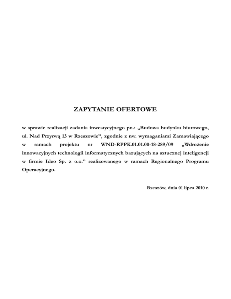 ZAPYTANIE OFERTOWE w sprawie realizacji zadania inwestycyjnego pn.: „Budowa budynku biurowego, ul. Nad Przyrwą 13 w Rzeszowie”, zgodnie z nw. wymaganiami Zamawiającego w ramach projektu nr WND-RPPK.01.01.00-18-289/09 „Wdrożenie innowacyjnych technologii informatycznych bazujących na sztucznej inteligencji w firmie Ideo Sp. z o.o.” realizowanego w ramach Regionalnego Programu Operacyjnego. Rzeszów, dnia 01 lipca 2010 r. I. Dane Zamawiającego: Ideo Sp. z o.o. z siedzibą w Rzeszowie przy ul. Nad Przyrwą 13, 35-234 Rzeszów, wpisana do Krajowego Rejestru Sądowego pod numerem 0000258459 prowadzonego przez Sąd Rejonowy w Rzeszowie, XII Wydział Gospodarczy KRS NIP: 517 017 81 88, REGON: 180140253, Dokładny adres do korespondencji: Ideo Sp. z o.o. z siedzibą w Rzeszowie przy ul. Nad Przyrwą 13, 35-234 Rzeszów, e-mail: [email protected]; Osobą uprawnioną do porozumiewania się z Wykonawcami jest: Arkadiusz Michno, tel. 17/ 86 021 86 , e-mail: [email protected] II. Opis przedmiotu zamówienia: 1. Przedmiotem zamówienia jest realizacja zadania inwestycyjnego pn.: „Budowa budynku biurowego, ul. Nad Przyrwą 13 w Rzeszowie” o powierzchni użytkowej 766,15 m2 wraz z infrastrukturą wewnętrzną oraz przebudowa budynku istniejącego zgodnie z projektem budowlanym i wykonawczym zatwierdzonymi pozwoleniem na budowę z dnia 18.08.2008r. wydanego przez Prezydenta Miasta Rzeszowa znak AR.I.51.7353/58/603/08 oraz przedmiarem robót. Ww. pozwolenie na budowę, projekt budowlany i wykonawczy oraz przedmiar robót stanowią załącznik nr 1 do niniejszego zapytania ofertowego dostępne dla oferentów na etapie składania ofert do wglądu w siedzibie Zamawiającego . 2. Przedmiotem zamówienia objęta jest całość prac wynikająca z projektu budowlanego i wykonawczego oraz warunków pozwolenia na budowę, a w szczególności: - Roboty budowlane przygotowawcze - Roboty budowlane stanu „ZERO” - Konstrukcja i roboty murowe powyżej „ZERO” - Roboty wykończeniowe wewnętrzne - Roboty wykończeniowe zewnętrzne – nowy budynek - Roboty wykończeniowe zewnętrzne – elewacja budynku istniejącego - Wykonanie instalacji elektrycznej wewnętrznej oraz sieci logicznych - Wykonanie instalacji klimatyzacyjnej - Wykonanie instalacji sanitarnych - Roboty związane z zagospodarowaniem terenu. III. Termin wykonania zamówienia: 1. Umowa na realizację przedmiotu zamówienia zostanie zawarta nie później niż w ciągu 21 dni od daty wskazanej jako ostateczny termin składania ofert. Umowa zostanie zawarta na podstawie wzoru umowy stanowiącego załącznik nr 2 do niniejszego zapytania ofertowego. 2. Przedmiot ww. umowy winien zostać zrealizowany nie później niż do 30 listopada 2011 r.. Kara umowna za każdy dzień opóźnienia w realizacji umowy wynosić będzie 0,1 % wynagrodzenia umownego. IV. Opis sposobu przygotowania i złożenia oferty: 1. Każdy Oferent może przedstawić tylko jedną ofertę. Nie dopuszcza się składania ofert częściowych. 2. Wszystkie koszty związane z przedmiotem zamówienia muszą mieć odzwierciedlenie w treści złożonej ofercie. Nie dopuszcza się ponoszenia dodatkowych kosztów przez Zamawiającego na etapie prac nad przedmiotem zamówienia (w szczególności Zamawiający nie może być obciążony dodatkowymi kosztami związanymi z dostępem do mediów). Oferenci zobowiązani są zapoznać się dokładnie z informacjami zawartymi w Zapytaniu Ofertowym i przygotować ofertę zgodnie z wymaganiami określonymi w tym dokumencie. Oferenci ponoszą wszelkie koszty własne związane z przygotowaniem i złożeniem oferty, niezależnie od wyniku Postępowania - Zamawiający w żadnym przypadku nie odpowiada za koszty poniesione przez Oferentów w związku z przygotowaniem i złożeniem oferty, a złożenie oferty jest równoznaczne ze zgodą na powyższe. Oferta powinna być sporządzona w języku polskim, na maszynie do pisania, komputerze lub inną trwałą, czytelną techniką. 3. Na ofertę składają się następujące dokumenty: a) Dokument ofertowy - oferent przedstawi w nim swoją ofertę zgodnie z wymogami określonymi w niniejszym Zapytaniu Ofertowym. Oferta musi być podpisana (czytelnie lub z pieczątką imienną) przez osoby uprawnione do reprezentacji Oferenta; wszelkie poprawki lub zmiany w tekście oferty muszą być naniesione w sposób czytelny, datowane i podpisane przez osobę upoważnioną. Oferta winna zawierać wskazanie całkowitego wynagrodzenia netto Oferenta za świadczone usługi na rzecz Zamawiającego w złotych polskich - powiększone o należny podatek VAT. Oferent wyceniając przedmiot zamówienia/przetargu powinien określić wysokość wynagrodzenia w sposób ryczałtowy. Jednakże oferent zobowiązany jest w ofercie wskazać obok wynagrodzenia za wykonanie całości przedmiotu umowy również koszt wykonania poszczególnych etapów prac. b) Oświadczenia i dokumenty potwierdzające, że Oferent spełnia ew. warunki szczegółowe udziału w postępowaniu, wskazane w Zapytaniu Ofertowym c) Dodatkowe załączniki, potwierdzające wiarygodność i kompetencje Oferenta: i. ii. iii. w oryginalne lub poświadczone przez osoby uprawnione do reprezentacji wykonawcy: aktualny odpis z KRS lub Ewidencji Działalności Gospodarczej dot. Oferenta; zaświadczenie o nadaniu nr NIP i REGON certyfikaty, kopie dyplomów i innych dokumentów potwierdzające umiejętności potrzebne do wykonania przedmiotu zamówienia; pisemne oświadczenie Oferenta, że posiada niezbędną do wykonania zamówienia wiedzę i doświadczenie, potencjał ekonomiczny i techniczny, a także pracowników zdolnych do wykonania zamówienia oraz, że znajduje się w sytuacji finansowej zapewniającej wykonanie zamówienia; pisemne oświadczenie Oferenta, iż nie wszczęto w stosunku do niego postępowania upadłościowego. 4. Ofertę należy przedłożyć za pośrednictwem poczty tradycyjnej lub elektronicznej bądź też osobiście, na adres wskazany w punkcie I