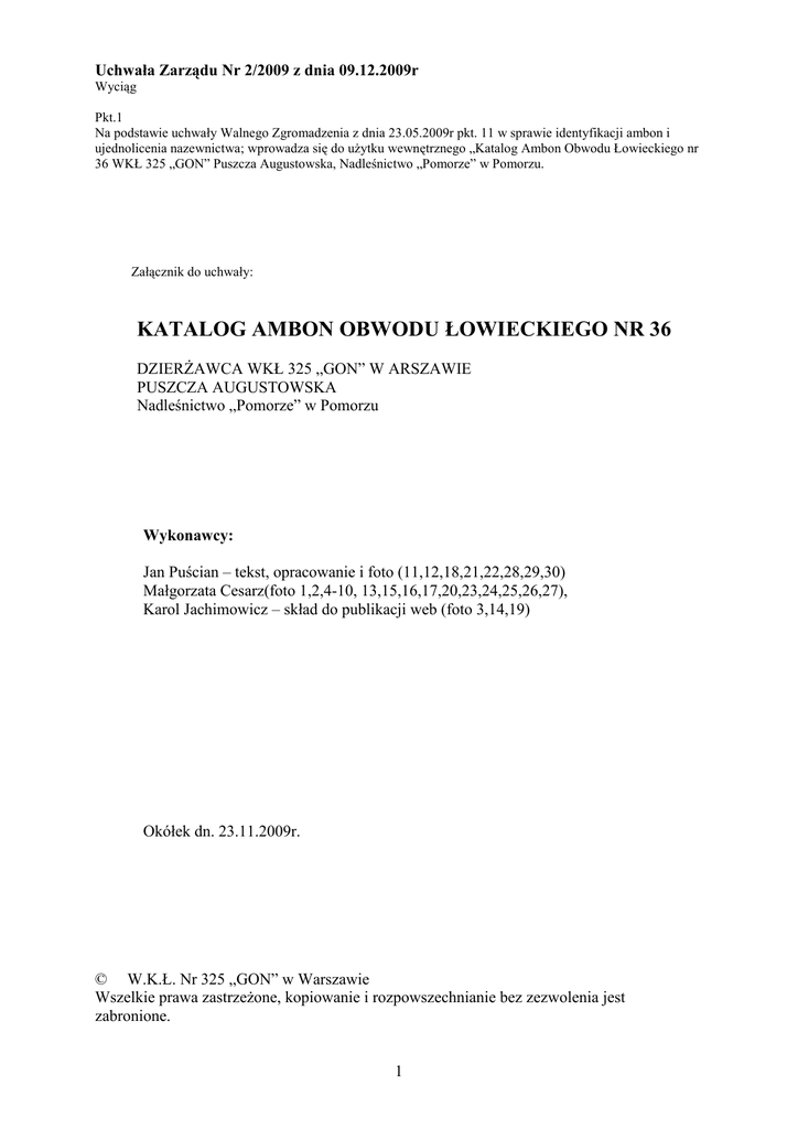 Uchwała Zarządu Nr 2/2009 z dnia 09.12.2009r Wyciąg Pkt.1 Na podstawie uchwały Walnego Zgromadzenia z dnia 23.05.2009r pkt. 11 w sprawie identyfikacji ambon i ujednolicenia nazewnictwa; wprowadza się do uŜytku wewnętrznego „Katalog Ambon Obwodu Łowieckiego nr 36 WKŁ 325 „GON” Puszcza Augustowska, Nadleśnictwo „Pomorze” w Pomorzu. Załącznik do uchwały: KATALOG AMBON OBWODU ŁOWIECKIEGO NR 36 DZIERśAWCA WKŁ 325 „GON” W ARSZAWIE PUSZCZA AUGUSTOWSKA Nadleśnictwo „Pomorze” w Pomorzu Wykonawcy: Jan Puścian – tekst, opracowanie i foto (11,12,18,21,22,28,29,30) Małgorzata Cesarz(foto 1,2,4-10, 13,15,16,17,20,23,24,25,26,27), Karol Jachimowicz – skład do publikacji web (foto 3,14,19) Okółek dn. 23.11.2009r. © W.K.Ł. Nr 325 „GON” w Warszawie Wszelkie prawa zastrzeŜone, kopiowanie i rozpowszechnianie bez zezwolenia jest zabronione. 1 Spis treści .......................................... str. 2 Wykaz ambon ................................... str. 3 Opis ambon ....................................... str. 4- 9 Uwagi dla wykonujących prace naprawcze str. 9 2 WYKAZ AMBON: 1. Majak 2. DrąŜkowa 3. śarnowa 4. Skubisa 5. Janczulka 6. Janczulka łąka 7. Za Rzeczką 8. Reńka 9. Długa Luka 10. Puchanne 11. Puchanne w świerkach 12. Wilcza 13. 913 14. Pod wywróconym dębem 15. Falkowskiego 16. Nad rowem 17. Sumowszczyzna 18. Łąka I 19. Łąka II 20. Krywelek 21. Marycha 22. Wysmał 23. Rzepa 24. Pawlusiaki 25. Małe Pawlusiaki 26. Niska Barć 27. Kąty 28. Na szkółce 29. Pławuszczy Róg 30. Komendanta 3 I. Kasyfikacja jakościowa ambon obwodu łowieckiego nr. 36 WKŁ 325 GON. Ambony pod względem jakości dzielą się na całoroczne ( posiadające szczelne kabiny z oszklonymi okienkami) oraz sezonowe – niespełniające wymienionych kryteriów. II. Opis nazewnictwa, połoŜenia oraz stanu technicznego ambon. 1. Majak (łowisko Poproch, leśnictwo Okółek, oddział nr.642 a). Ambona całoroczna bez podestu wejściowego i poręczy bezpieczeństwa przy drabinie. Ambona niebezpieczna takŜe ze względu na ponadprzeciętną wysokość. Wymaga uzupełnienia wykazanych braków. 2. DrąŜkowa ( łowisko Poproch, leśnictwo Okółek, oddział nr.670 b.) Stan techniczny słaby. 3. śarnowa (łowisko śarnowa, leśnictwo Okółek, oddział nr.645 d., fot. nr.3. Ambona sezonowa w dobrym stanie, drabina bez poręczy i podestu wejściowego. 4. Skubisa (łowisko Nasienny, leśnictwo Okółek, odział nr. 648 c). Ambona sezonowa, aktualnie dostosowana do wymogów bezpieczeństwa. W miarę moŜliwości finansowych do pomalowania drewnochronem. 5. Janczulka (łowisko Okółek,, leśnictwo Okółek, odział nr.627 i). Ambona całoroczna, stan techniczny wymagający naprawy. Drabina nie posiada poręczy i podestu wejściowego, dach przecieka, wyłoŜenie wnętrza zmurszałe – do wymiany. 4 6. Janczulka Łąka (łowisko Okółek, leśnictwo Okółek, oddział nr 627 l.). Ambona całoroczna, stan techniczny zadawalający. Wygląd zewnętrzny razi czerwienią środka konserwacyjnego, kabina od strony podejścia do ambony załatana dyktą. Zalecenie – pomalować całość zielonym drewnochronem, dyktę usnąć. 7. Za Rzeczką ( łowisko Klonowe, leśnictwo Okółek, oddział nr.718 b) Ambona całoroczna – bez uwag 8. Reńka (łowisko Okółek, leśnictwo Okółek, oddział nr. 720 a.). Ambona sezonowa w dobrym stanie technicznym, ale wymaga uzupełnienia drabiny poręcz bezpieczeństwa 9. Długa Luka ( łowisko Rzeczka, leśnictwo Dworczysko, oddział nr.796 b) Ambona całoroczna -bez uwag. 10. Puchanne (łowisko Puchanne, leśnictwo Dworczysko, oddział nr.837 h.). Ambona całoroczna, nowa. Brak podestu i poręczy bezpieczeństwa przy drabinie. W pierwszej kolejności uzupełnić te braki i pomalować drewnochronem. 11. Puchanne w świerkach ( łowisko Puchanne, oddział nr.877 a,). Ambona całoroczna , stan techniczny dobry, drabina bez poręczy i bez podestu. 5 12. Wilcza ( łowisko Bagienka, leśnictwo Rygol, oddział nr.933 f,). Ambona całoroczna w dobrym stanie technicznym. 13. 913 (łowisko BroŜane, leśnictwo Dworczysko, oddział nr.913). Ambona całoroczna – bez uwag. 14. Pod wywróconym dębem ( łowisko BroŜane, leśnictwo Rygol, oddział nr.959).Ambona sezonowa bez poręczy. 15. Falkowskiego ( łowisko BroŜane, leśnictwo Rygol, oddział nr.976 i). Ambona wyłączona z eksploatacji z powodu wyjątkowo wysokiego ryzyka wypadku. Aktualnie w trakcie przygotowania do modernizacji. 16. Nad Rowem (łowisko BroŜane, leśnictwo Rygol, oddział nr.997 f.). Ambona sezonowa o słabym stanie technicznym. Zwłaszcza drabina zmurszała. Drabina do wymiany na nową z poręczą bezpieczeństwa oraz do przeglądu i naprawy. Pozostałych elementów konstrukcyjnych takich jak drzwi. (Aktualnie kwalifikuje się do wyłączenia z eksploatacji) 17. Sumowszczyzna ( łowisko Sumowszczyzna, leśnictwo Dworczysko ,oddział nr.920 a). Ambona sezonowa w bardzo złym stanie technicznym. Drabina, nogi i inne elementy w zaawansowanej próchnicy (wymiany lub gruntownego remontu ) 6 18. Łąka I (łowisko Sumowszczyzna, leśnictwo Dworczysko, oddział 883 c). Ambona drąŜkowa, sezonowa , stan techniczny słaby, drabina bez poręczy i bez podestu. 19. Łąka II (łowisko Sumowszczayzna , leśnictwo Dworczysko, oddział nr.920b). Ambona sezonowa bez poręczy. 20. Krywelek ( łowisko Krywelek, leśnictwo Rygol, oddział nr.961 a.). Ambona całoroczna w dobrym stanie. Wygląd razi nie pełnym pomalowaniem. Przy najbliŜszej okazji pomalować na zielono całą ambonę . 21. Marycha (łowisko Marycha, leśnictwo Szlamy, oddział nr.1024j) Ambona całoroczna zamykana na klucz, o specjalnym standardzie, w dobrym stanie technicznym, drabina bez poręczy i bez podestu. 22. Wysmał (łowisko Wysmał, leśnictwo Szlamy, oddział 1048c). Ambona całoroczna, stan techniczny zbliŜony do stanu ambon nr. 28,29,30, bez poręczy i bez podestu. Górna część drabiny nie przylega do kabiny. 23