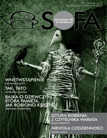 nr 12 • kwiecień 2016 dwumiesięcznik • ISSN 2449-6375 UKŁADAMY SIĘ W SŁOWA(ch) Wnetwstąpienie Jan Maszczyszyn Tak, tato Agnieszka Olewicz Bajka o dziewczynce, która pamięta, jak robiono księżyc Weronika Stępkowska Sztuka robienia z czytelnika wariata Anna Karowicz Niewola codzienności Magda ZimnA wstępniak Z awsze to miło wiedzieć, że o „SOFIE” się mówi. Dosyć niedawno w „Nowej Fantastyce” ukazał się tekst, w którym autor przeanalizował wycinek e-zinów (i nie tylko) funkcjonujących w sieci. Wśród nich znalazła się również „SOFA”. Liczba lajków na Facebooku – które dla twórcy felietonu są jednym ze stempli świadczących o atrakcyjności pisma – tak naprawdę nie jest miarodajnym wyznacznikiem tego, jak wiele osób lubiących stronę zalicza się do grona stałych czytelników. Aczkolwiek zawsze lepiej mieć więcej niż mniej, bo być może dzięki temu grono się powiększy, dlatego oddaję autorowi, co jego, zwłaszcza jeśli chodzi o kwestię promocji naszego dwumiesięcznika. Dyskusja ciekawa i poruszająca wiele istotnych wątków – odsyłam do „Nowej Fantastyki”! Zostając w klimatach reklamowych – szukamy czarodzieja, który dołączy do naszej redakcji i porzuca trochę zaklęć w dziale promocyjnym. Gdybym miała trochę więcej czasu, to chętnie osobiście zajęłabym się współpracą z wydawnictwami i blogerami, żeby nawiązać kontakty, ale niestety… Doba ma tylko 24h. Warto więc skorzystać. Rekrutacja trwa do końca kwietnia. Szczerze zapraszam. Więcej na naszym fanpage’u. Tak jak obiecaliśmy, wyniki konkursu Walę tynkowego znajdziecie na str. 15. Jeszcze raz serdecznie gratulujemy wszystkim Uczestnikom! UKŁADAMY SIĘ I na koniec ostatni smaczek, bo mi się miejsce kończy – w dziale publicystyki pojawił się nowy sektor, strefa, zona, miejsce kultu literackiego na trochę innych zasadach: SOFOWICZE OPINIUJĄ. Znajdziecie tam miniopinie na temat przeróżnych książek. I tych nowych, i tych trochę starszych. Chcemy ów dział utrzymać już do końca, dlatego wszystko zależy od Was, drodzy SOFOWICZE, i od Waszych krótkich recenzji, które wypełnią stronę w czasopiśmie. Możecie je podsyłać na nasz e-mail: kontakt@sofadwumiesięcznik.pl lub w wiadomości prywatnej na Facebooku. Do następnego – w czerwcu! W SŁOWA(CH) Anna Wąsikowska u k ł a d a m y s i ę w spis treści s ł o w a ( c h ) UKŁADAMY SIĘ W SŁOWA(ch) SOFA 02/2016 (12) REDAKTOR NACZELNA Anna Wąsikowska [email protected] DZIAŁ PROZY Anna Wasińska [email protected] DZIAŁ PUBLICYSTYKI Aneta Rzepka [email protected] SEKRETARIAT/PROMOCJA Paulina Siedlich [email protected] WYDAWCA Anna Wąsikowska, Kraków OKŁADKA Leszek Kostuj OPRACOWANIE GRAFICZNE/DTP Arek Kikulski, Magda Kwasik (Madee), Beata Pytel, Izabela Szymczak, Katarzyna Ślączka, Ewa Światłoczuła WSPÓŁPRACA Anna Dudało, Dariusz Zajączkowski, Anna Karowicz, Mirosław Śliwa, Sylwia Kępa opowiadania • miniatury • proza 5Nic – Grzegorz Bryk 7Bajka o dziewczynce, która pamięta, jak robiono księżyc – Weronika Stępkowska 8 E-mail z załącznikiem – Barbara Marszałek 10 Miłość mojego życia – Sebastian Marks 15WYNIKI KONKURSU 16Wnetwstąpienie – Jan Maszczyszyn 29 Czarny żwir – Dagmara Pieczyńska 30 Nerwowa cisza – Marek Grzywacz 33Siniaki – Kasia Jabłonowska 39 Tak, tato – Agnieszka Olewicz 47 Zatarty trop – Marianna Szygoń publicystyka 65Wapno pościeli. Wokół wiersza Alienacje Pana Cogito Zbigniewa Herberta – Adam Buszek 66Sprawiedliwość – Mirosław Śliwa 69 SOFA PATRONUJE! 70 72 74 76 77 78 Z kamerą wśród dzików – Sebastian Marks Rzeka przemienienia – Michał „Mike” Majewski Ocalałe grusze – Dariusz Zajączkowski Sztuka robienia z czytelnika wariata – Anna Karowicz Poetyckie terapie. Część druga – Sylwia Kępa Niewola codzienności – Magda Zimna 79 SOFOWICZE OPINIUJĄ! 82 GALERIA AUTORÓW 84PATRONATY 3 UKŁADAMY u k ł a d a m y 4 SIĘ s i ę W SŁOWA(CH) w s ł o w a ( c h ) kwiecień (12) 2016 UKŁADAMY SIĘ W SŁOWA(ch) Grzegorz Bryk Nic J akże urocze dźwięki uchodziły spod opuszek o dawno stwardniałym naskórku, szarpiących wprawnie struny gitary. Druga ręka ślizgała się płynnie po gryfie, palce zaś zwinnie niczym odnóża wyjątkowo żwawych robaczków zmieniały akordy, co rusz ozdabiając i wzbogacając melodię zmyślnym legato bądź ekspresyjnym vibrato. Melodia z perfekcyjnie nastrojonego instrumentu odbijała się echem od ścian półmroku. Na jednej z nich małe okno było, a za nim: n i c. Jakoby nie istniało już nic poza tym pokoikiem, skromnie, bo w jednoosobowe drewniane łóżko, nocną szafkę i wiekową komódkę, umeblowanym i bez drzwi żadnych. Płomyk na czubku wpół wypalonej świecy w najlepsze swawolił z melancholijną improwizacją, jaką do życia powoływał wsparty plecami o ścianę i siedzący na podłodze ze skrzyżowanymi nogami twórca. A akordy dalej ulatywały w półmroczną przestrzeń, zadziwiając dźwiękiem doskonałym. Wybrzmiewały, a ludzie wsłuchiwali się w ich zrodzone melancholią piękno. Aż trudno uwierzyć, że anielskiej melodii, która koi każdy nerw ciała, nigdy nie spisano, a jest ona jeno podarunkiem chwili trwającej od wieków. Chwili, w zamierzeniu, bezkresnej, nigdy nie mającej posiąść końca, zrodzonej, by błądzić pośród dusz ludzkich i ich nieśmiertelnych tańców. Nie była to zwykła muzyka, niosła ze sobą pierwiastek narkotycznej, kosmicznej niesamowitości. W jej rytm idee pojawiały się i błądziły pośród alejek pogrążonego zadumą umysłu, odbijały się od ścian labiryntu myśli, tworząc ulotne, skrzące się paletą barw obrazy. Samotny w ciemności wokół mnie cienie przyjaciele odeszli zostawiając samotnego w ciemności umysłu na wieki wieków… 5 opowiadania • miniatury • prozA Fantastyczne dźwięki dalej krążyły pośród półmroków pokoju, zduszone w cia