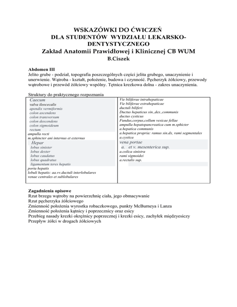 WSKAZÓWKI DO ĆWICZEŃ DLA STUDENTÓW WYDZIAŁU LEKARSKODENTYSTYCZNEGO Zakład Anatomii Prawidłowej i Klinicznej CB WUM B.Ciszek Abdomen III Jelito grube - podział, topografia poszczególnych części jelita grubego, unaczynienie i unerwienie. Wątroba - kształt, położenie, budowa i czynność. Pęcherzyk żółciowy, przewody wątrobowe i przewód żółciowy wspólny. Tętnica krezkowa dolna - zakres unaczynienia. Struktury do praktycznego rozpoznania Caecum valva ileocecalis apendix vermiformis colon ascendens colon transversum colon descendens colon sigmoideum rectum ampulla recti m.sphincter ani internus et externus Hepar lobus sinister lobus dexter lobus caudatus lobus quadratus ligamentum teres hepatis porta hepatis lobuli hepatis: aa.vv.ductuli interlobulares venae centrales et sublobulares Vie biliferae intrahepaticae Vie biliferae extrahepaticae ductuli biliferi Ductus hepaticus sin.,dex.,communis ductus cysticus Fundus,corpus,collum vesicae fellae ampulla hepatopancreatica cum m.sphicter a.hepatica communis a.hepatica propria: ramus sin.dx, rami segmentales a.cystica vena portae a. et v. mesenterica sup. a.colica sinistra rami sigmoidei a.rectalis sup. Zagadnienia opisowe Rzut brzegu wątroby na powierzchnię ciała, jego obmacywanie Rzut pęcherzyka żółciowego Zmienność położenia wyrostka robaczkowego, punkty McBurneya i Lanza Zmienność położenia kątnicy i poprzecznicy oraz esicy Przebieg nasady krezki okrężnicy poprzecznej i krezki esicy, zachyłek międzyesiczy Przepływ żółci w drogach żółciowych