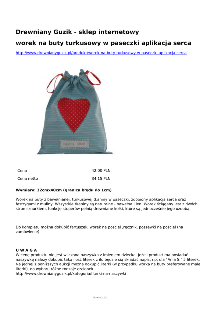 Drewniany Guzik - sklep internetowy worek na buty turkusowy w paseczki aplikacja serca http://www.drewnianyguzik.pl/produkt/worek-na-buty-turkusowy-w-paseczki-aplikacja-serca Cena 42.00 PLN Cena netto 34.15 PLN Wymiary: 32cmx40cm (granica błędu do 1cm) Worek na buty z bawełnianej, turkusowej tkaniny w paseczki, zdobiony aplikacją serca oraz fastrygami z muliny. Wszystkie tkaniny są naturalne - bawełna i len. Worek ściągany jest z dwóch stron sznurkiem, funkcję stoperów pełnią drewniane kołki, które są jednocześnie jego ozdobą. Do kompletu można dokupić fartuszek, worek na pościel ,ręcznik, poszewki na pościel (na zamówienie). UWAGA W cenę produktu nie jest wliczona naszywka z imieniem dziecka. Jeżeli produkt ma posiadać naszywkę należy dokupić taką ilość literek z ilu będzie sią składać napis, np. dla "Ania S." 5 literek. Na jednej z poniższych aukcji można dokupić literki (w przypadku worka na buty preferowane małe literki), do wyboru różne rodzaje czcionek http://www.drewnianyguzik.pl/kategoria/literki-na-naszywki Strona 1 z 2 SKŁAD: 100% bawełna (worek), len + bawełna (aplikacje) Gramatura: około 200 G/M2 INSTRUKCJA OBSŁUGI: Prać w pralce 30°C Nie wybielać Nie suszyć w pralko-suszarce Prasować w wysokiej temperaturze Nie prać chemicznie Strona 2 z 2