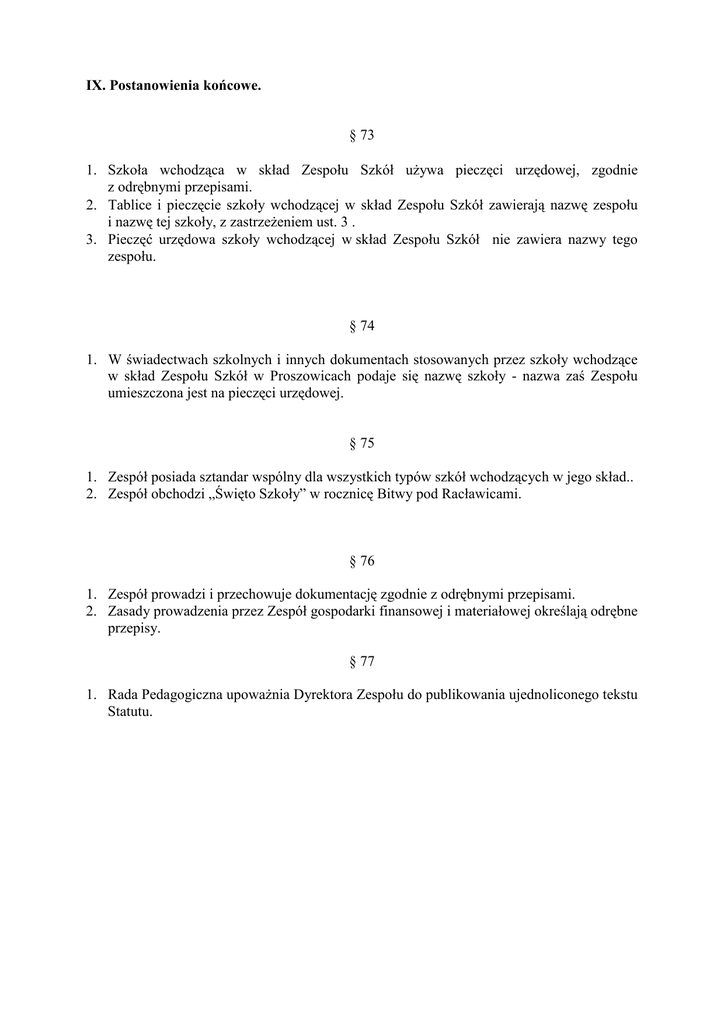 IX. Postanowienia końcowe. § 73 1. Szkoła wchodząca w skład Zespołu Szkół uŜywa pieczęci urzędowej, zgodnie z odrębnymi przepisami. 2. Tablice i pieczęcie szkoły wchodzącej w skład Zespołu Szkół zawierają nazwę zespołu i nazwę tej szkoły, z zastrzeŜeniem ust. 3 . 3. Pieczęć urzędowa szkoły wchodzącej w skład Zespołu Szkół nie zawiera nazwy tego zespołu. § 74 1. W świadectwach szkolnych i innych dokumentach stosowanych przez szkoły wchodzące w skład Zespołu Szkół w Proszowicach podaje się nazwę szkoły - nazwa zaś Zespołu umieszczona jest na pieczęci urzędowej. § 75 1. Zespół posiada sztandar wspólny dla wszystkich typów szkół wchodzących w jego skład.. 2. Zespół obchodzi „Święto Szkoły” w rocznicę Bitwy pod Racławicami. § 76 1. Zespół prowadzi i przechowuje dokumentację zgodnie z odrębnymi przepisami. 2. Zasady prowadzenia przez Zespół gospodarki finansowej i materiałowej określają odrębne przepisy. § 77 1. Rada Pedagogiczna upowaŜnia Dyrektora Zespołu do publikowania ujednoliconego tekstu Statutu.