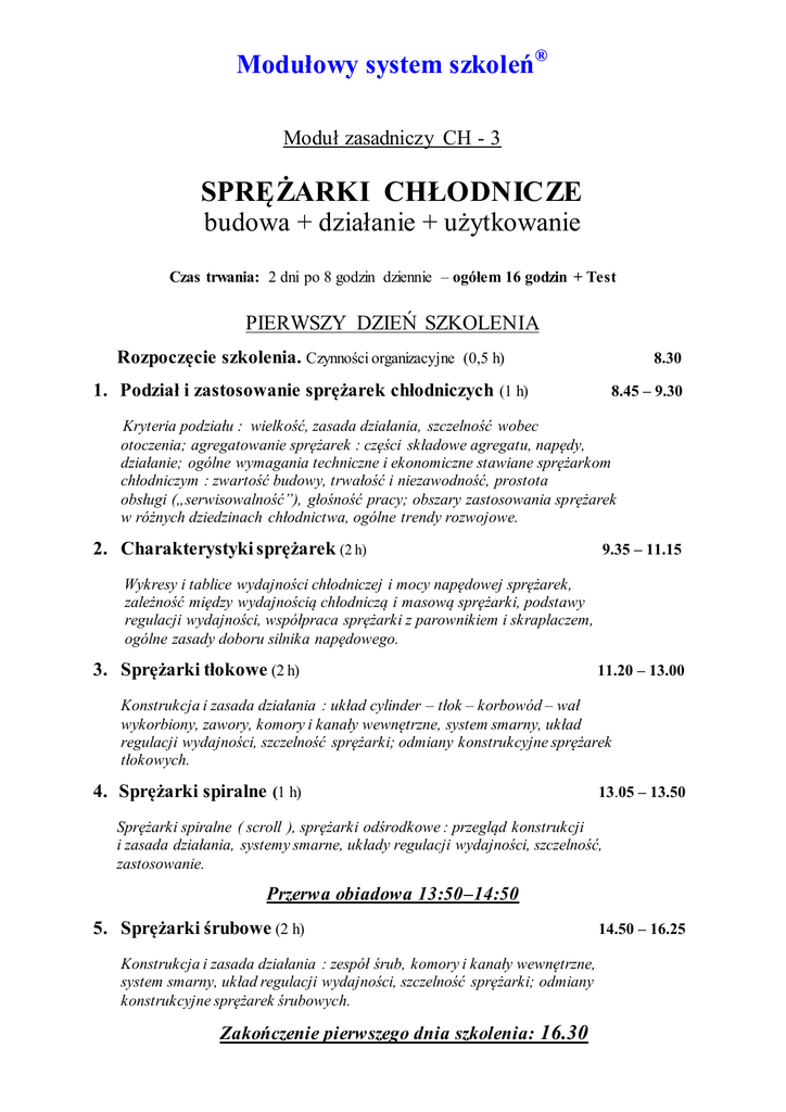 Modułowy system szkoleń® Moduł zasadniczy CH - 3 SPRĘŻARKI CHŁODNICZE budowa + działanie + użytkowanie Czas trwania: 2 dni po 8 godzin dziennie – ogółem 16 godzin + Test PIERWSZY DZIEŃ SZKOLENIA Rozpoczęcie szkolenia. Czynności organizacyjne (0,5 h) 8.30 1. Podział i zastosowanie sprężarek chłodniczych (1 h) 8.45 – 9.30 Kryteria podziału : wielkość, zasada działania, szczelność wobec otoczenia; agregatowanie sprężarek : części składowe agregatu, napędy, działanie; ogólne wymagania techniczne i ekonomiczne stawiane sprężarkom chłodniczym : zwartość budowy, trwałość i niezawodność, prostota obsługi („serwisowalność”), głośność pracy; obszary zastosowania sprężarek w różnych dziedzinach chłodnictwa, ogólne trendy rozwojowe. 2. Charakterystyki sprężarek (2 h) 9.35 – 11.15 Wykresy i tablice wydajności chłodniczej i mocy napędowej sprężarek, zależność między wydajnością chłodniczą i masową sprężarki, podstawy regulacji wydajności, współpraca sprężarki z parownikiem i skraplaczem, ogólne zasady doboru silnika napędowego. 3. Sprężarki tłokowe (2 h) 11.20 – 13.00 Konstrukcja i zasada działania : układ cylinder – tłok – korbowód – wał wykorbiony, zawory, komory i kanały wewnętrzne, system smarny, układ regulacji wydajności, szczelność sprężarki; odmiany konstrukcyjne sprężarek tłokowych. 4. Sprężarki spiralne (1 h) 13.05 – 13.50 Sprężarki spiralne ( scroll ), sprężarki odśrodkowe : przegląd konstrukcji i zasada działania, systemy smarne, układy regulacji wydajności, szczelność, zastosowanie. Przerwa obiadowa 13:50–14:50 5. Sprężarki śrubowe (2 h) Konstrukcja i zasada działania : zespół śrub, komory i kanały wewnętrzne, system smarny, układ regulacji wydajności, szczelność sprężarki; odmiany konstrukcyjne sprężarek śrubowych. Zakończenie pierwszego dnia szkolenia: 16.30 14.50 – 16.25 DRUGI DZIEŃ SZKOLENIA 6. Sprężarki tłokowe – zajęcia praktyczne (1 h) 8.30 – 9.15 Badanie jednostopniowej chłodniczej sprężarki tłokowej. 7. Zasady obsługi agregatów sprężarkowych (3 h) 9:20 – 11:50 Obsługa „ręczna” bezpośrednia : włączenie i wyłączenie ręczne sprężarki; odstawienie sprężarki na czas krótki i długi; konserwacja sprężarek; podstawowe czynności związane z utrzymywaniem sprawności ruchowej sprężarek : wymiana filtrów ssawnego i olejowego ( kryteria i zasady ), wymiana oleju ( kryteria i zasady ), szczelność sprężarek i obsługa dławnicy, specyfika obsługi sprężarek tłokowych i śrubowych, zasady bezpieczeństwa przy obsłudze sprężarek, przestrzeganie instrukcji producenta. 8. Diagnozowanie zaburzeń w pracy agregatów sprężarkowych (2 h) 12:00 – 13:35 Prawidłowe i nieprawidłowe parametry pracy sprężarki ( temperatury i ciśnienia po stronie ssawnej i tłocznej, temperatura i ciśnienie oleju ). Objawy nieprawidłowej pracy sprężarki ( oszronienie, stuki i inne efekty dźwiękowe ), przyczyny i skutki nieprawidłowych parametrów i nieprawidłowych objawów pracy sprężarki; wskazania dotyczące przeciwdziałania negatywnym skutkom oraz usuwanie zaburzeń w pracy. Wpływ zaburzeń w pracy sprężarki na wydajność chłodniczą i na pobór energii. Przerwa obiadowa 13:35–14:30 9. Diagnozowanie zaburzeń w pracy agregatów sprężarkowych – cd. 14:30 – 15:15 (1 h) Zajęcia praktyczne : Ocena pracy sprężarki tłokowej w oparciu o program symulacyjny SPRĘŻARKA. 10. Odczyt i wykorzystanie parametrów pracy sprężarek (1 h) 15:20 – 16:05 Przyrządy pomiarowe związane ze sprężarką : manometry, termometry; interpretacja odczytów z przyrządów na wykresie „p-h” i na wykresie charakterystyki sprężarki. Zakończenie zajęć: 16.05 TEST PISEMNY UWAGA : ( wyboru – 20 pyt. ) - ( 16.15 – 17.00 ) 1. Każdy uczestnik szkolenia otrzyma zestaw materiałów, w tym poradnik „Technika Chłodnicza - Tom 2” oraz Świadectwo ukończenia szkolenia w zakresie modułu zasadniczego CH-3 „Modułowego systemu szkoleń”. 2. Zakres tematyczny szkolenia stanowi jeden z elementów wymagań do uzyskania Certyfikatu Kompetencji Kategorii A, B i C.