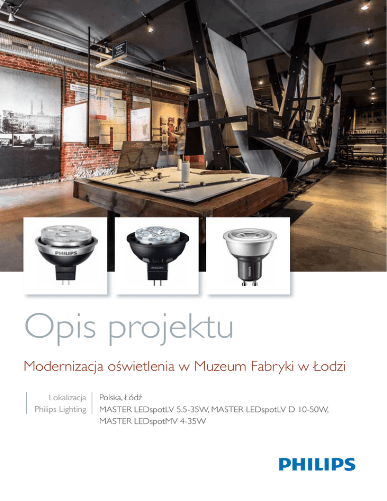 opis projektu Modernizacja oświetlenia w Muzeum Fabryki w Łodzi Lokalizacja Philips Lighting Polska, Łódź MASTER LEDspotLV 5.5-35W, MASTER LEDspotLV D 10-50W, MASTER LEDspotMV 4-35W „W codziennej pracy muzeum doświadczaliśmy uciążliwości związanych z często przepalającymi się żarówkami halogenowymi, które powodowały konieczność stałej ich wymiany. Konsultanci firmy Philips zaproponowali nam sprawdzone w tego typu obiektach rozwiązanie, czyli oprawy w technologii LED. Dzięki temu, ekspozycja jest oświetlona przyjemnym, ciepłym światłem, przyjaznym dla zwiedzających i ładnie podkreślającym ekspozycję. Dodatkowo oszczędziliśmy wiele godzin pracy, koniecznych do wymiany halogenów oraz zyskaliśmy wymierne oszczędności finansowe.” Anna Mokrosińska i Wojciech Grabarczyk, Muzeum Fabryki w Łodzi Wymiana oświetlenia ekspozycji muzealnych z halogenowego na LED Informacje o projekcie Inwestor Apsys Polska Projekt Modernizacja oświetlenia Muzeum Fabryki w Łodzi Miejsce Łódź, Polska Rozwiązania oświetleniowe Źródła światła: MASTER LEDspotLV 5.5-35W, MASTER LEDspotLV D 10-50W, MASTER LEDspotMV 4-35W Osoby odpowiedzialne za projekt Zespół Philips Lighting Poland S.A. Wprowadzenie Muzeum Fabryki znajduje się w centrum Manufaktura w Łodzi, a w jego zabytkowych wnętrzach przedstawiono historię przemysłowej fortuny rodziny Poznańskich z drugiej połowy XIX wieku. Zwiedzający mogą zobaczyć w nim technikę produkcji tkanin bawełnianych oraz codzienną pracę dawnych robotników. Ekspozycję tworzą zdjęcia, dokumenty, maszyny oraz próbki surowców i produktów starej fabryki. Wystawa w muzeum jest oświetlana przez ok. 10 godzin dziennie, 6 dni w tygodniu. Używane oświetlenie halogenowe wymagało częstej wymiany lamp z powodu ich szybkiego przepalania się. Aby wyeliminować powyższe trudności wybrano rozwiązanie oparte o nowoczesną technologię LED firmy Philips. Koncepcja oświetlenia Źródła halogenowe oświetlające ekspozycję zastąpione zostały oświetleniem diodowym MASTER LEDspotLV5.5-35W 2700K MR16 36D, MASTER LEDspotLV D 10-50W 2700K MR16 36D oraz MASTER LEDspotMV D 4-35W GU10 2700K 40D. W ciągu miesiąca wymieniono ok. 70 sztuk źródeł światła. W rezultacie zainstalowano punktowe źródła MASTER LED spot 5.5W (porównywalne z halogenami o mocy 35 W)oraz 10W MASTER LED spot (porównywalne z halogenami o mocy 50 W) i MASTER LED spot 4W (porównywalne z halogenami o mocy 35 W). Dzięki długiemu okresowi eksploatacji (5.5 W — 45 000 godzin; 10 W — 30 000 godzin; 4 W – 25 000 godzin) to rozwiązanie oświetleniowe jest łatwe w utrzymaniu, pozwala zmniejszyć czas i koszty związane z wymianą źródeł światła. Korzyści Eksperci firmy Philips przygotowali symulację oszczędności kosztów energii w ciągu roku, która nastąpi po wymianie oświetlenia halogenowego na oświetlenie oparte o technologię LED. Muzeum w ciągu całego roku, po wymianie ok. 70 źródeł światła, zaoszczędzi ok. 77 % dotychczasowych kosztów energii elektrycznej, a całkowity czas zwrotu z inwestycji nastąpi po 14 miesiącach. Stosowanie technologii LED, to również wyraz dbałości o środowisko naturalne, ponieważ w trakcie eksploatacji zmniejsza się także poziom emisji CO2 do atmosfery. Źródła MASTER LED Philips są idealnym zamiennikiem dla halogenów w obiektach tak szczególnych, jakimi są muzea - przyjemne światło LED sprawdza się doskonale w podkreślaniu walorów eksponatów. Ekspozycja muzealna zyskała przyjazne dla zwiedzających oświetlenie, zredukowane zostały koszty zużycia energii i emisjii CO2, a dłuższy czas eksploatacji źródeł światła znacznie obniżył bieżące koszty związane z utrzymaniem. Dowiedz się więcej o systemach oświetlenia LED od najlepszych specjalistów na świecie. Zachęcamy do skorzystania z naszej dedykowanej linii 00 800 7445 4775 Przyłącz się do programu i zainspiruj się! która zapewni Państwu najszybsze połączenie z ekspertami PHILIPS * Opłata wg taryfy operatora www.philips.pl/architekciswiatla ©2013 Koninlijke Philips Electronics N.V. Wszelkie prawa zastrzeżone. Kopiowanie całości lub części tego dokumentu bez uzyskania pisemnej zgody właściciela praw autorskich jest zabronione. Informacje przedstawione w tym dokumencie nie stanowią żadnej formy oferty lub kontraktu, są uważane za prawdziwe i mogą ulec zmianie bez powiadomienia. Wydawca nie ponosi odpowiedzialności za żadne konsekwencje użycia tych informacji. Publikacja nie przenosi ani nie zakłada żadnych opatentowanych licencji lub innych przemysłowych lub intelektualnych praw własności. Data wydania: Kwiecień, 2013