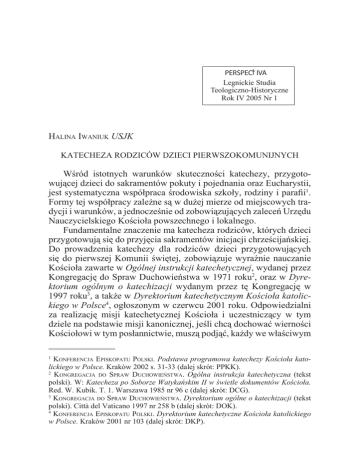Halina Iwaniuk USJK 84 † PERSPECTIVA Legnickie Studia Teologiczno-Historyczne Rok IV 2005 Nr 1 Halina Iwaniuk USJK Katecheza rodziców dzieci pierwszokomunijnych Wśród istotnych warunków skuteczności katechezy, przygotowującej dzieci do sakramentów pokuty i pojednania oraz Eucharystii, jest systematyczna współpraca środowiska szkoły, rodziny i parafii1. Formy tej współpracy zależne są w dużej mierze od miejscowych tradycji i warunków, a jednocześnie od zobowiązujących zaleceń Urzędu Nauczycielskiego Kościoła powszechnego i lokalnego. Fundamentalne znaczenie ma katecheza rodziców, których dzieci przygotowują się do przyjęcia sakramentów inicjacji chrześcijańskiej. Do prowadzenia katechezy dla rodziców dzieci przygotowujących się do pierwszej Komunii świętej, zobowiązuje wyraźnie nauczanie Kościoła zawarte w Ogólnej instrukcji katechetycznej, wydanej przez Kongregację do Spraw Duchowieństwa w 1971 roku2, oraz w Dyrektorium ogólnym o katechizacji wydanym przez tę Kongregację w 1997 roku3, a także w Dyrektorium katechetycznym Kościoła katolickiego w Polsce4, ogłoszonym w czerwcu 2001 roku. Odpowiedzialni za realizację misji katechetycznej Kościoła i uczestniczący w tym dziele na podstawie misji kanonicznej, jeśli chcą dochować wierności Kościołowi w tym posłannictwie, muszą podjąć, każdy we właściwym Konferencja Episkopatu Polski. Podstawa programowa katechezy Kościoła katolickiego w Polsce. Kraków 2002 s. 31-33 (dalej skrót: PPKK). 2 Kongregacja do Spraw Duchowieństwa. Ogólna instrukcja katechetyczna (tekst polski). W: Katecheza po Soborze Watykańskim II w świetle dokumentów Kościoła. Red. W. Kubik. T. 1. Warszawa 1985 nr 96 c (dalej skrót: DCG). 3 Kongregacja do Spraw Duchowieństwa. Dyrektorium ogólne o katechizacji (tekst polski). Città del Vaticano 1997 nr 258 b (dalej skrót: DOK). 4 Konferencja Episkopatu Polski. Dyrektorium katechetyczne Kościoła katolickiego w Polsce. Kraków 2001 nr 103 (dalej skrót: DKP). 1 Katecheza rodziców dzieci pierwszokomunijnych 85 sobie zakresie, dzieło katechizacji rodziców dzieci pierwszokomunijnych. W świetle nauki zawartej choćby w wyżej wymienionych dokumentach kościelnych należy stwierdzić, iż odpowiedzialni członkowie Kościoła nie mogą mieć wątpliwości, czy należy prowadzić katechezę rodziców dzieci, przygotowujących się do sakramentu pokuty i pojednania oraz Eucharystii. Problemem pozostaje jedynie poszukiwanie coraz to doskonalszych rozwiązań dotyczących jej organizacji oraz właściwego doboru treści i form, o których w dokumentach kościelnego nauczania ze zrozumiałych względów informuje się w sposób dość ogólny. W tym miejscu chcemy uwrażliwić tak na problemy priorytetowe, które według katechetycznych dokumentów kościelnych muszą być uwzględniane przez samych katechetów, jak i te, które mają być poruszane w katechezie rodziców uczniów pierwszego etapu edukacyjnego. W oparciu o oficjalną naukę Kościoła szukamy odpowiedzi na podstawowe pytania: Dlaczego jest konieczna katecheza rodziców? Jakie są priorytetowe treści tej katechezy? Jakie elementy winny być uwzględniane od strony zewnętrznej, organizacyjnej katechezy rodziców dzieci, przygotowujących się do pierwszej Komunii świętej? Jakie są najbardziej skuteczne i możliwe do zrealizowania formy katechezy rodziców w warunkach parafialnych? 1. Dlaczego konieczna jest katecheza rodziców? Wydaje się, że istotne znaczenie dla skuteczności katechezy rodziców ma pogłębione ukazywanie podstaw, świadczących o konieczności prowadzenia katechezy dorosłych. Podstawy te muszą być jasno uświadamiane i uznane tak przez rodziców, jak i przez samych katechetów pracujących z nimi. Według oficjalnych zaleceń Kościoła rodziców dzieci przygotowujących się do pierwszej Komunii świętej należy objąć systematyczną katechezą z dwóch podstawowych powodów. Jako ludzie ochrzczeni mają oni prawo otrzymać odpowiednią katechezę prowadzącą do dojrzałości w wierze. Ponadto mają też prawo do szczególnej formy katechezy z racji tak ważnego wydarzenia w życiu rodziny, jakim jest przygotowanie ich dziecka do przyjęcia sakramentu pokuty i pojednania oraz Eucharystii. W Dyrektorium ogólnym o katechizacji z 1997 roku czytamy: „Każdy ochrzczony, ponieważ jest powołany przez Boga do dojrzałości wiary, potrzebuje, a więc i ma prawo do odpowiedniej katechezy. 86 Halina Iwaniuk USJK Jest więc pierwszorzędnym zadaniem Kościoła okazanie mu odpowiedniej i zadowalającej pomocy”5. „Katecheza dostosowana do różnego wieku jest istotnym wymaganiem, jakie staje przed wspólnotą chrześcijańską. Z jednej strony bowiem wiara uczestniczy w rozwoju osoby, a z drugiej każda faza życia jest wystawiona na wyzwanie nadania jej charakteru chrześcijańskiego i musi przede wszystkim utrwalać się przez coraz to nowe zadania powołania chrześcijańskiego”6. Aby katecheza była w stanie rozwinąć całą skuteczność w misji ewangelizacyjnej Kościoła powszechnego, to w Kościele lokalnym, parafialnym pierwszorzędnego znaczenia musi nabrać katecheza dorosłych7. Już w instrukcji katechetycznej z 1971 roku odnajdujemy ważne postulaty dotyczące katechezy rodziców. Kongregacja nakłada na duszpasterzy obowiązek prowadzenia katechezy dorosłych z uwzględnieniem ich rzeczywistych potrzeb w wymiarze życia osobowego, wspólnotowego, społecznego i kościelnego. Zaleca, by w katechezie dorosłych życie ich było naświetlane Słowem Bożym i poddawane refleksji chrześcijańskiej. W myśl Directorium Catechisticum Generale katecheza taka winna mieć na celu wspieranie dorosłych, by we wszystkich okolicznościach życia z wiary czerpali inspiracje, motywacje i oceny ludzkiej egzystencji. Czytamy tam także między innymi: „Niech ponadto pamiętają, że katechizację dorosłych należy uznać za docelową formę katechezy, ku kt