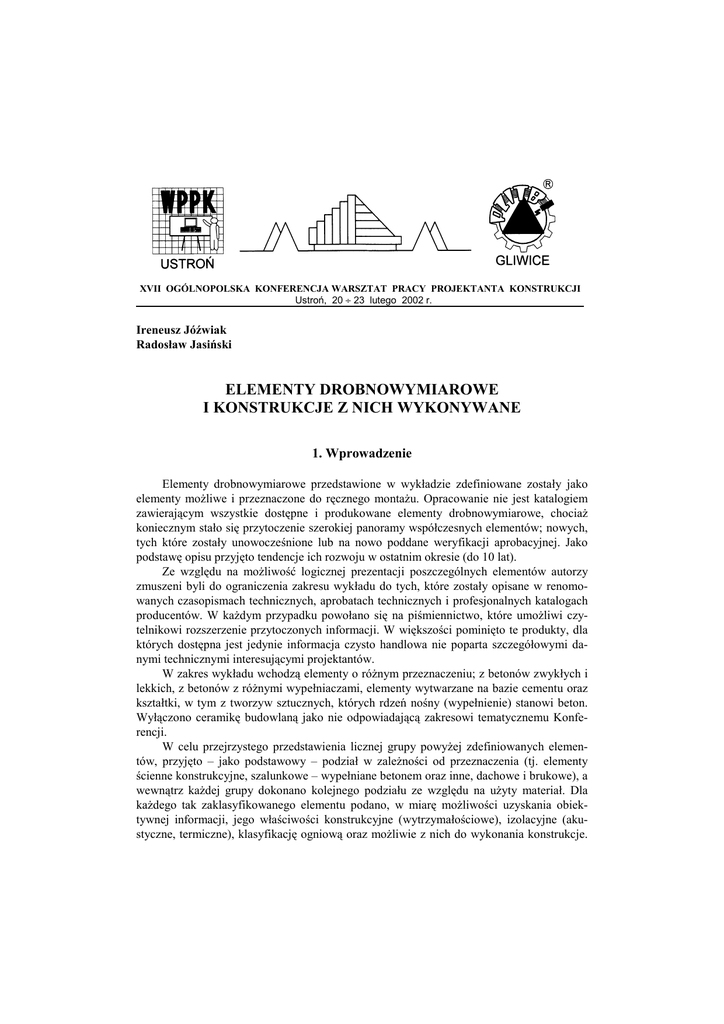 XVII OGÓLNOPOLSKA KONFERENCJA WARSZTAT PRACY PROJEKTANTA KONSTRUKCJI Ustroń, 20 ÷ 23 lutego 2002 r. Ireneusz Jóźwiak Radosław Jasiński ELEMENTY DROBNOWYMIAROWE I KONSTRUKCJE Z NICH WYKONYWANE 1. Wprowadzenie Elementy drobnowymiarowe przedstawione w wykładzie zdefiniowane zostały jako elementy możliwe i przeznaczone do ręcznego montażu. Opracowanie nie jest katalogiem zawierającym wszystkie dostępne i produkowane elementy drobnowymiarowe, chociaż koniecznym stało się przytoczenie szerokiej panoramy współczesnych elementów; nowych, tych które zostały unowocześnione lub na nowo poddane weryfikacji aprobacyjnej. Jako podstawę opisu przyjęto tendencje ich rozwoju w ostatnim okresie (do 10 lat). Ze względu na możliwość logicznej prezentacji poszczególnych elementów autorzy zmuszeni byli do ograniczenia zakresu wykładu do tych, które zostały opisane w renomowanych czasopismach technicznych, aprobatach technicznych i profesjonalnych katalogach producentów. W każdym przypadku powołano się na piśmiennictwo, które umożliwi czytelnikowi rozszerzenie przytoczonych informacji. W większości pominięto te produkty, dla których dostępna jest jedynie informacja czysto handlowa nie poparta szczegółowymi danymi technicznymi interesującymi projektantów. W zakres wykładu wchodzą elementy o różnym przeznaczeniu; z betonów zwykłych i lekkich, z betonów z różnymi wypełniaczami, elementy wytwarzane na bazie cementu oraz kształtki, w tym z tworzyw sztucznych, których rdzeń nośny (wypełnienie) stanowi beton. Wyłączono ceramikę budowlaną jako nie odpowiadającą zakresowi tematycznemu Konferencji. W celu przejrzystego przedstawienia licznej grupy powyżej zdefiniowanych elementów, przyjęto – jako podstawowy – podział w zależności od przeznaczenia (tj. elementy ścienne konstrukcyjne, szalunkowe – wypełniane betonem oraz inne, dachowe i brukowe), a wewnątrz każdej grupy dokonano kolejnego podziału ze względu na użyty materiał. Dla każdego tak zaklasyfikowanego elementu podano, w miarę możliwości uzyskania obiektywnej informacji, jego właściwości konstrukcyjne (wytrzymałościowe), izolacyjne (akustyczne, termiczne), klasyfikację ogniową oraz możliwie z nich do wykonania konstrukcje. Uwzględniono również dodatkowe, specyficzne wymagania dla niektórych elementów, charakterystyczne dla ich przeznaczenia. 2. Elementy ścienne konstrukcyjne Najliczniejszą grupę elementów drobnowymiarowych stanowią oczywiście elementy ścienne konstrukcyjne wykonywane z różnych odmian, rodzajów betonów. W trakcie wykonanego przeglądu generalnie zauważono tendencję do odchodzenia od stosowania betonów zwykłych niskich wytrzymałości (≤ B15), na rzecz betonów zwykłych wyższych wytrzymałości (≥ B40), betonów lekkich oraz z różnymi wypełniaczami. 2.1. Beton zwykły Powszechnie na rynku znane są różnego typu pustaki szczelinowe wykonywane z betonu o niskich wytrzymałościach (≤ B15, a nawet ≤B10), przez małych producentów, czasami wyłącznie na potrzeby własne. Możliwość ich zastosowań jest bardzo ograniczona, a często wręcz niemożliwa. Dla tych elementów niedostępna jest na ogół charakterystyka wytrzymałościowa, a dokładność wymiarowa nie spełnia wymaganych kryteriów. Postęp w tym zakresie jest bardzo ograniczony. Należy jednak zwrócić uwagę, że istnieją na rynku pustaki, które pełnią rolę bardziej wszechstronną, zarówno konstrukcyjną, a jednocześnie mogą służyć jako elementy ciągów wentylacyjnych (np. typu AL [66]). Pustaki te przeznaczone są do wykonywania ścian murowanych w dowolnych obiektach budowlanych, przede wszystkim ścian nośnych wewnętrznych i murów wewnętrznych szczelinowych. Rozwiązanie to zakłada możliwość regulowania nośności ścian przez zróżnicowanie klasy betonu użytego do wykonania pustaków (do produkcji stosowany jest beton zwykły klasy B20 lub B15 odpowiadający wymaganiom normy PN-88/B-06250. Beton zwykły) oraz wypełnianie dodatkowo komór wewnętrznych betonem różnych klas. Istnieje więc możliwość wykonywania wewnątrz ściany słupów żelbetowych (o wymiarach przekroju poprzecznego dochodzących do 230∗200 mm). Komory wewnętrzne pustaków mogą również służyć jako przewody wentylacyjne, a specjalne typy pustaków do wznoszenia muru umożliwiają wykonanie otworów łączących pomieszczenia z przewodami wentylacyjnymi i osadzanie kratek wentylacyjnych – mają one w tym celu specjalnie pocienione powierzchnie boczne ścianek (do 20 mm). Rozróżnić można pustaki „AL” ścienne o grubości 250 (rys. 1a) lub 380 mm z podwójnymi (rys. 2a) lub pojedynczymi komorami (rys. 3a) i długości 510 mm oraz odpowiadające im pustaki wentylacyjne o grubości 250 mm (rys. 1b i c) oraz 380 mm (rys. 2b i c, rys. 3b i c). Masa pustaków waha się w granicach 30÷40 kg. Pustaki produkowane są w trzech klasach (7,5, 10,0 i 15,0) odpowiadających wytrzymałości na ściskanie w MPa. Pewne zastosowanie mają również bloczki betonowe ([75] – str. 25÷26 – SWW 145135, certyfikat nr B-08/77/97 – grudzień 1998 r.) do wznoszenia ścian piwnic wykonywane z betonu klasy ≥B15 na bazie żwiru lub grysu, z dodatkami uszlachetniającymi i wymiarach np. 120∗240∗480 mm, przy masie ~30 kg. Do wznoszenia wyższych kondygnacji w dowolnych obiektach budowlanych można wtedy stosować pustaki ścienne np. „Alfa-Nexpol” o dostosowanych wymiarach (240∗240∗480 mm) i masie 43 kg. Poprawa jakości takich pustaków została uzyskana poprzez zastosowanie agregatów wibroprasujących (np. Zenith 913). Właściwy postęp w stosowaniu betonu zwykłego w elementach ściennych konstrukcyjnych dokonał się poprzez stosowanie rozwiniętej technologii wibroprasowania i dojrzewania. Technologia taka polega na formowaniu w wibroprasie (np. Columbia) mieszanki betonowej o bardzo małej wilgotności, a następnie poddaniu jej przyśp