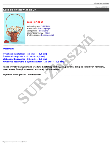 Informacje o produkcie Utworzono 03-03-2017 Kosz do kwiatów 361/SUR Cena : 17,00 zł WYMIARY: bą sz y ń Nr katalogowy : 361/SUR Producent : SUR Zbąszyń Dostępność : Dostępny Stan magazynowy : niski Średnia ocena : brak recenzji wysokość z pałąkiem - 45 cm (+ - 0,5 cm) średnica koszyczka - 10 cm (+ - 0,5 cm) głębokość koszyczka - 10 cm (+ - 0,5 cm) wysokość koszyczka z tylnim ażurem - 25 cm (+ - 0,5 cm) Nasze wyroby są wykonane w 100% z polskiej wikliny, skupowanej zimą od lokalnych rolników, przez naszą firmę korowanej, suszonej i składowanej. SU R -Z Wyrób w 100% polski...wielkopolski Wygenerowano w programie www.oscGold.com
