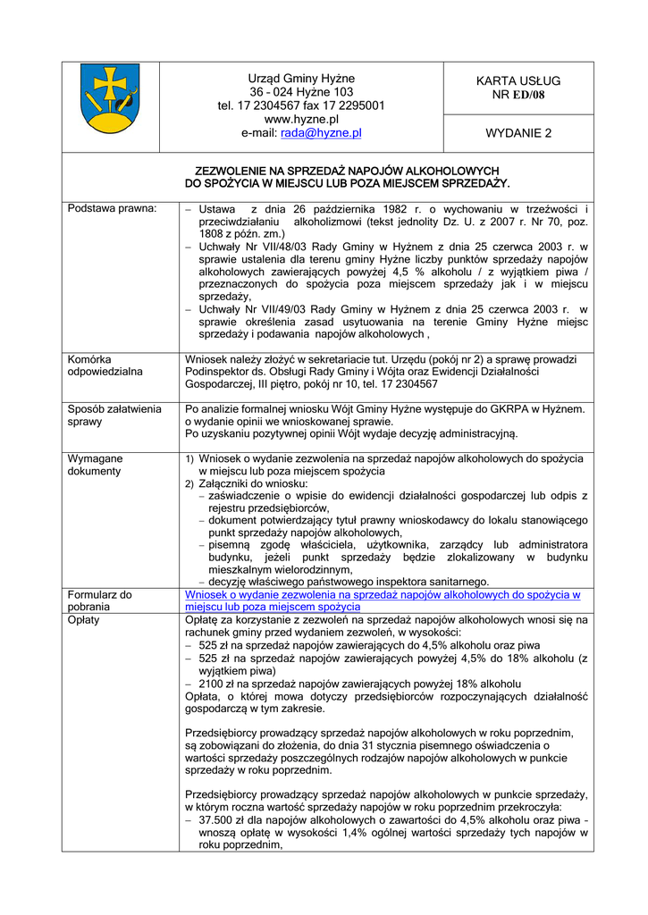Urząd Gminy Hyżne 36 – 024 Hyżne 103 tel. 17 2304567 fax 17 2295001 www.hyzne.pl e-mail: [email protected] KARTA USŁUG NR ED/08 WYDANIE 2 ZEZWOLENIE NA SPRZEDAŻ NAPOJÓW ALKOHOLOWYCH DO SPOŻYCIA W MIEJSCU LUB POZA MIEJSCEM SPRZEDAŻY. Podstawa prawna:  Ustawa z dnia 26 października 1982 r. o wychowaniu w trzeźwości i przeciwdziałaniu alkoholizmowi (tekst jednolity Dz. U. z 2007 r. Nr 70, poz. 1808 z późn. zm.)  Uchwały Nr VII/48/03 Rady Gminy w Hyżnem z dnia 25 czerwca 2003 r. w sprawie ustalenia dla terenu gminy Hyżne liczby punktów sprzedaży napojów alkoholowych zawierających powyżej 4,5 % alkoholu / z wyjątkiem piwa / przeznaczonych do spożycia poza miejscem sprzedaży jak i w miejscu sprzedaży,  Uchwały Nr VII/49/03 Rady Gminy w Hyżnem z dnia 25 czerwca 2003 r. w sprawie określenia zasad usytuowania na terenie Gminy Hyżne miejsc sprzedaży i podawania napojów alkoholowych , Komórka odpowiedzialna Wniosek należy złożyć w sekretariacie tut. Urzędu (pokój nr 2) a sprawę prowadzi Podinspektor ds. Obsługi Rady Gminy i Wójta oraz Ewidencji Działalności Gospodarczej, III piętro, pokój nr 10, tel. 17 2304567 Sposób załatwienia sprawy Po analizie formalnej wniosku Wójt Gminy Hyżne występuje do GKRPA w Hyżnem. o wydanie opinii we wnioskowanej sprawie. Po uzyskaniu pozytywnej opinii Wójt wydaje decyzję administracyjną. Wymagane dokumenty 1) Wniosek o wydanie zezwolenia na sprzedaż napojów alkoholowych do spożycia w miejscu lub poza miejscem spożycia 2) Załączniki do wniosku:  zaświadczenie o wpisie do ewidencji działalności gospodarczej lub odpis z rejestru przedsiębiorców,  dokument potwierdzający tytuł prawny wnioskodawcy do lokalu stanowiącego punkt sprzedaży napojów alkoholowych, zgodę właściciela, użytkownika, zarządcy lub administratora budynku, jeżeli punkt sprzedaży będzie zlokalizowany w budynku mieszkalnym wielorodzinnym,  decyzję właściwego państwowego inspektora sanitarnego. Wniosek o wydanie zezwolenia na sprzedaż napojów alkoholowych do spożycia w miejscu lub poza miejscem spożycia Opłatę za korzystanie z zezwoleń na sprzedaż napojów alkoholowych wnosi się na rachunek gminy przed wydaniem zezwoleń, w wysokości:  525 zł na sprzedaż napojów zawierających do 4,5% alkoholu oraz piwa  525 zł na sprzedaż napojów zawierających powyżej 4,5% do 18% alkoholu (z wyjątkiem piwa)  2100 zł na sprzedaż napojów zawierających powyżej 18% alkoholu Opłata, o której mowa dotyczy przedsiębiorców rozpoczynających działalność gospodarczą w tym zakresie.  pisemną Formularz do pobrania Opłaty Przedsiębiorcy prowadzący sprzedaż napojów alkoholowych w roku poprzednim, są zobowiązani do złożenia, do dnia 31 stycznia pisemnego oświadczenia o wartości sprzedaży poszczególnych rodzajów napojów alkoholowych w punkcie sprzedaży w roku poprzednim. Przedsiębiorcy prowadzący sprzedaż napojów alkoholowych w punkcie sprzedaży, w którym roczna wartość sprzedaży napojów w roku poprzednim przekroczyła:  37.500 zł dla napojów alkoholowych o zawartości do 4,5% alkoholu oraz piwa – wnoszą opłatę w wysokości 1,4% ogólnej wartości sprzedaży tych napojów w roku poprzednim,  37.500 zł dla napojów alkoholowych o zawartości od 4,5% do 18% alkoholu (z wyjątkiem piwa) – wnoszą opłatę w wysokości 1,4% ogólnej wartości sprzedaży tych napojów w roku poprzednim,  77.000 zł dla napojów alkoholowych o zawartości powyżej 18% alkoholu – wnoszą opłatę w wysokości 2,7% ogólnej wartości sprzedaży tych napojów w roku poprzednim. Powyższe opłaty mogą być dokonywane w kasie tut. urzędu lub na konto: 17 9158 1011 2002 2000 0013 0001 BS Błażowa O/Hyżne Czas załatwienia sprawy do 30 dni Tryb odwoławczy Odwołanie od decyzji wnosi się do Samorządowego Kolegium Odwoławczego w Rzeszowie za pośrednictwem Wójta Gminy Hyżne w terminie 14 dni od dnia jej otrzymania. Inne informacje W przypadku braków formalnych we wniosku, wnioskodawca zostanie wezwany do ich uzupełnienia. Opracował: Magdalena Buda Podinspektor ds. Obsługi Rady Gminy i Wójta oraz Ewidencji Działalności Gospodarczej Dnia 18.09.2012 r. Sprawdził: Wacław Mikulski Sekretarz Gminy Hyżne. Dnia 19.09.2012 r. Zatwierdził: Krystyna Wojtyło Wójt Gminy Hyżne Dnia 19.09.2012 r.