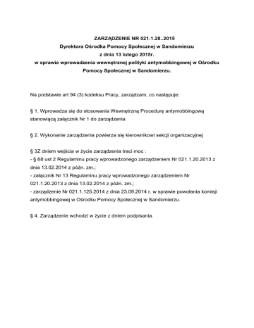 ZARZĄDZENIE NR 021.1.28..2015 Dyrektora Ośrodka Pomocy Społecznej w Sandomierzu z dnia 13 lutego 2015r. w sprawie wprowadzenia wewnętrznej polityki antymobbingowej w Ośrodku Pomocy Społecznej w Sandomierzu. Na podstawie art 94 (3) kodeksu Pracy, zarządzam, co następuje: § 1. Wprowadza się do stosowania Wewnętrzną Procedurę antymobbingową stanowiącą załącznik Nr 1 do zarządzenia § 2. Wykonanie zarządzenia powierza się kierownikowi sekcji organizacyjnej § 3Z dniem wejścia w życie zarządzenia traci moc : - § 68 ust 2 Regulaminu pracy wprowadzonego zarządzeniem Nr 021.1.20.2013 z dnia 13.02.2014 z późn. zm.; - załącznik Nr 13 Regulaminu pracy wprowadzonego zarządzeniem Nr 021.1.20.2013 z dnia 13.02.2014 z późn. zm.; - zarządzenie Nr 021.1.125.2014 z dnia 23.09.2014 r. w sprawie powołania komisji antymobbingowej w Ośrodku Pomocy Społecznej w Sandomierzu. § 4. Zarządzenie wchodzi w życie z dniem podpisania. Załacznik do zarządzenia Nr 021.1. .2015 Dyrektora Ośrodka Pomocy Społecznej w Sandomierzu z dnia ....................... Wewnętrzna Polityka Antymobbingowa w Ośrodku Pomocy Społecznej w Sandomierzu Rozdział I. Postanowienia ogólne § 1. Celem ustalenia Wewnętrznej Polityki Antymobbingowej w Ośrodku Pomocy Społecznej w Sandomierzu jest przeciwdziałanie zjawisku mobbingu. Każdy z pracowników jest zobowiązany do zapoznania się z treścią postanowień w sprawie polityki antymobbingowej. § 2. Ilekroć w Wewnętrznej Polityce Antymobbingowej jest mowa o: 1) Mobbingu – należy przez to rozumieć działania lub zachowania dotyczące pracownika lub skierowane przeciwko pracownikowi, polegające na uporczywym i długotrwałym nękaniu lub zastraszaniu pracownika, wywołujące u niego zaniżoną ocenę przydatności zawodowej, powodujące lub mające na celu poniżenie lub ośmieszenie pracownika, izolowanie go lub wyeliminowanie z zespołu współpracowników; za mobbing uznaje się również zachowania dyskryminacyjne o opisanych powyżej cechach, odnoszące się bezpośrednio lub pośrednio do warunków zatrudnienia, awansowania oraz dostępu do szkolenia w celu podnoszenia kwalifikacji zawodowych, w szczególności ze względu na płeć, wiek, niepełnosprawność, rasę, religię, narodowość, przekonania polityczne, przynależność związkową, pochodzenie etniczne, wyznanie, orientację seksualną, a także na zatrudnienie na czas określony lub nieokreślony, kontrakt albo w pełnym lub niepełnym wymiarze czasu pracy; 2) Komisji Antymobbingowej – rozumie się przez to organ kolegialny składający się z co najmniej 3 osób powoływany przez Pracodawcę do rozpatrywania zgłoszeń o mobbing, 3) Pracodawcy, Dyrektorze – rozumie się przez to Dyrektora Ośrodka Pomocy Społecznej w Sandomierzu; 4) Pracowniku – rozumie się przez to osobę pozostającą z pracodawcą w stosunku pracy; 5) Prawie Pracy – rozumie się przez to przepisy Kodeksu pracy oraz przepisy innych aktów prawnych, określających prawa i obowiązki Pracowników i Pracodawców, w tym regulaminu organizacyjnego określającego prawa i obowiązki stron obowiązujące w Ośrodku Pomocy Społecznej w Sandomierzu w ramach stosunku pracy; 6) WPA – rozumie się Wewnętrzną Politykę Antymobbingową; 7) OPS, Ośrodku – rozumie się przez to Ośrodek Pomocy Społecznej w Sandomierzu; 8) Zgłoszenie – rozumie się zgłoszenie pracownika, w tym ofiary lub świadka o zaistnieniu zachowań niosących znamiona mobbingu Rozdział II. Cel Wewnętrznej Polityki Antymobbingowej § 3. 1. Priorytetowym celem wprowadzenia WPA jest wspieranie działań sprzyjających budowaniu pozytywnych relacji między pracownikami w Ośrodku 2. Pracownicy zobowiązani są do szanowania godności i dóbr osobistych wszystkich uczestników procesu pracy. 3. Pracownicy zobowiązani są do stosowania we wzajemnych stosunkach zasad współżycia społecznego oraz życzliwości i uprzejmości gwarantującej porządek i zachowanie dobrego samopoczucia oraz zdrowia psychicznego. 4. Stosowanie mobbingu stanowi naruszenie podstawowych obowiązków pracowniczych i może być podstawą do zastosowania przez pracodawcę sankcji przewidzianych w przepisach Prawa Pracy, w szczególności zastosowania kar porządkowych lub rozwiązania umowy o pracę. 5. Każdy pracownik ma obowiązek zapoznać się z WPA i złożyć oświadczenie do sekcji organizacyjnej. Podpisane oświadczenie Pracodawca dołącza do akt osobowych Pracownika. Wzór oświadczenia stanowi Załącznik nr 1 do WPA. Rozdział III. Przeciwdziałanie mobbingowi § 4. 1 W zakresie przeciwdziałania mobbingowi Dyrektor oraz pracownicy współdziałają ze sobą i są odpowiedzialni za kształtowanie kultury organizacyjnej w Ośrodku, tj : 1) Drożny system komunikacji. Kierownicy komórek wewnętrznych współpracują ze sobą oraz podejmują szereg działań mających na celu drożność komunikacji zarówno w grupie (komunikacja wewnątrz sekcji ), jak również pomiędzy sekcjami. W tym celu Dyrektor ułatwia organizowanie spotkań wewnątrz komórek organizacyjnych, jak również spotkań kierowników poszczególnych komórek oraz całego zespołu pracowników Ośrodka 2) Czytelne zasady awansu Dyrektor Ośrodka, w celu wyeliminowania sytuacji, w której osoba pragnąca wzrostu swojej pozycji zawodowej w firmie, miałaby być postrzegana przez niego oraz przez innych współpracowników jako konkurent, a tym samym w celu uniknięcia sytuacji dyskredytowania pracownika, wprowadza jasne i czytelne zasady awansu 3) Właściwy system ocen okresowych, oparty na czytelnych, obiektywnych, akceptowanych zarówno przez oceniających, jak i ocenianych, kryteriach. 4) System szkoleń dla kadry menedżerskiej z zakresu zarządzania zasobami ludzkimi. Dyrektor ułatwia podnoszenie umiejętności interpersonalnych kadry kierowniczej oraz wiedzy z zakresu psychologicznych i socjologicznych aspektów zarządzania, budowania zespołu poprzez organizo