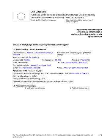 Unia Europejska Publikacja Suplementu do Dziennika Urzędowego Unii Europejskiej 2, rue Mercier, 2985 Luxembourg, Luksemburg Faks: +352 29 29 42 670 E-mail: [email protected] Informacje i formularze on-line: http:// simap.europa.eu Ogłoszenie dodatkowych informacji, informacje o niekompletnej procedurze lub sprostowanie Sekcja I: Instytucja zamawiająca/podmiot zamawiający I.1) Nazwa, adresy i punkty kontaktowe: Oficjalna nazwa: Teatr im. Juliusza Słowackiego w Krakowie Krajowy numer identyfikacyjny: (jeżeli jest znany) _____ Adres pocztowy: pl. Św. Ducha 1 Miejscowość: Kraków Kod pocztowy: 31-023 Punkt kontaktowy: _____ Państwo: Polska (PL) Tel.: +48 124244523/+48 124244516 Osoba do kontaktów: Joanna Poznańska-Wąsik E-mail: [email protected] Faks: +48 124244560/+48 124244506 Adresy internetowe: (jeżeli dotyczy) Ogólny adres instytucji zamawiającej/ podmiotu zamawiającego: (URL) www.slowacki.krakow.pl Adres profilu nabywcy: (URL) _____ Dostęp elektroniczny do informacji: (URL) _____ Elektroniczne składanie ofert i wniosków o dopuszczenie do udziału: (URL) _____ I.2) Rodzaj zamawiającego: Instytucja zamawiająca Podmiot zamawiający PL Formularz standardowy 14 - Ogłoszenie dodatkowych informacji, informacje o niekompletnej procedurze lub sprostowanie 1/5 Sekcja II: Przedmiot zamówienia II.1.1) Nazwa nadana zamówieniu: Dostawa wraz z montażem macierzy dyskowej, sprzętu komputerowego oraz sprzętu elektronicznego i cyfrowego dla arteteki-mediateki w nowowybudowanym obiekcie Małopolskiego Ogrodu Sztuki w Krakowie przyul. Rajskiej 12 (CPV 30200000-1). II.1.2) Krótki opis zamówienia lub zakupu:(podano w pierwotnym ogłoszeniu) Część I: macierz dyskowa -1. Część II: sprzęt komputerowy: 1. szafy serwerowe z wyposażeniem - 2, 2. serwer rack - 1, 3. zasilacze UPS - 3, 4. organizator kabli - 20, 5. switche gigabitowe - 15, 6. patchcordy - 700, 7. patchcordy światłowodowe - 20, 8. mini-GBIC - 10, 9. czytniki kodów kreskowych na USB - 5, 10. karty plastikowe - 100 000, 11. drukarki do kart plastikowych - 2, 12. czytniki kart MIFARE - 5, 13. komputer stacjonarny - 7 z dodatkowym wyposażeniem, 14. komputery zintegrowane z monitorem - 41 z wyposażeniem, 15. urządzenie wielofunkcyjne - 3, 16. drukarka laserowa mono - 1, 17. routery bezprzewodowe - 9, 18. programy do tworzenia/edycji/obróbki muzyki i grafiki, 19. oprogramowanie użytkowe, 20. urządzenie do czyszczenia płyt – 1, Część III: sprzęt elektroniczny i cyfrowy. 1. konsola do gier z kamerą interaktywną i kontrolerem ruchu - 1, 2. kamera cyfrowa – 1, 3. aparat cyfrowy lustrzanka - 1, 4. tablica interaktywna z projektorem – 1, 5. odtwarzacz Blu-ray 3D – 1, 6. telewizor 3D – 1, 7. telewizor HD LCD – 1, 8. tablety – 5, 9. e-czytniki – 60, 10. pianino cyfrowe stacjonarne - 1, 11. wyposażenie sali konferencyjnej – 1 zestaw. Opisy techniczne urządzeń ujętych w poszczególnych częściach zawarte są w załącznikach do niniejszegoSzczegółowego Opisu Przedmiotu Zamówienia. PL Formularz standardowy 14 - Ogłoszenie dodatkowych informacji, informacje o niekompletnej procedurze lub sprostowanie 2/5 W zakresie części III punkt 11 (wyposażenie sali konferencyjnej) – załącznik stanowią również planypomieszczenia z legendą. W przypadku wskazania w jakimkolwiek miejscu dokumentacji w ramach opisu przedmiotu zamówieniaznaków towarowych, patentów lub pochodzenia, należy rozumieć, że nazwa taka wskazana jest przykładowo ikażdorazowo dopuszczalne jest zastosowanie urządzenia równoważnego. Zamówienie obejmuje montaż dostarczonych urządzeń w przypadku: 1. macierzy dyskowej, 2. szaf serwerowych, 3. wyposażenia salki konferencyjnej. W przypadku pozostałych urządzeń montaż oznacza dostawę na miejsce, rozpakowanie i ustawienie nastanowiskach: 1. komputery stacjonarne, 2. komputery zintegrowane z monitorem 3. urządzenia wielofunkcyjne, 4. tablica interaktywna z projektorem, 5. pianino elektroniczne. II.1.3) Wspólny Słownik Zamówień (CPV) Główny przedmiot Słownik główny 30200000 Słownik uzupełniający (jeżeli dotyczy) PL Formularz standardowy 14 - Ogłoszenie dodatkowych informacji, informacje o niekompletnej procedurze lub sprostowanie 3/5 Sekcja IV: Procedura IV.1)Rodzaj procedury(podano w pierwotnym ogłoszeniu) Otwarta Ograniczona Ograniczona przyspieszona Negocjacyjna Negocjacyjna przyspieszona Dialog konkurencyjny Negocjacyjna z uprzednim ogłoszeniem Negocjacyjna bez uprzedniego ogłoszenia Negocjacyjna z publikacją ogłoszenia o zamówieniu Negocjacyjna bez publikacji ogłoszenia o zamówieniu Udzielenie zamówienia bez uprzedniej publikacji ogłoszenia o zamówieniu w Dzienniku Urzędowym Unii Europejskiej IV.2)Informacje administracyjne IV.2.1)Numer referencyjny: (podano w pierwotnym ogłoszeniu) DAM-282-9/12 IV.2.2)Dane referencyjne ogłoszenia w przypadku ogłoszeń przesłanych drogą elektroniczną: Pierwotne ogłoszenie przesłane przez eNotices TED eSender Login: ENOTICES_Teatr Dane referencyjne ogłoszenia: 2012-104465 rok i numer dokumentu IV.2.3)Ogłoszenie, którego dotyczy niniejsza publikacja: Numer ogłoszenia w Dz.U.: 2012/S 145-241612 z dnia: 31/07/2012 (dd/mm/rrrr) IV.2.4)Data wysłania pierwotnego ogłoszenia: 26/07/2012 (dd/mm/rrrr) PL Formularz standardowy 14 - Ogłoszenie dodatkowych informacji, informacje o niekompletnej procedurze lub sprostowanie 4/5 Sekcja VI: Informacje uzupełniające VI.1) Ogłoszenie dotyczy: Procedury niepełnej Sprostowania Informacji dodatkowych VI.2) Informacje na temat niepełnej procedury udzielenia zamówienia: Postępowanie o udzielenie zamówienia zostało przerwane Postępowanie o udzielenie zamówienia uznano za nieskuteczne Zamówienia nie udzielono Zamówienie może być przedmiotem ponownej publikacji VI.3) Informacje do poprawienia lub dodania : VI.3.1) Zmiana oryginalnej informacji podanej przez instytucję zamawiającą Publikacja w witrynie TED niezgodna z oryginalną informacją, p
