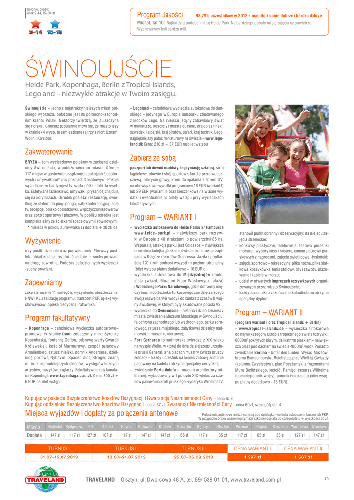 Kolonie, obozy: wiek 9-14, 15-18 lat Program Jakości 98,79% uczestników w 2012 r. oceniło kolonie dobrze i bardzo dobrze Michał, lat 10: Najbardziej podobał mi się Heide Park. Najbardziej podobały mi się zajęcia na powietrzu. Wychowawcy byli bardzo mili. ŚWINOUJŚCIE Heide Park, Kopenhaga, Berlin z Tropical Islands, Legoland – niezwykłe atrakcje w Twoim zasięgu. Świnoujście – jedno z najatrakcyjniejszych miast polskiego wybrzeża, położone jest na północno–zachodnim krańcu Polski. Niektórzy twierdzą, że „tu zaczyna się Polska”. Chociaż popularnie mówi się, że miasto leży w krainie 44 wysp, to zamieszkane są trzy z nich: Uznam, Wolin i Karsibór. Zakwaterowanie BRYZA – dom wycieczkowy położony w zacisznej dzielnicy Świnoujścia, w pobliżu centrum miasta. Oferuje 117 miejsc w gustownie urządzonych pokojach 2 osobowych z umywalkami* oraz pokojach 3 osobowych. Pokoje są zadbane, w każdym jest tv, szafa, półki, stolik, krzesełka. Estetyczne łazienki (wc, umywalki, prysznice) znajdują się na korytarzach. Ośrodek posiada: restaurację, świetlicę ze stołem do ping–ponga, salę konferencyjną, salę tv, recepcję, boisko do siatkówki, wypożyczalnię rowerów oraz sprzęt sportowy i plażowy. W pobliżu ośrodka jest kompleks leśny ze ścieżkami spacerowymi i rowerowymi. * miejsce w pokoju z umywalką za dopłatą + 30 zł/ os. Wyżywienie trzy posiłki dziennie oraz podwieczorek. Pierwszy posiłek -obiadokolacja, ostatni -śniadanie + suchy prowiant na drogę powrotną. Podczas całodziennych wycieczek -suchy prowiant. Zapewniamy zakwaterowanie 11 noclegów, wyżywienie, ubezpieczenie, NNW i KL, realizację programu, transport PKP, opiekę wychowawców, opiekę medyczną, ratownika. Program fakultatywny – Kopenhaga – całodniowa wycieczka autokarowo– promowa. W stolicy Danii zobaczymy min.: Syrenkę Kopenhaską, fontannę Gefion, odprawę warty Gwardii Królewskiej, kościół Marmurowy, zespół pałacowy Amalienborg, ratusz miejski, pomnik Andersena, dzielnicę portową Nyhaven. Spacer ulicą Stroger, znaną m. in. z najmodniejszych sklepów, występów licznych artystów, muzyków, kuglarzy. Fakultatywnie rejs kanałami Kopenhagi. www.kopenhaga.com.pl. Cena: 200 zł + 6 EUR na bilet wstępu; – Legoland – całodniowa wycieczka autokarowa do duńskiego – jedynego w Europie lunaparku zbudowanego z klocków Lego. Na miejscu jedyny zabawkowy świat w miniaturze, kościoły i miasta duńskie, krajobraz fiński, szwedzki i alpejski, kraj piratów, safari, kraj techniki Lego, najpiękniejszy pałac miniaturowy na świecie – www.legoland.dk Cena: 210 zł + 37 EUR na bilet wstępu. Zabierz ze sobą paszport lub dowód osobisty, legitymację szkolną, strój kąpielowy, obuwie i strój sportowy, kurtkę przeciwdeszczową, nakrycie głowy, krem do opalania z filtrem UV, na obowiązkowe wydatki programowe 16 EUR (wariant I) lub 29 EUR (wariant II) oraz kieszonkowe na własne wydatki i ewentualnie na bilety wstępu przy wycieczkach fakultatywnych. Program – WARIANT I – wycieczka autokarowa do Heide Parku k/ Hamburga www.heide–park.pl – największy park rozrywki w Europie z 40 atrakcjami, o powierzchni 85 ha. Wspaniałą atrakcją parku jest Colossos – największa drewniana kolejka górska na świecie, konstrukcja zapisana w Księdze rekordów Guinnessa. Jazda z prędkością 120 km/h podnosi wszystkim poziom adrenaliny (bilet wstępu płatny dodatkowo – 16 EUR); – wycieczka autokarowa do Międzyzdrojów (molo, aleja gwiazd, Muzeum Figur Woskowych, plaża) i Wolińskiego Parku Narodowego, gdzie dotrzemy między innymi do Jeziorka Turkusowego zawdzięczającego swoją nazwę barwie wody i do bunkra z czasów II wojny światowej, w którym były składowane pociski V3; – wycieczka do Świnoujścia – historia i dzień dzisiejszy miasta, zwiedzanie Muzeum Morskiego w Świnoujściu, falochronu zachodniego lub wschodniego, parku zdrojowego, ratusza miejskiego, zabytkowej dzielnicy nadmorskiej, muszli koncertowej; – Fort Gerharda to nadmorska twierdza z XIX wieku na wyspie Wolin, w której do dnia dzisiejszego urzęduje pruski Generał, a na placach musztry ćwiczą pruscy żołdacy – każdy uczestnik na koniec zabawy zostanie pasowany na kadeta i otrzyma specjalny certyfikat; – zwiedzanie Fortu Anioła – muzeum architektury militarnej, wybudowany w I połowie XIX wieku, za czasów panowania króla pruskiego Fryderyka Wilhelma IV, – – – – stanowił punkt obronny i obserwacyjny; na miejscu zajęcia strzeleckie; konkursy plastyczne, teleturnieje, festiwal piosenki morskiej, wybory Miss i Mistera, konkurs budowli piaskowych z nagrodami, zajęcia świetlicowe, dyskoteki; zajęcia sportowo – rekreacyjne: piłka nożna, piłka siatkowa, koszykówka, tenis stołowy, gry i zawody, plażowanie i kąpiele w morzu; udział w otwartych imprezach rozrywkowych organizowanych przez miasto Świnoujście; każdy uczestnik na zakończenie kolonii/obozu otrzyma specjalny dyplom. Program – WARIANT II (program wariant I oraz Tropical Islands + Berlin) – www.tropical–islands.de – wycieczka autokarowa do największego w Europie tropikalnego świata rozrywki: 8000m2 pokrytych białym, delikatnym piaskiem – największa plaża pod dachem na świecie 4000m2 wody. Ponadto zwiedzanie Berlina – Unter den Linden, Wyspa Muzeów, brama Brandenburska, Reichstag, plac Wielkiej Gwiazdy (kolumna Zwycięstwa), plac Poczdamski z fragmentami Muru Berlińskiego, kościół Pamięci cesarza Wilhelma (obecnie pomnik wojny), pomnik Holokaustu (bilet wstępu płatny dodatkowo – 13 EUR). Kupując w pakiecie Bezpieczeństwo Kosztów Rezygnacji i Gwarancję Niezmienności Ceny – cena 67 zł Kupując oddzielnie: Bezpieczeństwo Kosztów Rezygnacji – cena 37 zł, Gwarancja Niezmienności Ceny – cena 60 zł, szczegóły str. 4 Miejsca wyjazdów i dopłaty za połączenia antenowe Miasto Białystok Bydgoszcz Dopłata 147 zł 117 zł P