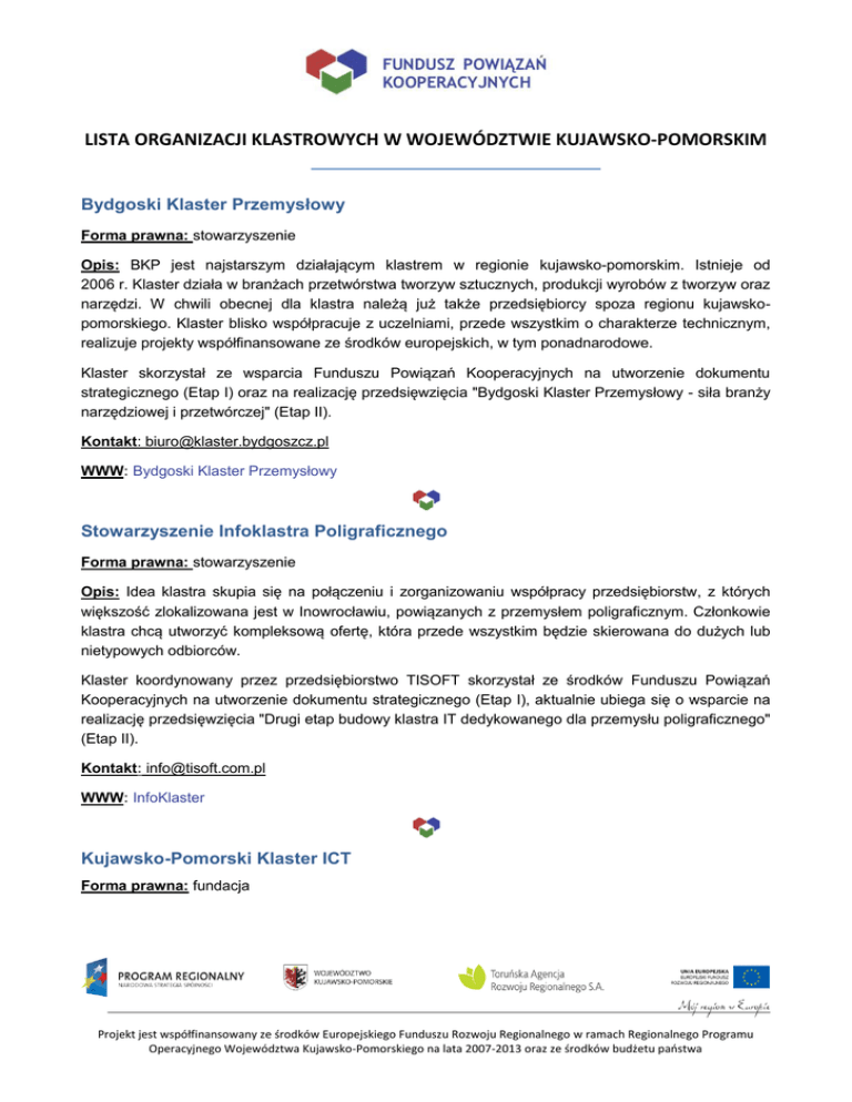 LISTA ORGANIZACJI KLASTROWYCH W WOJEWÓDZTWIE KUJAWSKO-POMORSKIM Bydgoski Klaster Przemysłowy Forma prawna: stowarzyszenie Opis: BKP jest najstarszym działającym klastrem w regionie kujawsko-pomorskim. Istnieje od 2006 r. Klaster działa w branżach przetwórstwa tworzyw sztucznych, produkcji wyrobów z tworzyw oraz narzędzi. W chwili obecnej dla klastra należą już także przedsiębiorcy spoza regionu kujawskopomorskiego. Klaster blisko współpracuje z uczelniami, przede wszystkim o charakterze technicznym, realizuje projekty współfinansowane ze środków europejskich, w tym ponadnarodowe. Klaster skorzystał ze wsparcia Funduszu Powiązań Kooperacyjnych na utworzenie dokumentu strategicznego (Etap I) oraz na realizację przedsięwzięcia "Bydgoski Klaster Przemysłowy - siła branży narzędziowej i przetwórczej" (Etap II). Kontakt: [email protected] WWW: Bydgoski Klaster Przemysłowy Stowarzyszenie Infoklastra Poligraficznego Forma prawna: stowarzyszenie Opis: Idea klastra skupia się na połączeniu i zorganizowaniu współpracy przedsiębiorstw, z których większość zlokalizowana jest w Inowrocławiu, powiązanych z przemysłem poligraficznym. Członkowie klastra chcą utworzyć kompleksową ofertę, która przede wszystkim będzie skierowana do dużych lub nietypowych odbiorców. Klaster koordynowany przez przedsiębiorstwo TISOFT skorzystał ze środków Funduszu Powiązań Kooperacyjnych na utworzenie dokumentu strategicznego (Etap I), aktualnie ubiega się o wsparcie na realizację przedsięwzięcia "Drugi etap budowy klastra IT dedykowanego dla przemysłu poligraficznego" (Etap II). Kontakt: [email protected] WWW: InfoKlaster Kujawsko-Pomorski Klaster ICT Forma prawna: fundacja Projekt jest współfinansowany ze środków Europejskiego Funduszu Rozwoju Regionalnego w ramach Regionalnego Programu Operacyjnego Województwa Kujawsko-Pomorskiego na lata 2007-2013 oraz ze środków budżetu państwa Opis: Kujawsko - Pomorski Klaster ICT w zamyśle przedsiębiorców ma stanowić ośrodek wspierający rozwój sektora ICT podnoszącego innowacyjność, konkurencyjność oraz wspierający kojarzenie partnerów biznesowych i naukowych w województwie kujawsko-pomorskim. Celem klastra jest także sprzyjanie rozbudowie i ulepszeniu portfolio oferowanych usług i produktów w taki sposób, by odpowiadało możliwie efektywnie odpowiadało ono na bieżące potrzeby klientów. Klaster utwrzony z inicjatywy przedsiębiorstwa SoftBule S.A. ubiega się o wsparcie ze środków Funduszu Powiązań Kooperacyjnych na realizację przedsięwzięcia "Kujawsko-Pomorski Klaster ICT" (Etap II). Kontakt: [email protected] Klaster Turystyki Medycznej i Uzdrowiskowej Sp. z o.o. Forma prawna: spółka z ograniczoną odpowiedzialnością Opis: Celem działania Klastra Turystyki Medycznej i Uzdrowiskowej, którego liderem jest KujawskoPomorska Organizacja Pracodawców Lewiatan jest działanie na rzecz ekonomicznego wzmacniania jego członków m.in. poprzez zacieśnianie współpracy, pozyskiwanie nowych klientów oraz poszerzanie zakresu oferowanych usług. Klaster skorzystał ze środków Funduszu Powiązań Kooperacyjnych na utworzenie dokumentu strategicznego (Etap I), aktualnie ubiega się o wsparcie na realizację przedsięwzięcia "Wdrożenie I etapu Strategii Klastra Turystyki Medycznej i Uzdrowiskowej" (Etap II). Kontakt: [email protected] WWW: Klaster Turystyki Medycznej i Uzdrowiskowej Klaster Turystyki Zdrowotnej Sp. z o.o. Forma prawna: spółka z ograniczoną odpowiedzialnością Opis: Jednym z celów KTZ, który zainicjowany został przez Port Lotniczy w Bydgoszczy, jest budowa mocnej pozycji rynkowej poszczególnych członków, ale także samego klastra, jako wyspecjalizowanego centrum usług zdrowotnych, którego oferta będzie kierowana do klientów polskich i zagranicznych. Klaster swoje działania zamierza prowadzić w korelacji z promocją międzynarodowej marki województwa kujawsko-pomorskiego. Klaster skorzystał ze środków Funduszu Powiązań Kooperacyjnych na utworzenie dokumentu strategicznego (Etap I), aktualnie ubiega się o wsparcie na realizację przedsięwzięcia "Platforma współpracy - rozwój klastra turystyki zdrowotnej" (Etap II). Kontakt: [email protected] WWW: Klaster Turystyki Zdrotownej Lokalna Organizacja Turystyczna w Toruniu Forma prawna: stowarzyszenie Opis: LOT Toruń została zidentyfikowana jako klaster w badaniach Polskiej Agencji Rozwoju Przedsiębiorczości już w 2011 r. W roku 2013 władze stowarzyszenia podjęły decyzję o zintensyfikowaniu działań skupionych na rozwoju Convention Bureau w oparciu o powiązania kooperacyjne pomiędzy podmiotami z branży. Klaster skorzystał ze środków Funduszu Powiązań Kooperacyjnych na utworzenie dokumentu strategicznego (etap I), aktualnie ubiega się o wsparcie na realizację przedsięwzięcia "Realizacja elementów rozwoju klastra turystycznego". Kontakt: [email protected] WWW: LOT Toruń Klaster Turystyczny Obszaru BIT Forma prawna: stowarzyszenie Opis: Klaster Turystyczny Obszaru BIT jest regionalną inicjatywą firm i organizacji działających w branży turystycznej skoncentrowanych wokół Bydgoszczy, Inowrocławia i Torunia (BIT). Celem klastra utworzonego pod auspicjami Bydgoskiej Lokalnej Organizacji Turystycznej jest promocja, sprzedaż i rozwój produktów oraz usług turystycznych znajdujących się w ofercie jego członków w kraju, a także za granicą. Klaster ubiega się o wsparcie ze środków Funduszu Powiązań Kooperacyjnych na opracowanie dokumentu strategicznego (Etap I). Kontakt: [email protected] WWW: Klaster Turystyczny Obszaru BIT Ciechociński Klaster Uzdrowiskowy Dolina Zdrowia Forma prawna: stowarzyszenie Opis: Dolina Zdrowia jest jedną z najstarszych kujawsko-pomorskich inicjatyw. Klaster w Ciechocinku został zidentyfikowany w roku 2006. Jest to klaster typowo branżowy skupiający sanatoria, szpitale uzdrowiskowe i podmioty, których działalność koncentruje się 