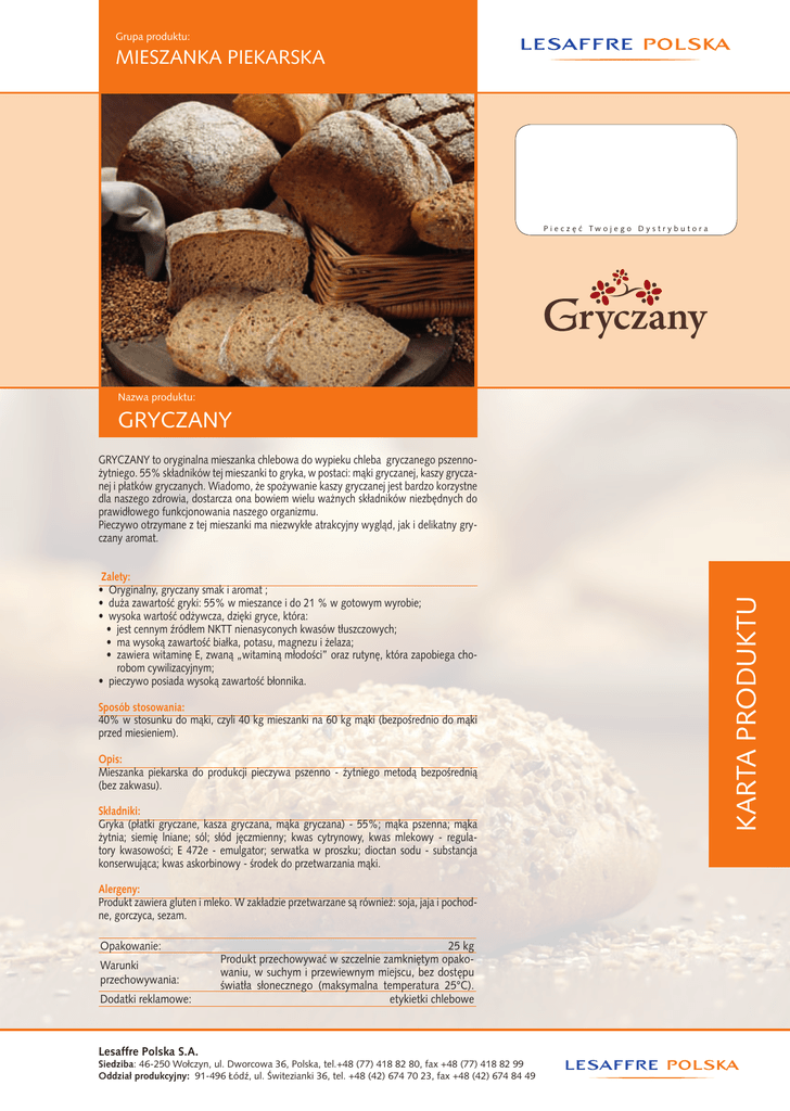 Grupa produktu: MIESZANKA PIEKARSKA P i e c z ´ ç Tw o j e g o D y s t r y b u t o r a Nazwa produktu: GRYCZANY Zalety: • Oryginalny, gryczany smak i aromat ; • du˝a zawartoÊç gryki: 55% w mieszance i do 21 % w gotowym wyrobie; • wysoka wartoÊç od˝ywcza, dzi´ki gryce, która: • jest cennym êród∏em NKTT nienasyconych kwasów t∏uszczowych; • ma wysokà zawartoÊç bia∏ka, potasu, magnezu i ˝elaza; • zawiera witamin´ E, zwanà „witaminà m∏odoÊci” oraz rutyn´, która zapobiega chorobom cywilizacyjnym; • pieczywo posiada wysokà zawartoÊç b∏onnika. Sposób stosowania: 40% w stosunku do màki, czyli 40 kg mieszanki na 60 kg màki (bezpoÊrednio do màki przed miesieniem). Opis: Mieszanka piekarska do produkcji pieczywa pszenno - ˝ytniego metodà bezpoÊrednià (bez zakwasu). Sk∏adniki: Gryka (p∏atki gryczane, kasza gryczana, màka gryczana) - 55%; màka pszenna; màka ˝ytnia; siemi´ lniane; sól; s∏ód j´czmienny; kwas cytrynowy, kwas mlekowy - regulatory kwasowoÊci; E 472e - emulgator; serwatka w proszku; dioctan sodu - substancja konserwujàca; kwas askorbinowy - Êrodek do przetwarzania màki. Alergeny: Produkt zawiera gluten i mleko. W zak∏adzie przetwarzane sà równie˝: soja, jaja i pochodne, gorczyca, sezam. Opakowanie: Warunki przechowywania: Dodatki reklamowe: Lesaffre Polska S.A. 25 kg Produkt przechowywaç w szczelnie zamkni´tym opakowaniu, w suchym i przewiewnym miejscu, bez dost´pu Êwiat∏a s∏onecznego (maksymalna temperatura 25°C). etykietki chlebowe Siedziba: 46-250 Wo∏czyn, ul. Dworcowa 36, Polska, tel.+48 (77) 418 82 80, fax +48 (77) 418 82 99 Oddział produkcyjny: 91-496 Łódê, ul. Âwitezianki 36, tel. +48 (42) 674 70 23, fax +48 (42) 674 84 49 KARTA PRODUKTU GRYCZANY to oryginalna mieszanka chlebowa do wypieku chleba gryczanego pszenno˝ytniego. 55% sk∏adników tej mieszanki to gryka, w postaci: màki gryczanej, kaszy gryczanej i p∏atków gryczanych. Wiadomo, ˝e spo˝ywanie kaszy gryczanej jest bardzo korzystne dla naszego zdrowia, dostarcza ona bowiem wielu wa˝nych sk∏adników niezb´dnych do prawid∏owego funkcjonowania naszego organizmu. Pieczywo otrzymane z tej mieszanki ma niezwyk∏e atrakcyjny wyglàd, jak i delikatny gryczany aromat. Grupa produktu: MIESZANKA PIEKARSKA P i e c z ´ ç Tw o j e g o D y s t r y b u t o r a Nazwa produktu: GRYCZANY Chleb Gryczany Bu∏ki Gryczane Rozczyn premiksowy Rozczyn premiksowy Sk∏adniki Surowce [g] Sk∏adniki Surowce [g] MIESZANKA 4 000 MIESZANKA 2 500 Czas namaczania 2 godziny Czas namaczania 2 godziny Woda (oko∏o 40 - 50°C) 6 800 Woda (oko∏o 40 - 50°C) 4 250 Ciasto Sk∏adniki Surowce [g] Sk∏adniki Surowce [g] Rozczyn premiksowy 10 800 Màka pszenna typ 550 7 500 Màka ˝ytnia typ 720 3 200 Rozczyn premiksowy 6 750 Màka pszenna typ 750 2 800 Dro˝d˝e 300 Dro˝d˝e 300 Sól 85 Sól 44 Polepszacz Bia∏y 35 Woda oko∏o 1 800 Woda oko∏o 1 500 Miesienie 3’ + 3’ Miesienie 3’ + 4’ Temperatura ciasta 29 - 31°C Temperatura ciasta 27 - 28°C Wst´pna fermentacja 15 minut Wst´pna fermentacja 15 minut Wytwarzanie: Wszystkie sk∏adniki ciasta wymiesiç i odstawiç ciasto do wst´pnej fermentacji. Nast´pnie odwa˝yç po˝àdanà gramatur´, uformowaç k´s ciasta i u∏o˝yç w formie. Fermentowaç w temperaturze 33 – 35°C i wilgotnoÊci powietrza oko∏o 85% przez 35 – 45 minut. Wytwarzanie: Wszystkie sk∏adniki ciasta wymiesiç do normalnej konsystencji. Odstawiç ciasto do wst´pnej fermentacji na 15 minut, a nast´pnie podzieliç i zaokràgliç na dzielarce. Po∏o˝yç uformowane bu∏ki na blachach i wstawiç do komory fermentacyjnej. Fermentowaç w temperaturze 33 – 35°C i wilgotnoÊci powietrza 85% przez oko∏o 40 – 45 minut. Wypiek: 200°C z zaparowaniem 20 minut 180°C Wypiek: 180°C z zaparowaniem Czas wypieku: oko∏o 35 – 45 minut Czas wypieku: oko∏o 18 – 20 minut Lesaffre Polska S.A. Siedziba: 46-250 Wo∏czyn, ul. Dworcowa 36, Polska, tel.+48 (77) 418 82 80, fax +48 (77) 418 82 99 Oddział produkcyjny: 91-496 Łódê, ul. Âwitezianki 36, tel. +48 (42) 674 70 23, fax +48 (42) 674 84 49 RECEPTURA Ciasto