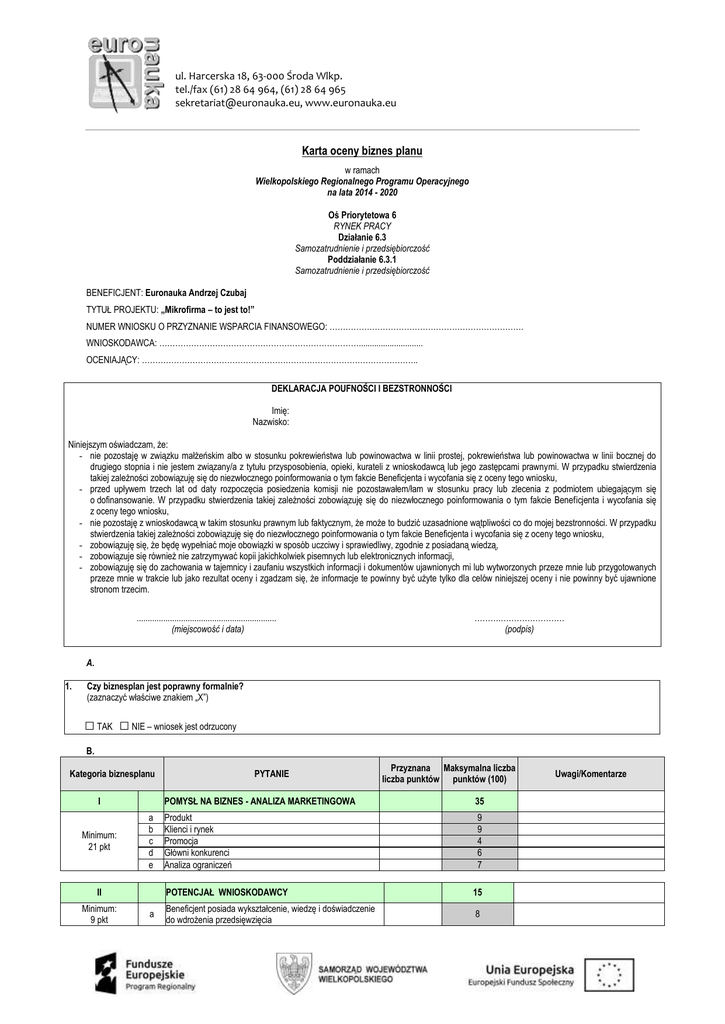 ul. Harcerska 18, 63-000 Środa Wlkp. tel./fax (61) 28 64 964, (61) 28 64 965 [email protected], www.euronauka.eu Karta oceny biznes planu w ramach Wielkopolskiego Regionalnego Programu Operacyjnego na lata 2014 - 2020 Oś Priorytetowa 6 RYNEK PRACY Działanie 6.3 Samozatrudnienie i przedsiębiorczość Poddziałanie 6.3.1 Samozatrudnienie i przedsiębiorczość BENEFICJENT: Euronauka Andrzej Czubaj TYTUŁ PROJEKTU: „Mikrofirma – to jest to!” NUMER WNIOSKU O PRZYZNANIE WSPARCIA FINANSOWEGO: ………………………………………………………………. WNIOSKODAWCA: …………………………………………………………………............................. OCENIAJĄCY: ………………………………………………………………………………………….. DEKLARACJA POUFNOŚCI I BEZSTRONNOŚCI Imię: Nazwisko: Niniejszym oświadczam, że: - nie pozostaję w związku małżeńskim albo w stosunku pokrewieństwa lub powinowactwa w linii prostej, pokrewieństwa lub powinowactwa w linii bocznej do drugiego stopnia i nie jestem związany/a z tytułu przysposobienia, opieki, kurateli z wnioskodawcą lub jego zastępcami prawnymi. W przypadku stwierdzenia takiej zależności zobowiązuję się do niezwłocznego poinformowania o tym fakcie Beneficjenta i wycofania się z oceny tego wniosku, - przed upływem trzech lat od daty rozpoczęcia posiedzenia komisji nie pozostawałem/łam w stosunku pracy lub zlecenia z podmiotem ubiegającym się o dofinansowanie. W przypadku stwierdzenia takiej zależności zobowiązuję się do niezwłocznego poinformowania o tym fakcie Beneficjenta i wycofania się z oceny tego wniosku, - nie pozostaję z wnioskodawcą w takim stosunku prawnym lub faktycznym, że może to budzić uzasadnione wątpliwości co do mojej bezstronności. W przypadku stwierdzenia takiej zależności zobowiązuję się do niezwłocznego poinformowania o tym fakcie Beneficjenta i wycofania się z oceny tego wniosku, - zobowiązuję się, że będę wypełniać moje obowiązki w sposób uczciwy i sprawiedliwy, zgodnie z posiadaną wiedzą, - zobowiązuje się również nie zatrzymywać kopii jakichkolwiek pisemnych lub elektronicznych informacji, - zobowiązuję się do zachowania w tajemnicy i zaufaniu wszystkich informacji i dokumentów ujawnionych mi lub wytworzonych przeze mnie lub przygotowanych przeze mnie w trakcie lub jako rezultat oceny i zgadzam się, że informacje te powinny być użyte tylko dla celów niniejszej oceny i nie powinny być ujawnione stronom trzecim. ............................................................... (miejscowość i data) ……….…………………… (podpis) A. 1. Czy biznesplan jest poprawny formalnie? (zaznaczyć właściwe znakiem „X”) □ TAK □ NIE – wniosek jest odrzucony B. Kategoria biznesplanu I Minimum: 21 pkt a b c d e II Minimum: 9 pkt a PYTANIE Przyznana Maksymalna liczba liczba punktów punktów (100) POMYSŁ NA BIZNES - ANALIZA MARKETINGOWA 35 Produkt Klienci i rynek Promocja Główni konkurenci Analiza ograniczeń 9 9 4 6 7 POTENCJAŁ WNIOSKODAWCY 15 Beneficjent posiada wykształcenie, wiedzę i doświadczenie do wdrożenia przedsięwzięcia 8 Uwagi/Komentarze ul. Harcerska 18, 63-000 Środa Wlkp. tel./fax (61) 28 64 964, (61) 28 64 965 [email protected], www.euronauka.eu b c Beneficjent dysponuje potencjałem technicznym do wdrożenia przedsięwzięcia OPŁACALNOŚĆ I EFEKTYWNOŚĆ EKONOMICZNA PRZEDSIĘWZIĘCIA Przewidywane wydatki są uzasadnione pod względem ekonomiczno-finansowym Wykonalność ekonomiczno-finansowa Prognoza finansowa a b OPERACYJNOŚĆ I KOMPLETNOŚĆ Przejrzystość, prostota, zrozumiałość założeń Całościowość opisu przedsięwzięcia b III Minimum: 24 pkt IV Minimum: 6 pkt a 7 40 16 20 4 10 5 5 Suma uzyskanych punktów: Czy wniosek otrzymał wymagane minimum 60 punktów ogółem Czy wniosek uzyskał minimalną liczbę punktów w poszczególnych kategoriach oceny □ TAK □ TAK Ocena biznes planu – dodatkowe punkty1 □ NIE □ NIE Przyznana liczba punktów Maksymalna liczba punktów dla uczestników, którzy planują utworzyć działalność w sektorze Odnawialnych Źródeł Energii dla uczestników, którzy planują utworzyć działalność w branżach o największym potencjale rozwojowym i smart specialisation 10 dla uczestników, którzy planują utworzyć dodatkowe miejsce pracy 10 Łączna otrzymana ilość dodatkowych punktów: 30 C. CZY WNIOSEK SPEŁNIA WYMAGANIA MINIMALNE, ABY UZYSKAĆ DOFINANSOWANIE? □ TAK □ NIE UZASADNIENIE OCENY PROJEKTU (MINIMUM 10 ZDAŃ): Kategoria I Kategoria II Kategoria III Kategoria IV Proponowana kwota dofinansowania PLN: ................................................ D. CZY WNIOSEK SPEŁNIA WYMAGANIA, ABY UZYSKAĆ WSPARCIE POMOSTOWE? □ TAK □ NIE UZASADNIENIE PRZYZNANIA WSPARCIA POMOSTOWEGO: 1 Przyznawane wyłącznie w przypadku osiągnięcia minimalnego, wymaganego progu punktowego. 10 ul. Harcerska 18, 63-000 Środa Wlkp. tel./fax (61) 28 64 964, (61) 28 64 965 [email protected], www.euronauka.eu Proponowana kwota wsparcia pomostowego na okres do 6 miesięcy od dnia faktycznego rozpoczęcia prowadzenia działalności gospodarczej PLN: ................................................ ............................................... (data, podpis)
