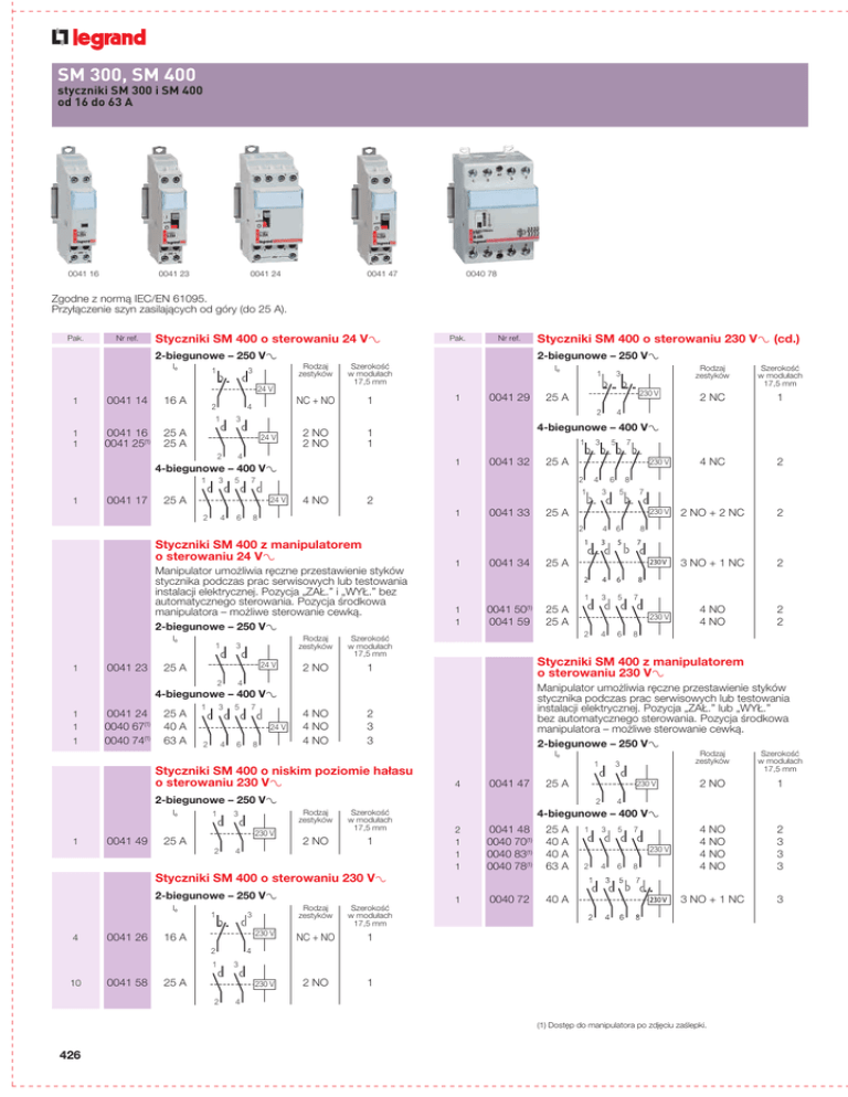 SM 300, SM 400 styczniki SM 300 i SM 400 od 16 do 63 A 0041 16 0041 23 0041 24 0041 47 0040 78 Zgodne z normą IEC/EN 61095. Przyłączenie szyn zasilających od góry (do 25 A). Pak. Nr ref. Styczniki SM 400 o sterowaniu 24 V± Pak. Nr ref. 2-biegunowe – 250 V± Ie 1 3 2-biegunowe – 250 V± Rodzaj zestyków Szerokość w modułach 17,5 mm NC + NO 1 24 V 1 0041 14 16 A 2 4 1 1 1 0041 16 0041 25(1) 2 NO 2 NO 0041 17 3 4 5 24 V 4 6 1 0041 32 3 5 7 2 4 6 8 0041 33 3 1 Ie 1 0041 23 1 3 24 V 25 A 2 Rodzaj zestyków Szerokość w modułach 17,5 mm 2 NO 1 1 1 1 0041 34 0041 50(1) 0041 59 1 0041 24 0040 67(1) 0040 74(1) 25 A 40 A 63 A 1 3 7 24 V 2 4 6 8 4 NO 4 NO 4 NO 4 NC 2 230 V 4 6 2 NO + 2 NC 2 3 5 230 V 3 NO + 1 NC 2 230 V 4 NO 4 NO 2 2 8 7 2 4 6 1 3 5 8 7 25 A 25 A 4 6 8 Styczniki SM 400 z manipulatorem o sterowaniu 230 V± 4 5 230 V 7 25 A 2 Manipulator umożliwia ręczne przestawienie styków stycznika podczas prac serwisowych lub testowania instalacji elektrycznej. Pozycja „ZAŁ.” lub „WYŁ.” bez automatycznego sterowania. Pozycja środkowa manipulatora – możliwe sterowanie cewką. 2-biegunowe – 250 V± 4-biegunowe – 400 V± 1 1 5 25 A 2 Manipulator umożliwia ręczne przestawienie styków stycznika podczas prac serwisowych lub testowania instalacji elektrycznej. Pozycja „ZAŁ.” i „WYŁ.” bez automatycznego sterowania. Pozycja środkowa manipulatora – możliwe sterowanie cewką. 2-biegunowe – 250 V± 1 4 1 1 1 Styczniki SM 400 z manipulatorem o sterowaniu 24 V± 2 NC 230 V 25 A 2 8 Szerokość w modułach 17,5 mm 4-biegunowe – 400 V± 1 4 NO Rodzaj zestyków 3 25 A 7 25 A 2 0041 29 1 1 4-biegunowe – 400 V± 1 1 3 24 V 1 Ie 2 25 A 25 A 2 Styczniki SM 400 o sterowaniu 230 V± (cd.) 2 3 3 Ie Styczniki SM 400 o niskim poziomie hałasu o sterowaniu 230 V± 4 0041 47 1 0041 49 25 A 1 3 230 V 2 4 Rodzaj zestyków Szerokość w modułach 17,5 mm 2 NO 1 3 2 4 230 V 25 A 2-biegunowe – 250 V± Ie 1 Rodzaj zestyków Szerokość w modułach 17,5 mm 2 NO 1 4 NO 4 NO 4 NO 4 NO 2 3 3 3 3 NO + 1 NC 3 4-biegunowe – 400 V± 2 1 1 1 0041 48 0040 70(1) 0040 83(1) 0040 78(1) 25 A 40 A 40 A 63 A 1 0040 72 40 A 1 3 5 7 230 V 2 4 6 8 Styczniki SM 400 o sterowaniu 230 V± 2-biegunowe – 250 V± Ie 4 10 0041 26 0041 58 1 3 2 4 230 V 16 A 1 3 2 4 25 A 230 V Rodzaj zestyków Szerokość w modułach 17,5 mm NC + NO 1 2 NO 1 (1) Dostęp do manipulatora po zdjęciu zaślepki. 426