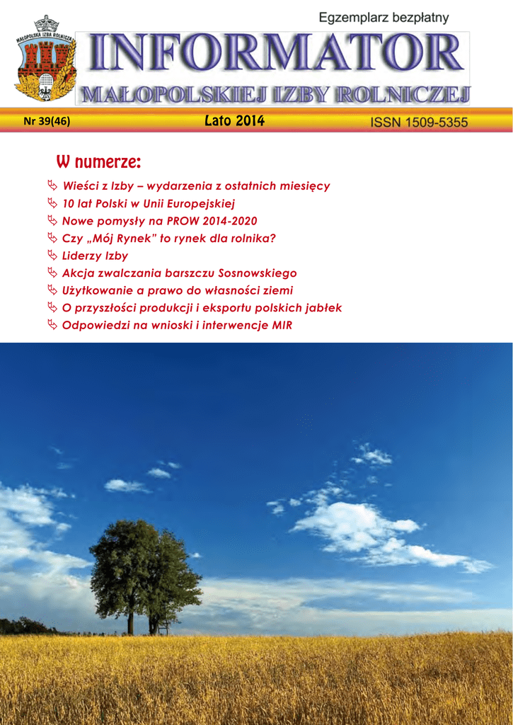 Nr 39(46) Lato 2014 W numerze: Wieści z Izby – wydarzenia z ostatnich miesięcy 10 lat Polski w Unii Europejskiej Nowe pomysły na PROW 2014-2020 Czy „Mój Rynek” to rynek dla rolnika? Liderzy Izby Akcja zwalczania barszczu Sosnowskiego Użytkowanie a prawo do własności ziemi O przyszłości produkcji i eksportu polskich jabłek Odpowiedzi na wnioski i interwencje MIR Biuletyn Informacyjny Małopolskiej Izby Rolniczej Biuletyn Informacyjny MIR Wydawca: Redaktor naczelny: Henryk Dankowiakowski Korekta, skład i opracowanie graficzne: Jolanta Kałmuk Fot na okładce: Mariusz Daćko Druk: Małopolska Izba Rolnicza Drukarnia TOP DRUK os. Krakowiaków 45a/15 ul. Nowogrodzka 151 A 31-964 Kraków 18-400 Łomża tel. (12) 643-16-87 tel./fax (86) 216-38-42 tel./fax (12) 643-17-62 Tekstów nie zamówionych redakcja nie zwraca, zastrzega e-mail: [email protected] sobie również prawo do skracania i opracowywania tekstów nie zamówionych. www.mir.krakow.pl Biuletyn Informacyjny Małopolskiej Izby Rolniczej Wieści z Izby Walne Zgromadzenie Małopolskiej Izby Rolniczej Henryk Dankowiakowski Tradycyjnie, w II kwartale roku organy różnych podmiotów gospodarczych odbywają walne zgromadzenie (walne zebranie delegatów), podsumowujące ubiegły rok i dokonujące oceny pracy zarządów. Ten obowiązek dotyczy również izb rolniczych. W dniu 6 czerwca 2014 r. Walne Zgromadzenie Małopolskiej Izby Rolniczej dokonało oceny realizacji planu działania Izby za 2013 r. oraz wykonania planu budżetu. Przygotowane sprawozdanie Zarządu MIR, podzielone na rozdziały, obejmowało wiele aspektów działalności samorządu rolniczego, było jednak przede wszystkim odpowiedzią na pytanie w jaki sposób Izba realizuje zadania zapisane w ustawie o izbach rolniczych oraz w swoim statucie. Dotyczą one głównie konieczności opracowania różnych analiz, będących odzwierciedleniem sytuacji w rolnictwie i na wsi. Przyjęta procedura miesięcznych i rocznych analiz wychodzi naprzeciw tym zadaniom. Są one przesyłane do wszystkich urzędów gmin województwa, instytucji rolniczych, wojewody i delegatów Izby. Przedstawiają one bieżącą sytuację prawną, organizacyjną a przede wszystkim ekonomiczną gospodarstw rolnych. Wynika z nich jednoznacznie (potwierdza to instytut ekonomiki rolnictwa), że był to kolejny rok spadku dochodów w rolnictwie. Załamanie rynku rzepaku, zbóż i trzody chlewnej przy wzrastających kosztach produkcji było główną przyczyną takiego stanu rzeczy. Lokalnie występujące huragany oraz podtopienia pogłębiły tę trudną sytuację. Natomiast o dobrej koniunkturze mogliśmy mówić oceniając produkcję mleka i owoców. Szczególnie ceny mleka, w ostatnim kwartale ubiegłego roku, dały satysfakcję rolnikom. Z niepokojem patrzymy w przyszłość – i to nie tylko przez pryzmat nowych założeń PROW, które nie dają wielu możliwości rozwojowych dla małych gospodarstw. Zapowiedź likwidacji kwot mlecznych, płatności cukrowych, uwolnienie rynku ziemi dla obcokrajowców, przyjęcie – dzięki układom stowarzyszeniowym – Ukrainy i Mołdawii do rynku Unii Europejskiej, tworzą nowe obszary rzeczywistości, do których musimy się szybko przygotować. Podsumowania minionego roku dokonał Prezes Zarządu Ryszard Czacki, koncentrując się na zagadnieniach dominujących w ubiegłorocznej działalności Izby (regionalizacja PROW, sprzedaż bezpośrednia, wapnowanie gleb, gospodarka ziemią, kwotowanie produkcji mleka). Delegaci jednogłośnie zaakceptowali sprawozdanie Zarządu, wykonanie budżetu oraz udzielili absolutorium dla Zarządu za 2013 rok. Wnioski przyjęte przez Walne Zgromadzenie • W nowym PROW utrzymać na dotychczasowym poziomie dopłaty do krów i owiec. • Informować na bieżąco delegatów rad powiatowych o wizytach delegacji zagranicznych odwiedzających gospodarstwa na terenie działania delegatów. • Wnioskować o zniesienie podatku od nieruchomości użytkowanych wspólnie przez grupy producenckie. • Wnioskować o wprowadzenie zmian w prawie spółdzielczym, tak by dziecko mogło dziedziczyć członkostwo po rodzicach. • Zwiększyć nakład kalendarzy izbowych na 2015 rok. • Wnioskować, aby ślimak winniczek i ślimak afrykański zostały wpisane na listę zwierząt gospodarskich • Dofinansować Piknik Warzywny w Proszowicach; • Wyjaśnić z jakich powodów rolnicy uczestniczący w systemach jakości żywności, którzy zakończyli w 2014 r. realizację programu rolnośrodowiskowego – pakiet rolnictwo ekologiczne – nie mogą odzyskać kosztów certyfikacji gospodarstw (kosztów netto za 2014 rok). Sprawozdanie z działalności Zarządu MIR za 2013 rok znajduje się na stronie internetowej www.mir.krakow.pl. Biuletyn Informacyjny Małopolskiej Izby Rolniczej 1 Analizy i komentarze 10 lat członkowstwa Polski w UE Dorota Korepta-Kura 1 maja 2014 roku obchodziliśmy jubileusz 10 lat członkostwa Polski w Unii Europejskiej. Rocznica stała się okazją do podsumowań i oceny zmian, jakie w wyniku integracji z UE nastąpiły w sektorze rolno-żywnościowym i na obszarach wiejskich naszego kraju. Akcesja do UE oznaczała dla polskiego rolnictwa i rybołówstwa istotną zmianę ekonomicznych warunków produkcji. W jej wyniku wdrożono w Polsce unijne polityki, w tym wspólną politykę rolną, wspólną politykę rybołówstwa i politykę handlową. Stosowane do tej pory przez Polskę instrumenty wsparcia w rolnictwie zostały dostosowane do zasad funkcjonowania na jednolitym rynku oraz do reguł dotyczących pomocy państwa. Przed akcesją pojawiało się wiele obaw, że polskie rolnictwo i sektor spożywczy nie będą w stanie sprostać konkurencji, a Polskę zaleje żywność z krajów UE. Rolnicy obawiali się, że będą zmuszeni ograniczyć produkcję, a ich dochody zmniejszą się znacząco. Niepokój budziła perspektywa konkurowania z nowoczesnymi przedsiębiorstwami krajów UE. Obawy te nie sprawdziły się. Włączeni