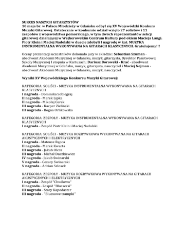 SUKCES NASZYCH GITARZYSTÓW 10 maja br. w Pałacu Młodzieży w Gdańsku odbył się XV Wojewódzki Konkurs Muzyki Gitarowej. Ostatecznie w konkursie udział wzięło 27 solistów i 11 zespołów z województwa pomorskiego, w tym dwóch reprezentantów sekcji gitarowej działającej w Wejherowskim Centrum Kultury pod okiem Macieja Langi. Piotr Klein i Maciej Nadolski w duecie zdobyli I nagrodę w kat. MUZYKA INSTRUMENTALNA WYKONYWANA NA GITARACH KLASYCZNYCH. Gratulujemy!!! Oceny prezentacji uczestników dokonało jury w składzie: Sebastian Szuman absolwent Akademii Muzycznej w Gdańsku, muzyk, gitarzysta, Dyrektor Państwowej Szkoły Muzycznej I stopnia w Kartuzach; Dariusz Borowski - Krać - absolwent Akademii Muzycznej w Gdańsku, muzyk, gitarzysta, nauczyciel i Maciej Nejman absolwent Akademii Muzycznej w Gdańsku, muzyk, nauczyciel. Wyniki XV Wojewódzkiego Konkursu Muzyki Gitarowej: KATEGORIA: SOLIŚCI - MUZYKA INSTRUMENTALNA WYKONYWANA NA GITARACH KLASYCZNYCH I nagroda - Dominika Sobiegraj II nagroda - Marek Lipka II nagroda - Mikołaj Cerek III nagroda - Kacper Zieliński III nagroda - Bogna Orlikowska KATEGORIA: ZESPOŁY - MUZYKA INSTRUMENTALNA WYKONYWANA NA GITARACH KLASYCZNYCH I nagroda - Zespół Piotr Klein i Maciej Nadolski KATEGORIA: SOLIŚCI - MUZYKA ROZRYWKOWA WYKONYWANA NA GITARACH AKUSTYCZNYCH I ELEKTRYCZNYCH I nagroda - Mateusz Rąpca II nagroda - Marek Kwarta III nagroda - Jakub Olesz III nagroda - Michał Daszkiewicz IV nagroda - Jakub Swinarski V nagroda - Cezary Swinarski V nagroda - Adrian Szlosek KATEGORIA: ZESPOŁY - MUZYKA ROZRYWKOWA WYKONYWANA NA GITARACH AKUSTYCZNYCH I ELEKTRYCZNYCH I nagroda - Zespół "Chwilowo" II nagroda - Zespół "Bluesersi" III nagroda - Stary Kapodaster III nagroda - "Bluesowe trampki"