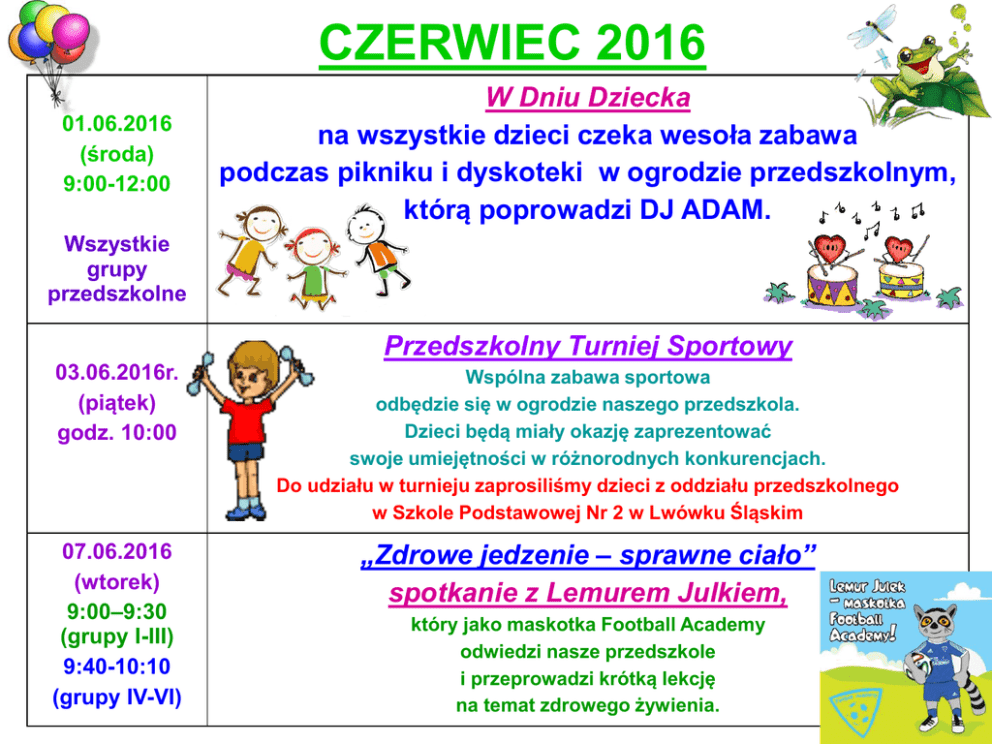 CZERWIEC 2016 01.06.2016 (środa) 9:00-12:00 W Dniu Dziecka na wszystkie dzieci czeka wesoła zabawa podczas pikniku i dyskoteki w ogrodzie przedszkolnym, którą poprowadzi DJ ADAM. Wszystkie grupy przedszkolne Przedszkolny Turniej Sportowy 03.06.2016r. (piątek) godz. 10:00 Wspólna zabawa sportowa odbędzie się w ogrodzie naszego przedszkola. Dzieci będą miały okazję zaprezentować swoje umiejętności w różnorodnych konkurencjach. Do udziału w turnieju zaprosiliśmy dzieci z oddziału przedszkolnego w Szkole Podstawowej Nr 2 w Lwówku Śląskim 07.06.2016 (wtorek) 9:00–9:30 (grupy I-III) 9:40-10:10 (grupy IV-VI) „Zdrowe jedzenie – sprawne ciało” spotkanie z Lemurem Julkiem, który jako maskotka Football Academy odwiedzi nasze przedszkole i przeprowadzi krótką lekcję na temat zdrowego żywienia. 08.06.2016r. (środa) 8:00-15:00 17.06.2016 (piątek) 15:30 Wycieczka do DINOPARKU w Szklarskiej Porębie, dla dzieci z grupy IV i V, które kończą edukację przedszkolną Szczegółowy plan wycieczki dostępny jest w ww. grupach. Przedszkolny Festyn Rodzinny organizowany przy współpracy Stowarzyszenie „Przedszkole Naszych Dzieci” Dobrą zabawę zapewnią występy artystyczne w wykonaniu CLOWN CIRCUS SHOW „RUPHERTA i RICCO”. Atrakcyjny bufet: ciasta, soki, specjały kuchni przedszkolnej. UROCZYSTE ZAKOŃCZENIE EDUKACJI PRZEDSZKOLEJ dzieci uczęszczających do 22.06.2016r., godz. 14:00 – grupa V 23.06.2016r., godz. 14:00 - grupa IV