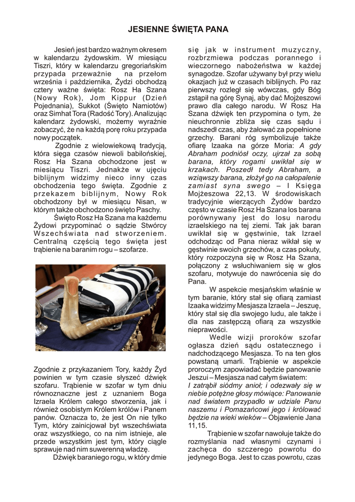 JESIENNE ŚWIĘTA PANA Jesień jest bardzo ważnym okresem w kalendarzu żydowskim. W miesiącu Tiszri, który w kalendarzu gregoriańskim przypada przeważnie na przełom września i października, Żydzi obchodzą cztery ważne święta: Rosz Ha Szana (Nowy Rok), Jom Kippur (Dzień Pojednania), Sukkot (Święto Namiotów) oraz Simhat Tora (Radość Tory). Analizując kalendarz żydowski, możemy wyraźnie zobaczyć, że na każdą porę roku przypada nowy początek. Zgodnie z wielowiekową tradycją, która sięga czasów niewoli babilońskiej, Rosz Ha Szana obchodzone jest w miesiącu Tiszri. Jednakże w ujęciu biblijnym widzimy nieco inny czas obchodzenia tego święta. Zgodnie z przekazem biblijnym, Nowy Rok obchodzony był w miesiącu Nisan, w którym także obchodzono święto Paschy. Święto Rosz Ha Szana ma każdemu Żydowi przypominać o sądzie Stwórcy Wszechświata nad stworzeniem. Centralną częścią tego święta jest trąbienie na baranim rogu – szofarze. Zgodnie z przykazaniem Tory, każdy Żyd powinien w tym czasie słyszeć dźwięk szofaru. Trąbienie w szofar w tym dniu równoznaczne jest z uznaniem Boga Izraela Królem całego stworzenia, jak i również osobistym Królem królów i Panem panów. Oznacza to, że jest On nie tylko Tym, który zainicjował byt wszechświata oraz wszystkiego, co na nim istnieje, ale przede wszystkim jest tym, który ciągle sprawuje nad nim suwerenną władzę. Dźwięk baraniego rogu, w który dmie s i ę j a k w i n s t r u m e n t m u z y c z n y, rozbrzmiewa podczas porannego i wieczornego nabożeństwa w każdej synagodze. Szofar używany był przy wielu okazjach już w czasach biblijnych. Po raz pierwszy rozległ się wówczas, gdy Bóg zstąpił na górę Synaj, aby dać Mojżeszowi prawo dla całego narodu. W Rosz Ha Szana dźwięk ten przypomina o tym, że nieuchronnie zbliża się czas sądu i nadszedł czas, aby żałować za popełnione grzechy. Barani róg symbolizuje także ofiarę Izaaka na górze Moria: A gdy Abraham podniósł oczy, ujrzał za sobą barana, który rogami uwikłał się w krzakach. Poszedł tedy Abraham, a wziąwszy barana, złożył go na całopalenie zamiast syna swego – I Księga Mojżeszowa 22,13. W środowiskach tradycyjnie wierzących Żydów bardzo często w czasie Rosz Ha Szana los barana porównywany jest do losu narodu izraelskiego na tej ziemi. Tak jak baran uwikłał się w gęstwinie, tak Izrael odchodząc od Pana nieraz wikłał się w gęstwinie swoich grzechów, a czas pokuty, który rozpoczyna się w Rosz Ha Szana, połączony z wsłuchiwaniem się w głos szofaru, motywuje do nawrócenia się do Pana. W aspekcie mesjańskim właśnie w tym baranie, który stał się ofiarą zamiast Izaaka widzimy Mesjasza Izraela – Jeszuę, który stał się dla swojego ludu, ale także i dla nas zastępczą ofiarą za wszystkie nieprawości. Wedle wizji proroków szofar ogłasza dzień sądu ostatecznego i nadchodzącego Mesjasza. To na ten głos powstaną umarli. Trąbienie w aspekcie proroczym zapowiadać będzie panowanie Jeszui – Mesjasza nad całym światem: I zatrąbił siódmy anioł; i odezwały się w niebie potężne głosy mówiące: Panowanie nad światem przypadło w udziale Panu naszemu i Pomazańcowi jego i królować będzie na wieki wieków – Objawienie Jana 11,15. Trąbienie w szofar nawołuje także do rozmyślania nad własnymi czynami i zachęca do szczerego powrotu do jedynego Boga. Jest to czas powrotu, czas przyjrzenia się swojej drodze i uczynkom. Po tym święcie następuje dziesięć dni postu i pokuty, które w języku hebrajskim nazywane są Jamim Noraim (Straszne Dni). Jest to czas pokuty, skruchy i żalu za popełnione zło. Właśnie te dni wprowadzają nas do kolejnego święta – Jom Kippur (Święta Pojednania). W przeddzień tego wyjątkowego święta każdy bogobojny Żyd udaje się do swoich bliskich, sąsiadów i do każdego, kogo mógł obrazić czy zranić. Musi ukorzyć się przed wszystkimi przyjaciółmi i wrogami, wyrównać stare rachunki i zapłacić długi. W uroczysty dzień Jom Kippur nabożeństwo w synagodze trwa prawie cały dzień. Najważniejszą jego częścią jest modlitwa o przebaczenie grzechów – Avinu Malkeinu. W tym czasie każdy modli się nie tylko za siebie, ale także za wszystkich Żydów na całym świecie. Jedna z modlitw zanoszonych do Boga w tym czasie brzmi następująco: Boże nasz i Boże praojców naszych, oby doszła przed Ciebie modlitwa nasza, a nie odwracaj się od błagania naszego, bo nie jesteśmy tak zuchwałego oblicza, ani zatwardziałego karku, by mówić przed Tobą: Wiekuisty, Boże nasz i Boże praojców naszych,sprawiedliwi jesteśmy i nie grzeszyliśmy - zaiste myśmy zgrzeszyli (...) Odstąpiliśmy od przykazań Twoich i od Praw Twoich dobrych i nie dały korzyści nam, ale Tyś sprawiedliwy we wszystkim, co przyszło na nas, gdyż prawdę wykonywałeś, a myśmy zło czynili (...) Cóż mamy mówić przed Tobą, siedzący na wyżynach! i cóż powiemy Tobie, tronujący w niebiosach! czyż nie wszystko tajne i jawne Ty znasz? (...) Ty znasz tajemnice świata i najskrytsze tajniki wszystkich żyjących. Ty badasz wszystkie zakątki wnętrza i doświadczasz nerwy i serce. Nie ma rzeczy ukrytej przed Tobą i nic tajnego przed oczyma Twymi A zatem oby było wolą Twoją, Wiekuisty, Boże nasz i Boże praojców naszych, abyś dał przebaczenie nam za wszystkie grzechy nasze, i odpuszczenie nam za wszystkie winy nasze i wybaczenie za wszystkie błędy nasze (...) Pamiętaj nas, Wiekuisty, Boże nasz, w nim [Dniu Pojednania] ku dobremu i obdarz nas w nim błogosławieństwem i dopomóż nam w nim do życia. A słowem zbawienia i miłosierdzia osłoń nas i bądź nam łaskawym i zmiłuj się nad nami i zbaw nas, gdyż do Ciebie zwrócone są oczy nasze, gdyż Bogiem, Królem najlitościwszym i najmiłosierniejszym jesteś Ty. Na zakończenie nabożeństwa po raz ostatni rozlega się głos szofaru i 