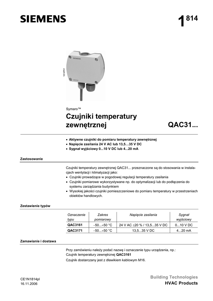 1814P01 1 814 Symaro™ Czujniki temperatury zewnętrznej QAC31... • Aktywne czujniki do pomiaru temperatury zewnętrznej • Napięcie zasilania 24 V AC lub 13,5…35 V DC • Sygnał wyjściowy 0...10 V DC lub 4...20 mA Zastosowanie Czujniki temperatury zewnętrznej QAC31... przeznaczone są do stosowania w instalacjach wentylacji i klimatyzacji jako: • Czujniki prowadzące w pogodowej regulacji temperatury zasilania • Czujniki pomiarowe wykorzystywane np. do optymalizacji lub do podłączenia do systemu zarządzania budynkiem • Wysokiej jakości czujniki pomieszczeniowe do pomiaru temperatury w przestrzeniach obiektów handlowych. Zestawienie typów Oznaczenie typu Zakres pomiarowy Napięcie zasilania Sygnał wyjściowy QAC3161 −50...+50 °C 24 V AC ±20 % / 13,5...35 V DC 0...10 V DC QAC3171 −50...+50 °C 13,5...35 V DC 4...20 mA Zamawianie i dostawa Przy zamówieniu należy podać nazwę i oznaczenie typu urządzenia, np.: Czujnik temperatury zewnętrznej QAC3161 Czujnik dostarczany jest z dławikiem kablowym M16. CE1N1814pl 16.11.2006 Building Technologies HVAC Products Urządzenia współpracujące Wszystkie systemy lub urządzenia, do których można podłączyć aktywny sygnał wyjściowy czujnika 0...10 V DC lub 4...20 mA. Działanie Czujnik dokonuje pomiaru temperatury zewnętrznej za pomocą elementu pomiarowego, którego rezystancja zmienia się w funkcji temperatury. Zmiana rezystancji przetwarzana jest na sygnał wyjściowy 0...10 V DC lub 4...20 mA, zależnie od typu czujnika. Sygnał wyjściowy odpowiada wybranemu zakresowi temperatury. Sygnał pomiarowy z czujnika podłączany jest do odpowiedniego regulatora. Sygnał wyjściowy, zacisk I1 1814D02pl Wykres obciążenia 900 Obciążenie [Ω] 800 Zakres niedozwolony! 700 600 Zakres dozwolony 500 400 300 200 100 0 0 10 20 30 40 Napięcie zasilania [V DC] Budowa Kanałowy czujnik temperatury QAC31... składa się z obudowy, obwodu drukowanego, zacisków podłączeniowych i sondy pomiarowej. W skład dwuczęściowej obudowy wchodzi podstawa oraz zdejmowana pokrywa (mocowana wkrętami). Obwód pomiarowy i element nastawczy umieszczone są na obwodzie drukowanym wewnątrz pokrywy, a zaciski podłączeniowe znajdują się w podstawie. Sonda pomiarowa przykręcona jest do obudowy od dołu. Przewody mogą być doprowadzone do czujnika od tyłu (okablowanie podtynkowe) lub od dołu (okablowanie natynkowe). Do tego celu, w podstawie można wyłamać specjalny otwór lub zastosować dławik kablowy M16 przykręcając go od dołu do podstawy. Range 1 2 3 Zakres temp. 123 Funkcja testowania U1 I1 10 V 20 mA 5V 12 mA 0V 4 mA 5V 12 mA 1814Z03pl Element nastawczy Element nastawczy umieszczony jest wewnątrz pokrywy. Składa się z 6-pinowego złącza oraz zwory. Element ten jest używany do wyboru wymaganego zakresu pomiarowego oraz do włączania funkcji testowania. 2/6 Building Technologies HVAC Products Czujniki temperatury zewnętrznej QAC3161, QAC3171 CE1N1814pl 16.11.2006 Różne położenia zwory mają następujące znaczenie: • Do wyboru zakresu pomiarowego: Zwora w lewym położeniu (R1) = 0...50 °C Zwora w środkowym położeniu (R2) = −50...+50 °C (nastawa fabryczna) Zwora w prawym położeniu (R3) = −35...+35 °C • Do uaktywnienia funkcji testowania: Zwora w położeniu poziomym. Sygnał wyjściowy czujnika przyjmuje wartości zgodnie z tabelką „Funkcja testowania”. Awaria W przypadku awarii, sygnał wyjściowy czujnika przyjmuje wartość 0 V (4 mA) po upływie 60 sekund. Wskazówki do projektowania Do zasilania czujnika wymagany jest transformator na niskie napięcie bezpieczne (SELV) z odseparowanymi uzwojeniami i przeznaczony do pracy ze 100 % obciążeniem. Przy doborze i elektrycznym zabezpieczaniu transformatora należy przestrzegać lokalnych przepisów dotyczących bezpieczeństwa. Przy doborze transformatora należy uwzględnić pobór mocy czujnika temperatury zewnętrznej. Informacje dotyczące prawidłowego okablowania – patrz karta katalogowa urządzenia, z którym czujnik jest stosowany. Przestrzegać dopuszczalnych długości przewodów. Prowadzenie i dobór kabli Przy układaniu kabli pamiętać, że im dłuższe są równolegle prowadzone kable i im mniejsza między nimi odległość, tym większe występują zakłócenia elektryczne. Do wtórnej strony zasilania i do linii sygnałowych wymagana jest skrętka. Wskazówki do montażu Zależnie od zastosowania, czujnik temperatury może być montowany następująco: Miejsce montażu • Przy regulacji: Na ścianie domu lub budynku z oknami najczęściej użytkowanego pomieszczenia, ale na czujnik nie może oddziaływać poranne promieniowanie słoneczne. W razie wątpliwości, czujnik należy montować na północnej lub północno-zachodniej ścianie. • Przy optymalizacji: Zawsze na najzimniejszej ścianie domu lub budynku (zwykle ściana północna). Czujnik w żadnym wypadku nie może być narażony na poranne promieniowanie słoneczne. Wysokość montażu Montaż czujnika zaleca się wykonać na środku domu lub budynku lub strefy grzewczej, ale na wysokości nad ziemią co najmniej 2,5 m. Czujnika nie można montować w następujących miejscach: • Nad oknami, drzwiami, wywietrznikami lub innymi źródłami ciepła • Pod balkonami lub okapami dachowymi Aby uniknąć błędów pomiaru spowodowanych cyrkulacją powietrza, korytko kablowe przy czujniku powinno być uszczelnione. Czujnika nie wolno malować. Instrukcja montażu wydrukowana jest na opakowaniu. Wskazówki do uruchomienia Przed włączeniem zasilania sprawdzić okablowanie. W razie potrzeby, w czujniku ustawić wymagany zakres pomiarowy temperatury. 3/6 Building Technologies HVAC Products Czujniki temperatury zewnętrznej QAC3161, QAC3171 CE1N1814pl 16.11.2006 Dane techniczne Zasilanie Napięcie zasilania Częstotliwość Pobór mocy Długość kabla sygnału pomiarowego Dopuszczalne długości kabla Kabel miedziany ∅0,6 mm Kabel miedziany 1,0 mm2 Kabel miedz