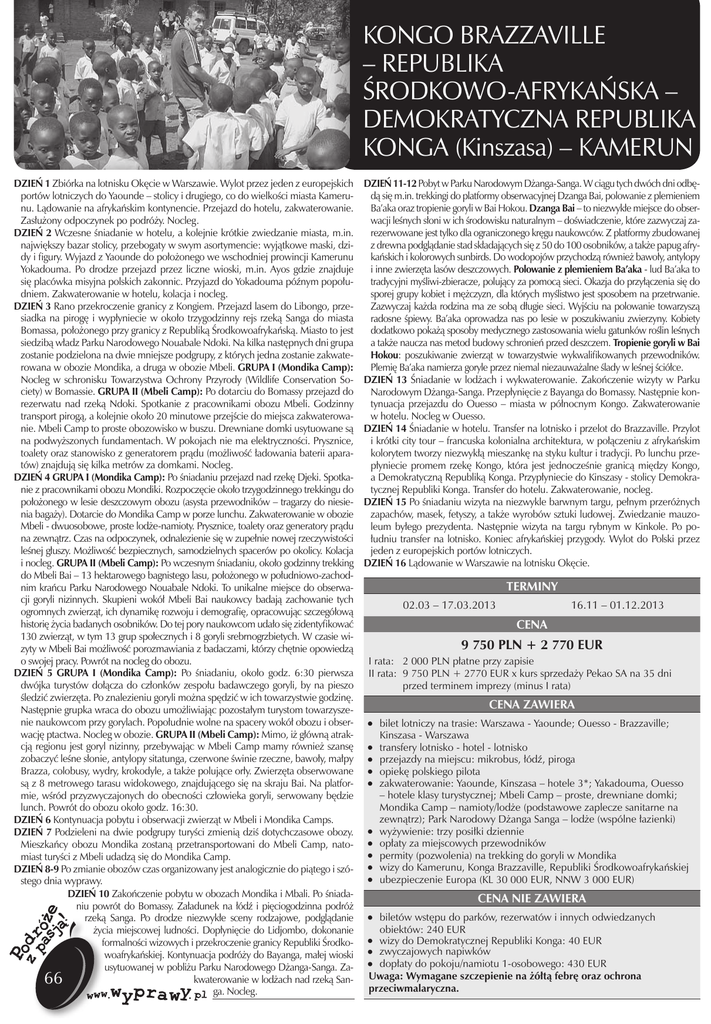 Kongo BrazzaVILLE – REPUBLIKA Środkowo-afrykańska – Demokratyczna Republika Konga (Kinszasa) – Kamerun DZIEŃ 1 Zbiórka na lotnisku Okęcie w Warszawie. Wylot przez jeden z europejskich portów lotniczych do Yaounde – stolicy i drugiego, co do wielkości miasta Kamerunu. Lądowanie na afrykańskim kontynencie. Przejazd do hotelu, zakwaterowanie. Zasłużony odpoczynek po podróży. Nocleg. DZIEŃ 2 Wczesne śniadanie w hotelu, a kolejnie krótkie zwiedzanie miasta, m.in. największy bazar stolicy, przebogaty w swym asortymencie: wyjątkowe maski, dzidy i figury. Wyjazd z Yaounde do położonego we wschodniej prowincji Kamerunu Yokadouma. Po drodze przejazd przez liczne wioski, m.in. Ayos gdzie znajduje się placówka misyjna polskich zakonnic. Przyjazd do Yokadouma późnym popołudniem. Zakwaterowanie w hotelu, kolacja i nocleg. DZIEŃ 3 Rano przekroczenie granicy z Kongiem. Przejazd lasem do Libongo, przesiadka na pirogę i wypłyniecie w około trzygodzinny rejs rzeką Sanga do miasta Bomassa, położonego przy granicy z Republiką Środkowoafrykańską. Miasto to jest siedzibą władz Parku Narodowego Nouabale Ndoki. Na kilka następnych dni grupa zostanie podzielona na dwie mniejsze podgrupy, z których jedna zostanie zakwaterowana w obozie Mondika, a druga w obozie Mbeli. GRUPA I (Mondika Camp): Nocleg w schronisku Towarzystwa Ochrony Przyrody (Wildlife Conservation Society) w Bomassie. GRUPA II (Mbeli Camp): Po dotarciu do Bomassy przejazd do rezerwatu nad rzeką Ndoki. Spotkanie z pracownikami obozu Mbeli. Godzinny transport pirogą, a kolejnie około 20 minutowe przejście do miejsca zakwaterowanie. Mbeli Camp to proste obozowisko w buszu. Drewniane domki usytuowane są na podwyższonych fundamentach. W pokojach nie ma elektryczności. Prysznice, toalety oraz stanowisko z generatorem prądu (możliwość ładowania baterii aparatów) znajdują się kilka metrów za domkami. Nocleg. DZIEŃ 4 GRUPA I (Mondika Camp): Po śniadaniu przejazd nad rzekę Djeki. Spotkanie z pracownikami obozu Mondiki. Rozpoczęcie około trzygodzinnego trekkingu do położonego w lesie deszczowym obozu (asysta przewodników – tragarzy do niesienia bagaży). Dotarcie do Mondika Camp w porze lunchu. Zakwaterowanie w obozie Mbeli - dwuosobowe, proste lodże-namioty. Prysznice, toalety oraz generatory prądu na zewnątrz. Czas na odpoczynek, odnalezienie się w zupełnie nowej rzeczywistości leśnej głuszy. Możliwość bezpiecznych, samodzielnych spacerów po okolicy. Kolacja i nocleg. GRUPA II (Mbeli Camp): Po wczesnym śniadaniu, około godzinny trekking do Mbeli Bai – 13 hektarowego bagnistego lasu, położonego w południowo-zachodnim krańcu Parku Narodowego Nouabale Ndoki. To unikalne miejsce do obserwacji goryli nizinnych. Skupieni wokół Mbeli Bai naukowcy badają zachowanie tych ogromnych zwierząt, ich dynamikę rozwoju i demografię, opracowując szczegółową historię życia badanych osobników. Do tej pory naukowcom udało się zidentyfikować 130 zwierząt, w tym 13 grup społecznych i 8 goryli srebrnogrzbietych. W czasie wizyty w Mbeli Bai możliwość porozmawiania z badaczami, którzy chętnie opowiedzą o swojej pracy. Powrót na nocleg do obozu. DZIEŃ 5 GRUPA I (Mondika Camp): Po śniadaniu, około godz. 6:30 pierwsza dwójka turystów dołącza do członków zespołu badawczego goryli, by na pieszo śledzić zwierzęta. Po znalezieniu goryli można spędzić w ich towarzystwie godzinę. Następnie grupka wraca do obozu umożliwiając pozostałym turystom towarzyszenie naukowcom przy gorylach. Popołudnie wolne na spacery wokół obozu i obserwację ptactwa. Nocleg w obozie. GRUPA II (Mbeli Camp): Mimo, iż główną atrakcją regionu jest goryl nizinny, przebywając w Mbeli Camp mamy również szansę zobaczyć leśne słonie, antylopy sitatunga, czerwone świnie rzeczne, bawoły, małpy Brazza, colobusy, wydry, krokodyle, a także polujące orły. Zwierzęta obserwowane są z 8 metrowego tarasu widokowego, znajdującego się na skraju Bai. Na platformie, wśród przyzwyczajonych do obecności człowieka goryli, serwowany będzie lunch. Powrót do obozu około godz. 16:30. DZIEŃ 6 Kontynuacja pobytu i obserwacji zwierząt w Mbeli i Mondika Camps. DZIEŃ 7 Podzieleni na dwie podgrupy turyści zmienią dziś dotychczasowe obozy. Mieszkańcy obozu Mondika zostaną przetransportowani do Mbeli Camp, natomiast turyści z Mbeli udadzą się do Mondika Camp. DZIEŃ 8-9 Po zmianie obozów czas organizowany jest analogicznie do piątego i szóstego dnia wyprawy. DZIEŃ 10 Zakończenie pobytu w obozach Mondika i Mbali. Po śniadaniu powrót do Bomassy. Załadunek na łódź i pięciogodzinna podróż rzeką Sanga. Po drodze niezwykłe sceny rodzajowe, podglądanie życia miejscowej ludności. Dopłynięcie do Lidjombo, dokonanie formalności wizowych i przekroczenie granicy Republiki Środkowoafrykańskiej. Kontynuacja podróży do Bayanga, małej wioski usytuowanej w pobliżu Parku Narodowego Dżanga-Sanga. Zakwaterowanie w lodżach nad rzeką Sanga. Nocleg. 66 DZIEŃ 11-12 Pobyt w Parku Narodowym Dżanga-Sanga. W ciągu tych dwóch dni odbędą się m.in. trekkingi do platformy obserwacyjnej Dzanga Bai, polowanie z plemieniem Ba’aka oraz tropienie goryli w Bai Hokou. Dzanga Bai – to niezwykłe miejsce do obserwacji leśnych słoni w ich środowisku naturalnym – doświadczenie, które zazwyczaj zarezerwowane jest tylko dla ograniczonego kręgu naukowców. Z platformy zbudowanej z drewna podglądanie stad składających się z 50 do 100 osobników, a także papug afrykańskich i kolorowych sunbirds. Do wodopojów przychodzą również bawoły, antylopy i inne zwierzęta lasów deszczowych. Polowanie z plemieniem Ba’aka - lud Ba’aka to tradycyjni myśliwi-zbieracze, polujący za pomocą sieci. Okazja do przyłączenia się do sporej grupy kobiet i mężczyzn, dla których myślistwo jest sposobem na przetrwanie. Zazwyczaj każda rodzina ma ze sobą długie sieci. Wyj