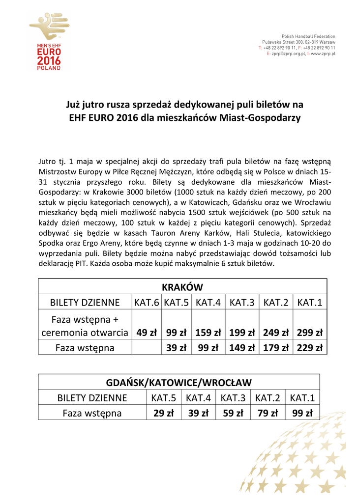 Polish Handball Federation Puławska Street 300, 02-819 Warsaw T: +48 22 892 90 11, F: +48 22 892 90 11 E: [email protected], I: www.zprp.pl Już jutro rusza sprzedaż dedykowanej puli biletów na EHF EURO 2016 dla mieszkańców Miast-‐Gospodarzy Jutro tj. 1 maja w specjalnej akcji do sprzedaży trafi pula biletów na fazę wstępną Mistrzostw Europy w Piłce Ręcznej Mężczyzn, które odbędą się w Polsce w dniach 15-‐ 31 stycznia przyszłego roku. Bilety są dedykowane dla mieszkańców Miast-‐ Gospodarzy: w Krakowie 3000 biletów (1000 sztuk na każdy dzień meczowy, po 200 sztuk w pięciu kategoriach cenowych), a w Katowicach, Gdańsku oraz we Wrocławiu mieszkańcy będą mieli możliwość nabycia 1500 sztuk wejściówek (po 500 sztuk na każdy dzień meczowy, 100 sztuk w każdej z pięciu kategorii cenowych). Sprzedaż odbywać się będzie w kasach Tauron Areny Karków, Hali Stulecia, katowickiego Spodka oraz Ergo Areny, które będą czynne w dniach 1-‐3 maja w godzinach 10-‐20 do wyprzedania puli. Bilety będzie można nabyć przedstawiając dowód tożsamości lub deklarację PIT. Każda osoba może kupić maksymalnie 6 sztuk biletów. BILETY DZIENNE KRAKÓW KAT.6 KAT.5 KAT.4 KAT.3 KAT.2 KAT.1 Faza wstępna + ceremonia otwarcia 49 zł 99 zł 159 zł 199 zł 249 zł 299 zł Faza wstępna 39 zł 99 zł 149 zł 179 zł 229 zł GDAŃSK/KATOWICE/WROCŁAW BILETY DZIENNE KAT.5 KAT.4 KAT.3 KAT.2 KAT.1 Faza wstępna 29 zł 39 zł 59 zł 79 zł 99 zł 1 Polish Handball Federation Puławska Street 300, 02-819 Warsaw T: +48 22 892 90 11, F: +48 22 892 90 11 E: [email protected], I: www.zprp.pl Mapka z cenami oraz kategoriami dedykowanej puli biletów na fazę wstępną dla mieszkańców Gdańska. Kolorowe sektory to bilety uruchomione do sprzedaży 1 maja. 2 Polish Handball Federation Puławska Street 300, 02-819 Warsaw T: +48 22 892 90 11, F: +48 22 892 90 11 E: [email protected], I: www.zprp.pl Mapka z cenami oraz kategoriami dedykowanej puli biletów na fazę wstępną dla mieszkańców Katowic. Kolorowe sektory to bilety uruchomione do sprzedaży 1 maja. 3 Polish Handball Federation Puławska Street 300, 02-819 Warsaw T: +48 22 892 90 11, F: +48 22 892 90 11 E: [email protected], I: www.zprp.pl Mapka z cenami oraz kategoriami dedykowanej puli biletów na fazę wstępną dla mieszkańców Krakowa. Kolorowe sektory to bilety uruchomione do sprzedaży 1 maja. 4 Polish Handball Federation Puławska Street 300, 02-819 Warsaw T: +48 22 892 90 11, F: +48 22 892 90 11 E: [email protected], I: www.zprp.pl Mapka z cenami oraz kategoriami dedykowanej puli biletów na fazę wstępną dla mieszkańców Wrocławia. Kolorowe sektory to bilety uruchomione do sprzedaży 1 maja. 5