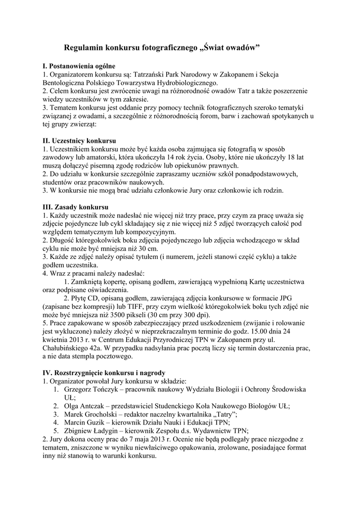 Regulamin konkursu fotograficznego „Świat owadów” I. Postanowienia ogólne 1. Organizatorem konkursu są: Tatrzański Park Narodowy w Zakopanem i Sekcja Bentologiczna Polskiego Towarzystwa Hydrobiologicznego. 2. Celem konkursu jest zwrócenie uwagi na różnorodność owadów Tatr a także poszerzenie wiedzy uczestników w tym zakresie. 3. Tematem konkursu jest oddanie przy pomocy technik fotograficznych szeroko tematyki związanej z owadami, a szczególnie z różnorodnością forom, barw i zachowań spotykanych u tej grupy zwierząt: II. Uczestnicy konkursu 1. Uczestnikiem konkursu może być każda osoba zajmująca się fotografią w sposób zawodowy lub amatorski, która ukończyła 14 rok życia. Osoby, które nie ukończyły 18 lat muszą dołączyć pisemną zgodę rodziców lub opiekunów prawnych. 2. Do udziału w konkursie szczególnie zapraszamy uczniów szkół ponadpodstawowych, studentów oraz pracowników naukowych. 3. W konkursie nie mogą brać udziału członkowie Jury oraz członkowie ich rodzin. III. Zasady konkursu 1. Każdy uczestnik może nadesłać nie więcej niż trzy prace, przy czym za pracę uważa się zdjęcie pojedyncze lub cykl składający się z nie więcej niż 5 zdjęć tworzących całość pod względem tematycznym lub kompozycyjnym. 2. Długość któregokolwiek boku zdjęcia pojedynczego lub zdjęcia wchodzącego w skład cyklu nie może być mniejsza niż 30 cm. 3. Każde ze zdjęć należy opisać tytułem (i numerem, jeżeli stanowi część cyklu) a także godłem uczestnika. 4. Wraz z pracami należy nadesłać: 1. Zamkniętą kopertę, opisaną godłem, zawierającą wypełnioną Kartę uczestnictwa oraz podpisane oświadczenia. 2. Płytę CD, opisaną godłem, zawierającą zdjęcia konkursowe w formacie JPG (zapisane bez kompresji) lub TIFF, przy czym wielkość któregokolwiek boku tych zdjęć nie może być mniejsza niż 3500 pikseli (30 cm przy 300 dpi). 5. Prace zapakowane w sposób zabezpieczający przed uszkodzeniem (zwijanie i rolowanie jest wykluczone) należy złożyć w nieprzekraczalnym terminie do godz. 15.00 dnia 24 kwietnia 2013 r. w Centrum Edukacji Przyrodniczej TPN w Zakopanem przy ul. Chałubińskiego 42a. W przypadku nadsyłania prac pocztą liczy się termin dostarczenia prac, a nie data stempla pocztowego. IV. Rozstrzygnięcie konkursu i nagrody 1. Organizator powołał Jury konkursu w składzie: 1. Grzegorz Tończyk – pracownik naukowy Wydziału Biologii i Ochrony Środowiska UŁ; 2. Olga Antczak – przedstawiciel Studenckiego Koła Naukowego Biologów UŁ; 3. Marek Grocholski – redaktor naczelny kwartalnika „Tatry”; 4. Marcin Guzik – kierownik Działu Nauki i Edukacji TPN; 5. Zbigniew Ładygin – kierownik Zespołu d.s. Wydawnictw TPN; 2. Jury dokona oceny prac do 7 maja 2013 r. Ocenie nie będą podlegały prace niezgodne z tematem, zniszczone w wyniku niewłaściwego opakowania, zrolowane, posiadające format inny niż stanowią to warunki konkursu. 3. Jury zakwalifikuje prace do udziału w wystawie pokonkursowej. 4. W konkursie zostaną przyznane nagrody rzeczowe 5. Jury ma prawo dokonać innego podziału nagród lub nie przyznać ich wcale. Może też przyznać wyróżnienia i nagrody specjalne. Organizatorzy zastrzegają możliwość przyznania indywidualnych nagród sponsorskich. Prace wybrane spośród nagrodzonych zostaną opublikowane w kwartalniku „Tatry”, za co należeć się będzie honorarium w wysokości zgodnej z aktualną tabelą stawek stosowanych w TPN. Osoby nagrodzone zostaną o tym poinformowane niezwłocznie mailowo lub telefonicznie. 5. Wyniki konkursu zostaną ogłoszone 8 maja 2013 r. o godzinie 18.30 na spotkaniu podsumowującym wyniki konkursu w Centrum Edukacji Przyrodniczej TPN w Zakopanem przy ul. Chałubińskiego 42a. Wtedy też nastąpi otwarcie wystawy pokonkursowej. V. Postanowienia końcowe 1. Z chwilą nadesłania egzemplarze prac przechodzą na własność organizatorów, z zachowaniem praw autorskich. 2. Udział w konkursie jest jednoznaczny z nieodpłatnym udzieleniem Organizatorom przez jego uczestnika licencji nie wyłącznej na wszelkich znanych polach eksploatacji. 3. Udział w konkursie jest równoznaczny z wyrażeniem przez uczestnika dobrowolnej zgody na zbieranie i przetwarzanie przez Organizatora jego danych osobowych, na zasadach określonych w Ustawie o ochronie danych osobowych z dnia 29.08.1997 r. (Dz. U. z 2002 r. Nr 133, poz. 833 ze zm.), w celach określonych w regulaminie konkursu. 4. Wszelkie sprawy nieuwzględnione w regulaminie rozstrzyga jury. 5. Informacji na temat konkursu udziela Łukasz Pęksa, tel. 18 20 23 353, e-mail: [email protected] KARTA UCZESTNIKA KONKURSU FOTOGRAFII PRZYRODNICZEJ „ŚWIAT OWADÓW” IMIĘ I NAZWISKO AUTORA GODŁO ADRES TELEFON E-MAIL 1. TYTUŁY PRAC w poszczególnych kategoriach 2. 3. OŚWIADCZENIE Oświadczam, że złożone przeze mnie prace nie naruszają praw osób trzecich, a w szczególności prawa do ochrony wizerunku (Art. 81 Ustawa o prawie autorskim i prawach pokrewnych z 4 lutego 1994, tekst ujednolicony Dz. U. 06.90.631). …………………………………….. /data, czytelny podpis/ Oświadczam, iż zostałem(-am) poinformowany(-a) o celach pozyskania moich danych osobowych i wyrażam dobrowolnie zgodę na zbieranie i przetwarzanie moich danych osobowych, na zasadach określonych w Ustawie o ochronie danych osobowych z dnia 29.08.1997 r. (Dz. U. z 2002 r. Nr 133, poz. 833 ze zm.) przez organizatora konkursu fotograficznego, którym jest Tatrzański Park Narodowy, z siedzibą w Zakopanem, przy ul. Chałubińskiego 42 a, w celach określonych w regulaminie konkursu. ......................... /data, czytelny podpis/ Oświadczam, że wyrażam zgodę ......................................., będącemu (będącej) osobą niepełnoletnią na udział w konkursie fotograficznym „Zapisane w skale”. ......................... /data, czytelny podpis/