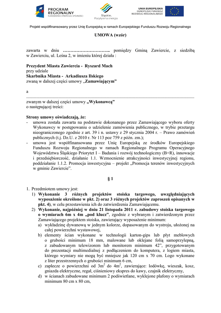 Projekt współfinansowany przez Unię Europejską w ramach Europejskiego Funduszu Rozwoju Regionalnego UMOWA (wzór) zawarta w dniu ………………………….. pomiędzy Gminą Zawiercie, z siedzibą w Zawierciu, ul. Leśna 2, w imieniu której działa : Prezydent Miasta Zawiercia - Ryszard Mach przy udziale Skarbnika Miasta - Arkadiusza Ilskiego zwaną w dalszej części umowy „Zamawiającym” a ....................................................................................................................................................... zwanym w dalszej części umowy „Wykonawcą” o następującej treści: Strony umowy oświadczają, że: - umowa została zawarta na podstawie dokonanego przez Zamawiającego wyboru oferty Wykonawcy w postępowaniu o udzielenie zamówienia publicznego, w trybie przetargu nieograniczonego zgodnie z art. 39 i n. ustawy z 29 stycznia 2004 r. – Prawo zamówień publicznych (t.j. Dz.U. z 2010 r. Nr 113 poz 759 z późn. zm.); - umowa jest współfinansowana przez Unię Europejską ze środków Europejskiego Funduszu Rozwoju Regionalnego w ramach Regionalnego Programu Operacyjnego Województwa Śląskiego Priorytet I – Badania i rozwój technologiczny (B+R), innowacje i przedsiębiorczość, działanie 1.1. Wzmocnienie atrakcyjności inwestycyjnej regionu, poddziałanie 1.1.2. Promocja inwestycyjna – projekt „Promocja terenów inwestycyjnych w gminie Zawiercie”. §1 1. Przedmiotem umowy jest: 1) Wykonanie 3 różnych projektów stoiska targowego, uwzględniających wyposażenie określone w pkt. 2) oraz 3 różnych projektów zaproszeń opisanych w pkt. 4), w celu przestawienia ich do zatwierdzenia Zamawiającemu. 2) Wykonanie, najpóźniej w dniu 21 listopada 2011 r. zabudowy stoiska targowego o wymiarach 6m x 4m „pod klucz”, zgodnie z wybranym i zatwierdzonym przez Zamawiającego projektem stoiska, zawierający wyposażenie minimum: a) wykładzinę dywanową w jednym kolorze, dopasowanym do wystroju, ułożonej na całej powierzchni wystawowej, b) elementy ścian wykonane w technologii karton-gips lub płyt meblowych o grubości minimum 18 mm, malowane lub oklejane folią samoprzylepną, z zabudowanym telewizorem lub monitorem minimum 42”, przygotowanym do prezentacji multimedialnej z podłączeniem do komputera, z logiem miasta, którego wymiary nie mogą być mniejsze jak 120 cm x 70 cm. Logo wykonane z liter przestrzennych o grubości minimum 6 cm, c) zaplecze o powierzchni od 3m2 do 4m2, zawierające: lodówkę, wieszak, kosz, gniazda elektryczne, regał, ciśnieniowy ekspres do kawy, czajnik elektryczny, d) w ścianach zabudowane minimum 2 podświetlane, wyklejone plafony o wymiarach minimum 80 cm x 80 cm, Projekt współfinansowany przez Unię Europejską w ramach Europejskiego Funduszu Rozwoju Regionalnego e) ławę, 4 fotele, 2 hokery, f) wolnostojący stojak na foldery, g) ladę, h) oświetlenie stoiska wraz z zapleczem, i) kompozycje kwiatowe, j) kosze na śmieci. 3) Zakup minimum 4 wejściówek dla przedstawicieli Zamawiającego. 4) Rozesłanie 50 pisemnych zaproszeń do potencjalnych inwestorów, wybranych przez Wykonawcę z obszaru technologii i gałęzi przemysłu wskazanych w Strategii Promocji Miasta Zawiercie, w celu odwiedzenia stoiska i zapoznania się z ofertą inwestycyjną Gminy Zawiercie. 5) Demontaż stoiska niezwłocznie po zakończeniu targów INVESTFIELD wraz z zdaniem organizatorom targów powierzchni wystawienniczej. §2 1. Wykonawca jest zobowiązany przedstawić Zamawiającemu do akceptacji 3 projekty stoiska targowego oraz zaproszeń (przedmiot umowy, o którym mowa w §1 ust. 1 pkt. 1 umowy) w terminie 3 dni roboczych od dnia podpisania niniejszej umowy. 2. Zamawiający jest zobowiązany, w terminie 3 dni roboczych od przedstawiania projektów, pisemnie zaakceptować po jednym z projektów albo zgłosić do nich pisemne uwagi, pod rygorem uznania, że wszystkie projekty zostały przez niego zaakceptowane bez uwag. 3. Wykonawca jest zobowiązany uwzględnić zgłoszone przez Zamawiającego uwagi do projektu w terminie 2 dni roboczych od ich zgłoszenia, przedkładając Zamawiającemu tak zmieniony projekt do ponownej akceptacji. 4. Przedmiot umowy, o którym mowa w §1 umowy, zostanie wykonany przez Wykonawcę w terminie do 29 listopada 2011 r., w tym: 1) przedmiot umowy, o którym mowa w §1 ust. 1 pkt. 1-4 umowy do 21 listopada 2011r. 2) przedmiot umowy, o którym mowa w §1 ust. 1 pkt. 5 umowy do 29 listopada 2011r. 5. Wszelkie wady w wykonaniu przedmiotu umowy stwierdzone podczas jego odbioru przez Zamawiającego, zostaną usunięte przez Wykonawcę w terminie 12 godzin od ich zgłoszenia Wykonawcy, z zastosowaniem sankcji określonych w § 6 umowy. 6. Podstawą zapłaty wynagrodzenia będzie podpisany przez strony protokół odbioru końcowego przedmiotu umowy. §3 1. 2. Wykonawca oświadcza, że posiada niezbędną wiedzę, doświadczenie, kwalifikacje i środki do wykonania przedmiotu umowy. Wykonawca udostępni niezwłocznie Zamawiającemu na każde jego żądanie wszelkie informacje i dokumenty dotyczące wykonywania niniejszej umowy. §4 1. Za wykonanie przedmiotu umowy określonego w § 1, Zamawiający zapłaci Wykonawcy wynagrodzenie w kwocie ....................... PLN brutto (słownie ..................................), w tym podatek VAT w wysokości 23% w kwocie ........................... PLN (słownie Projekt współfinansowany przez Unię Europejską w ramach Europejskiego Funduszu Rozwoju Regionalnego ....................................). 2. Wynagrodzenie umowne określone w ust. 1 płatne będzie w terminie 21 dni od daty doręczenia Zamawiającemu faktury przez Wykonawcę sporządzonej na podstawie podpisanego przez strony protokołu odbioru końcowego przedmiotu umowy. 3. Zapłata z tytułu realizacji przedmiotu umowy nastąpi ze środków objętych planem finansowym: Wydziału Rozwoju i Promocji Miasta Dział …. Rozdział ….. §….. 4. Faktura VAT wystawiona prz